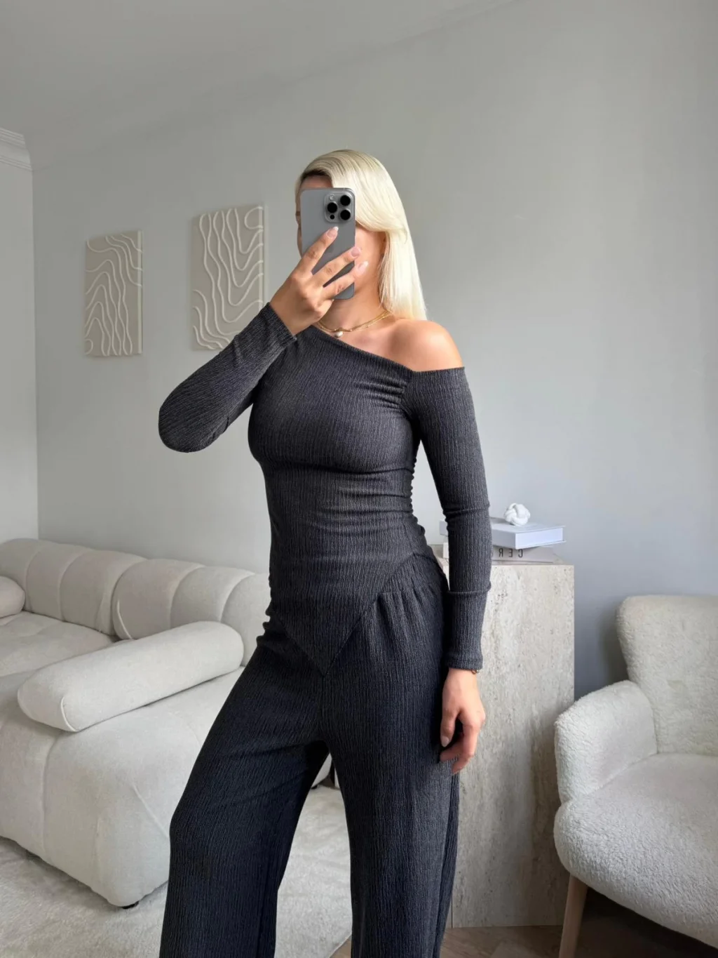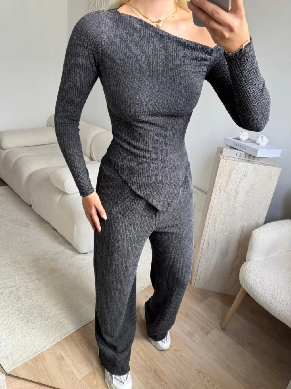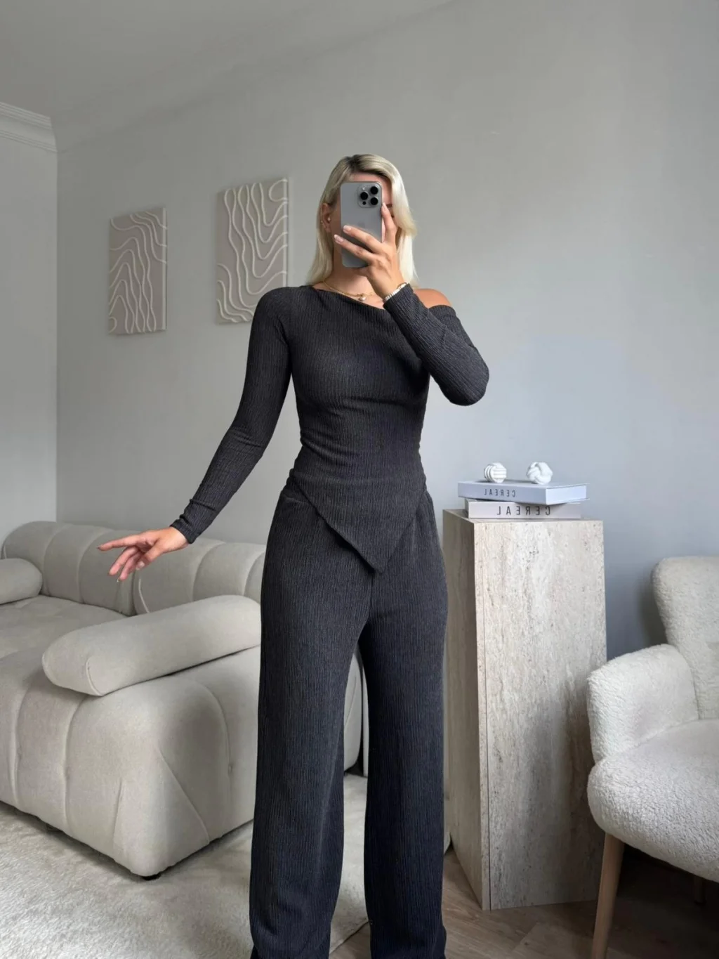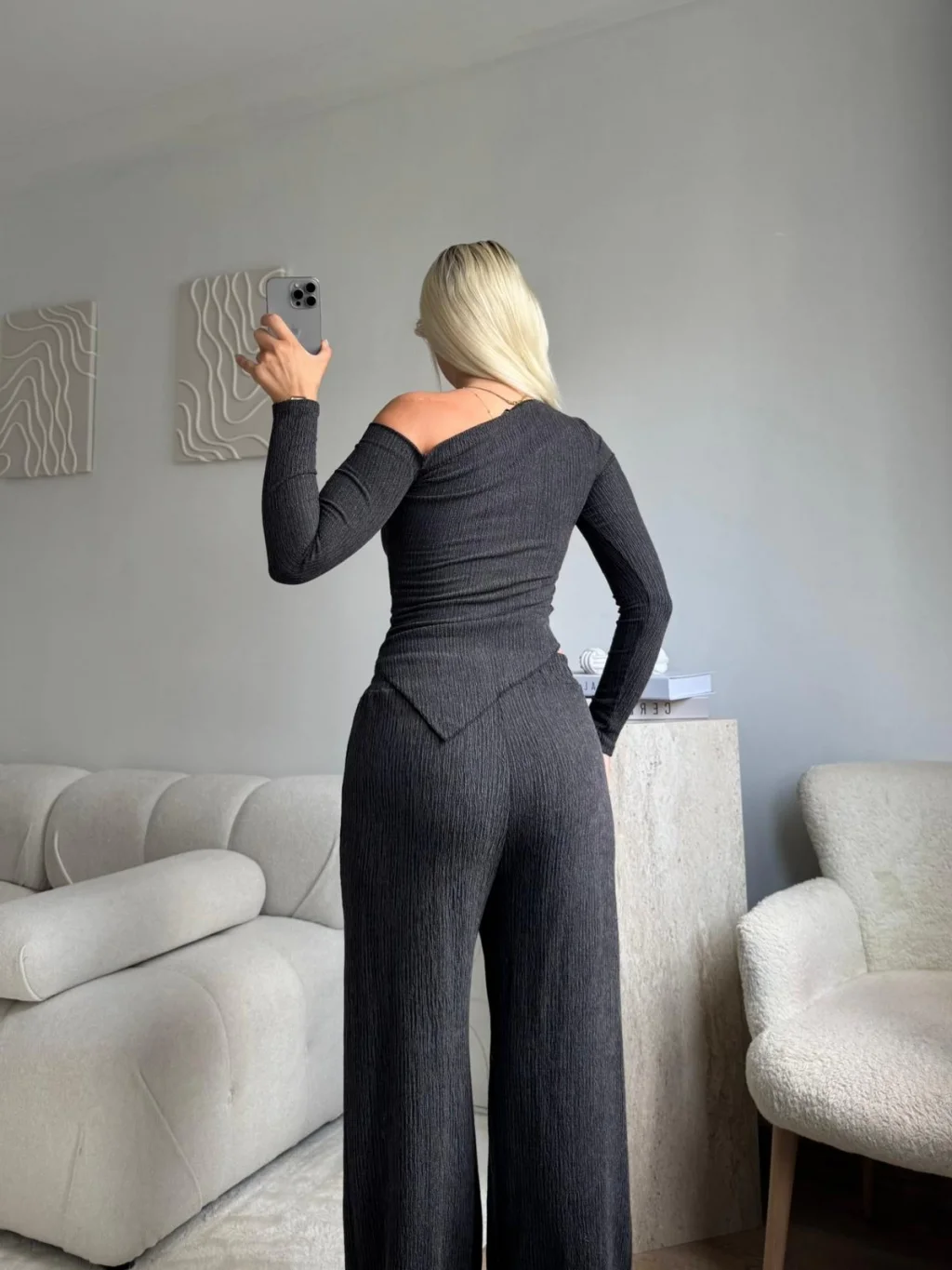 Asimetrik Bluz & Pantolon Takım - FÜME