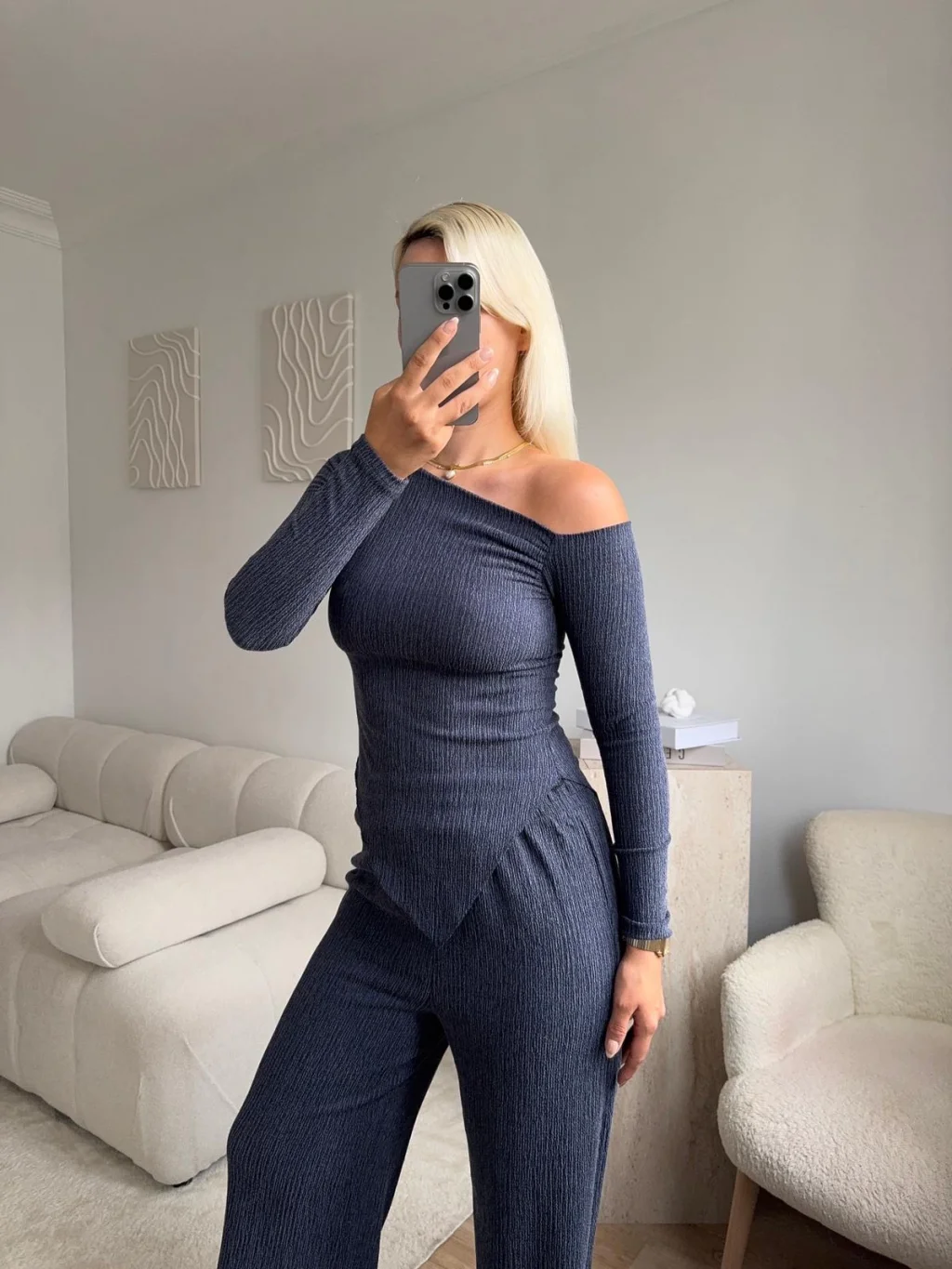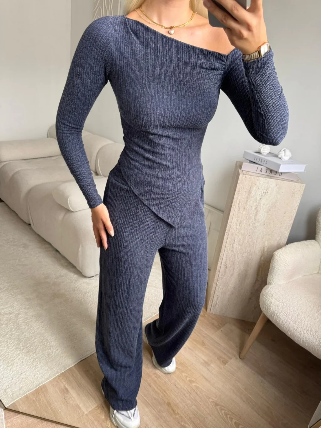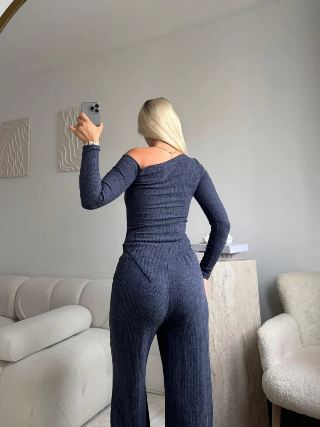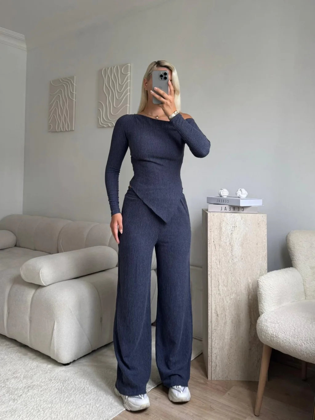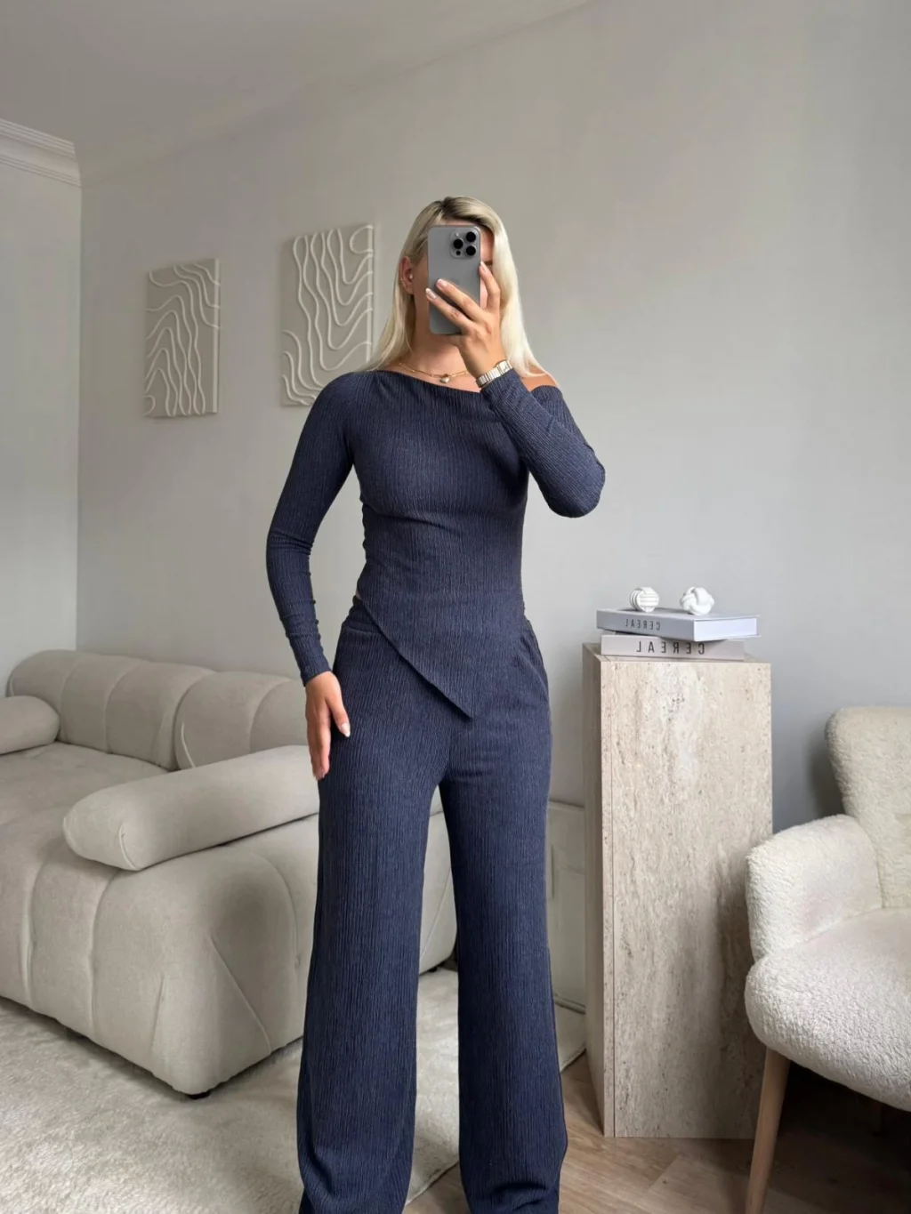 Asimetrik Bluz & Pantolon Takım - LACİVERT