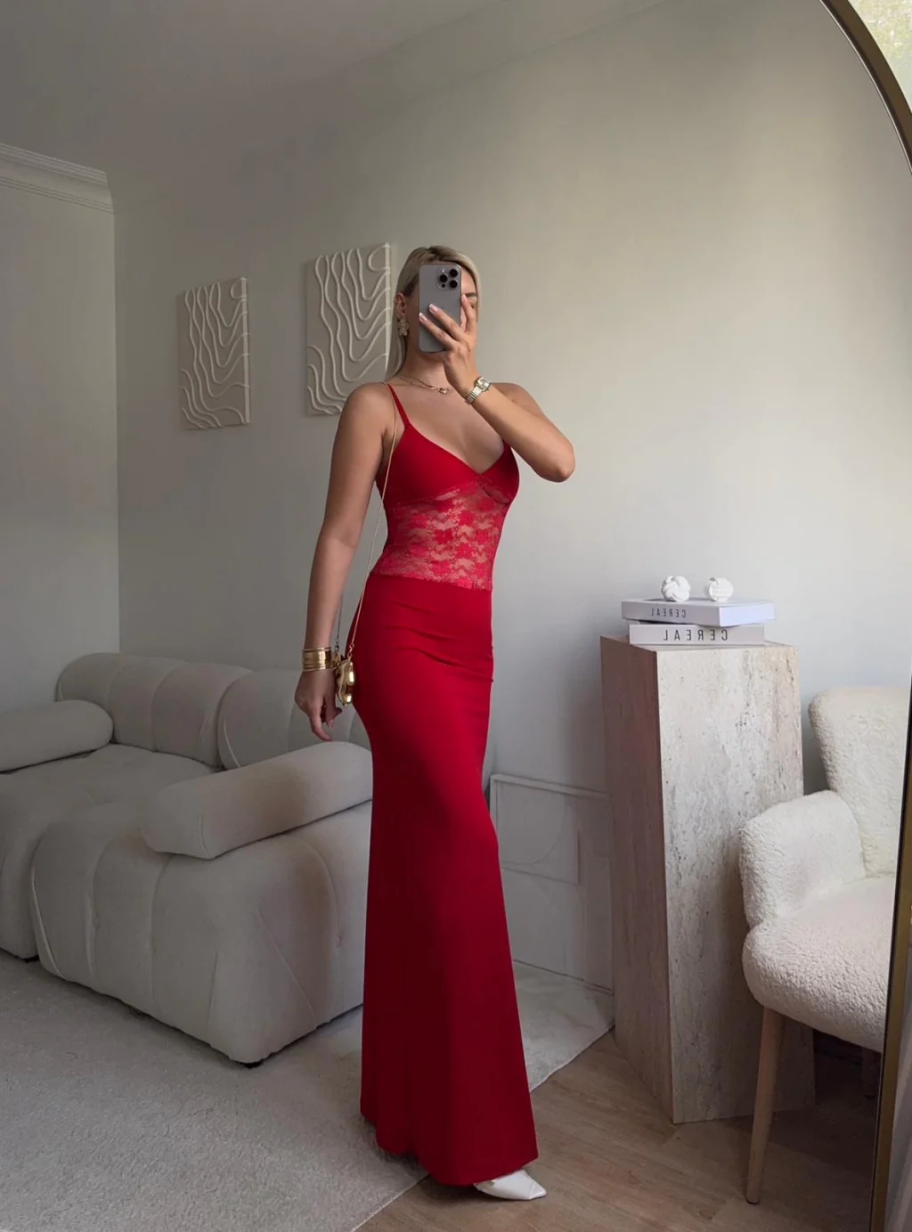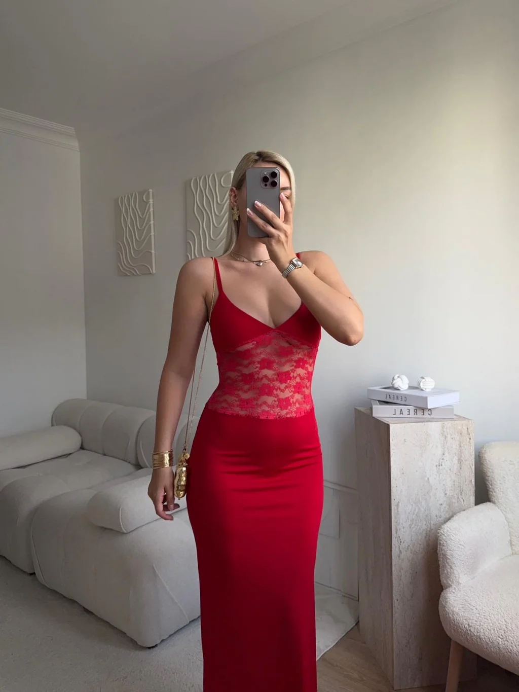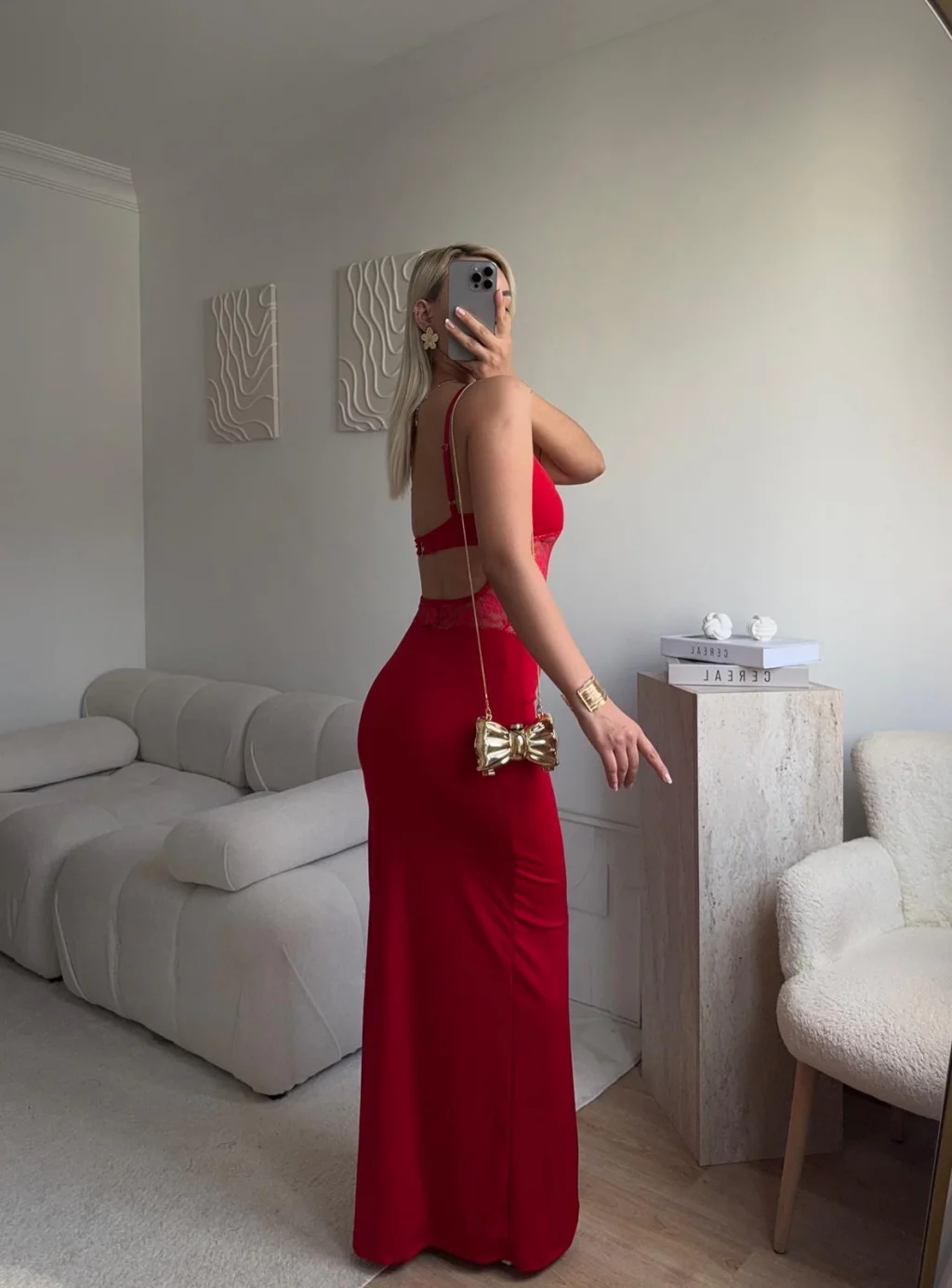 Askılı Dantel Bel Korse Uzun Elbise - KIRMIZI