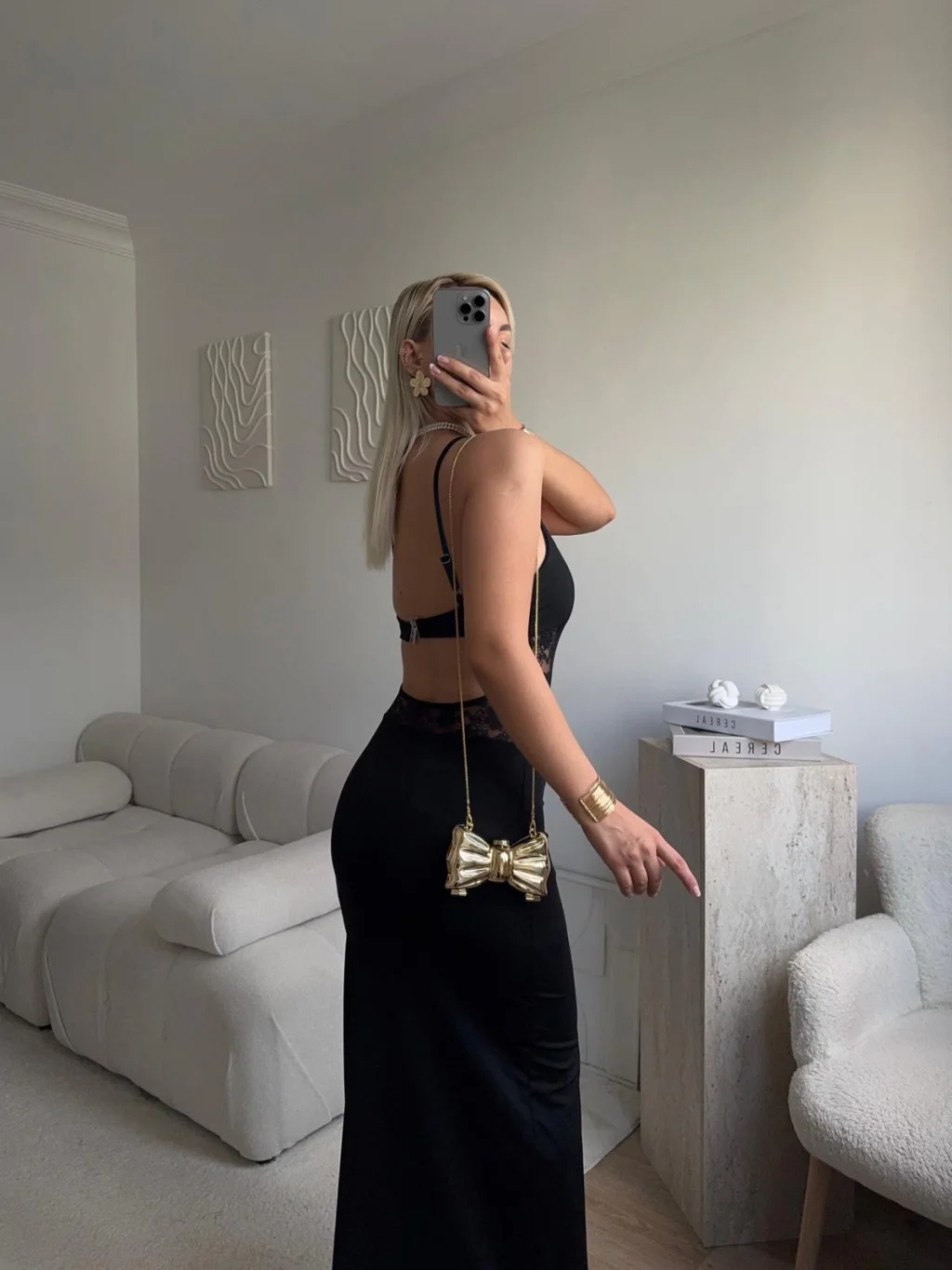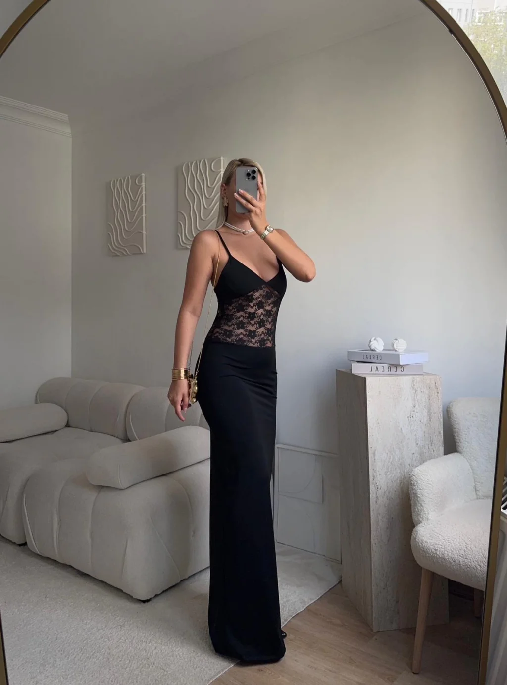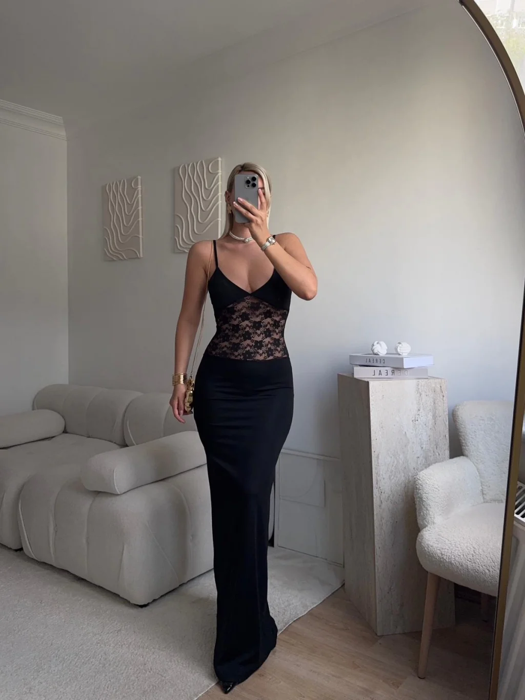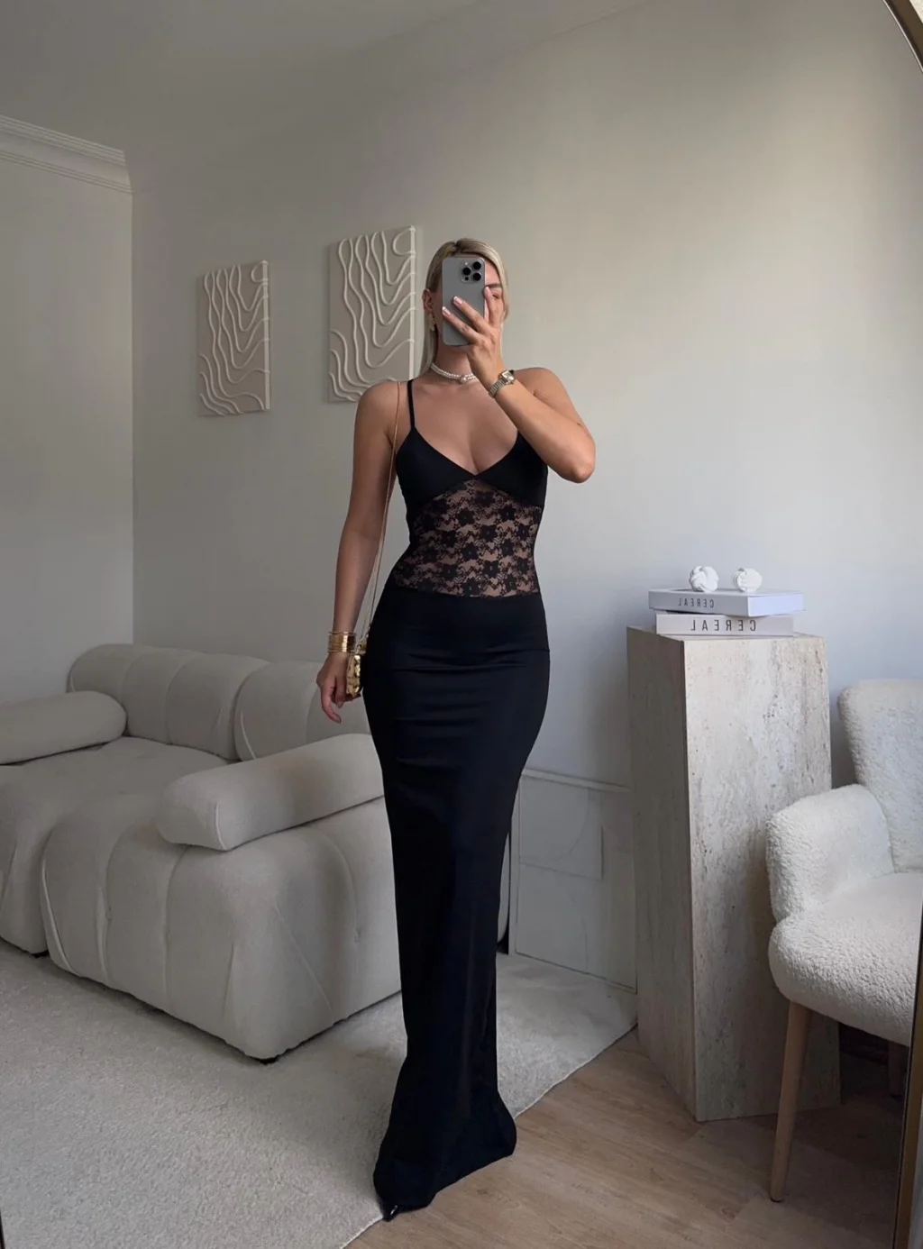 Askılı Dantel Bel Korse Uzun Elbise - SİYAH