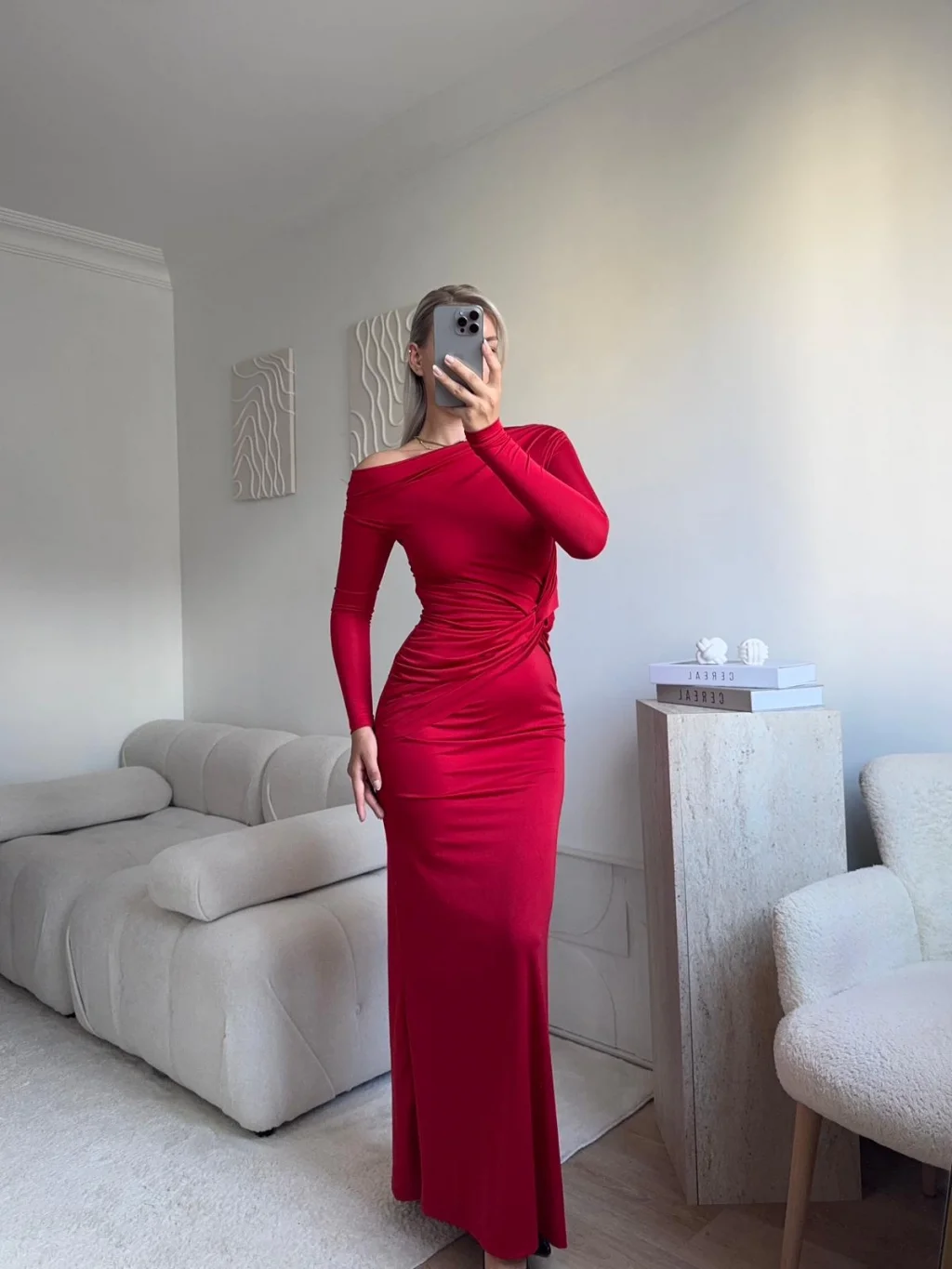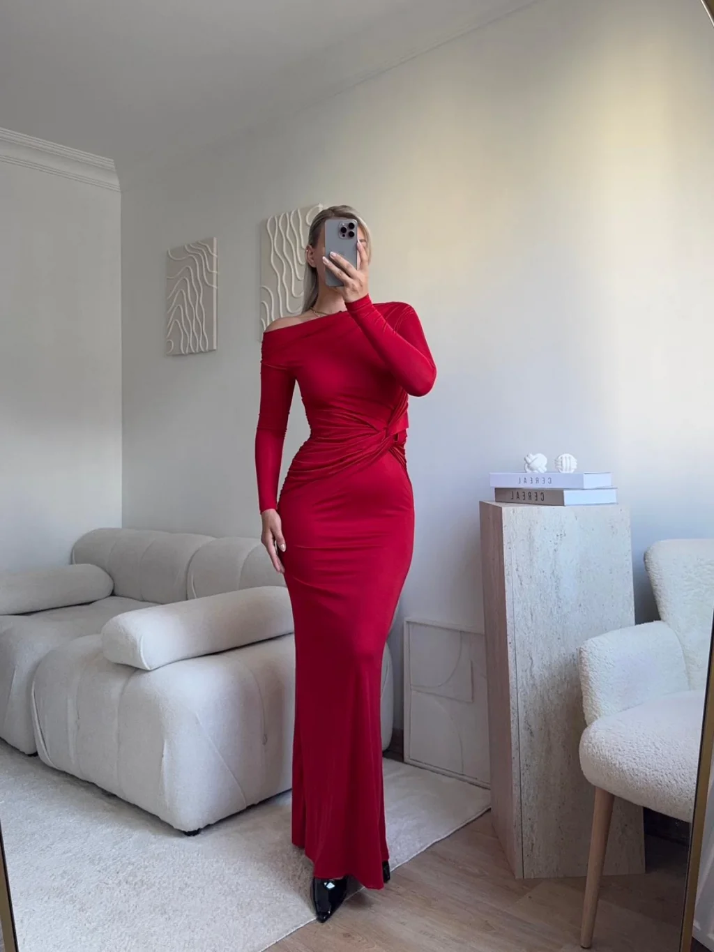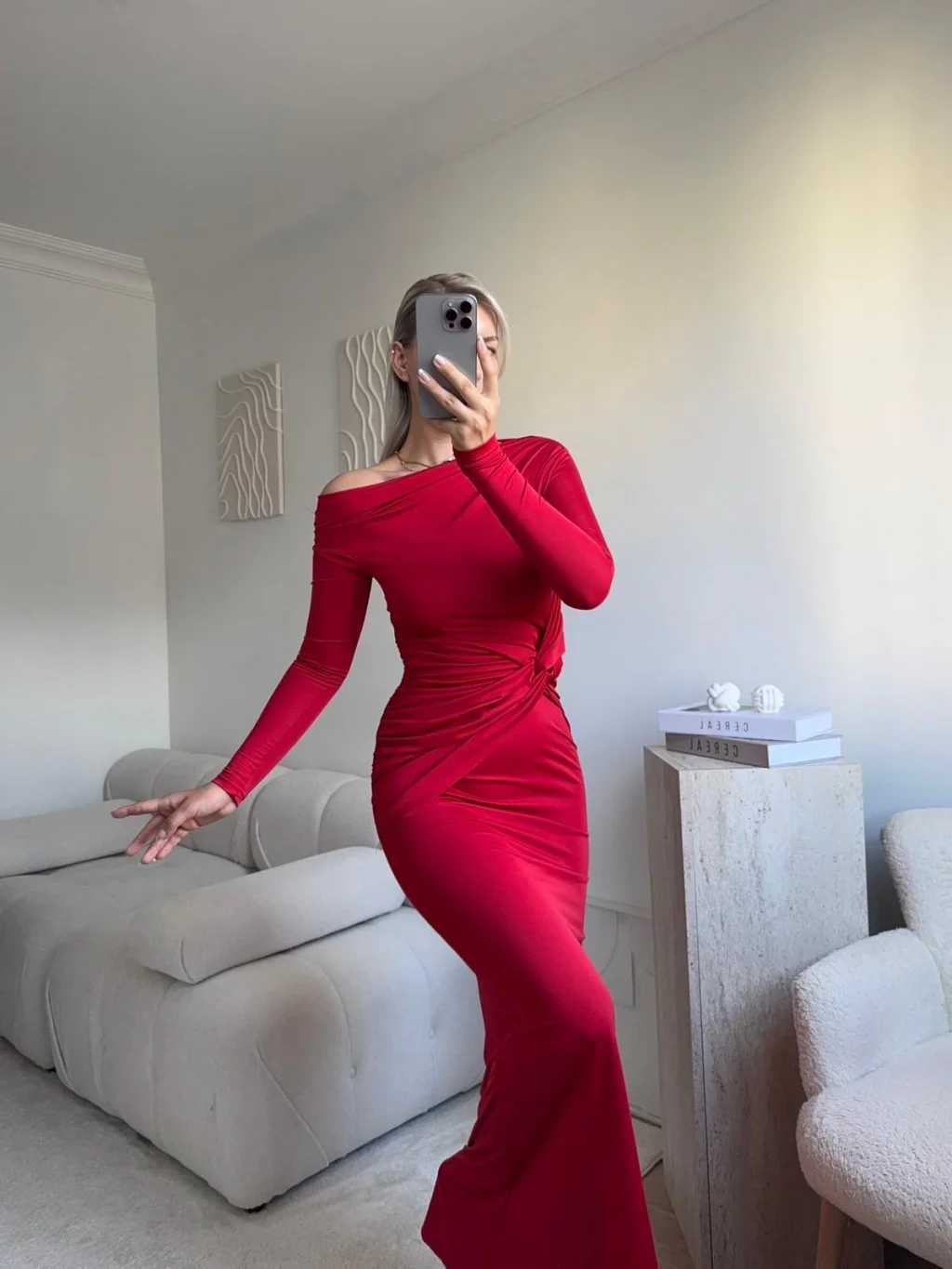 Bel Kruvaze Kayık Yaka Elbise - KIRMIZI