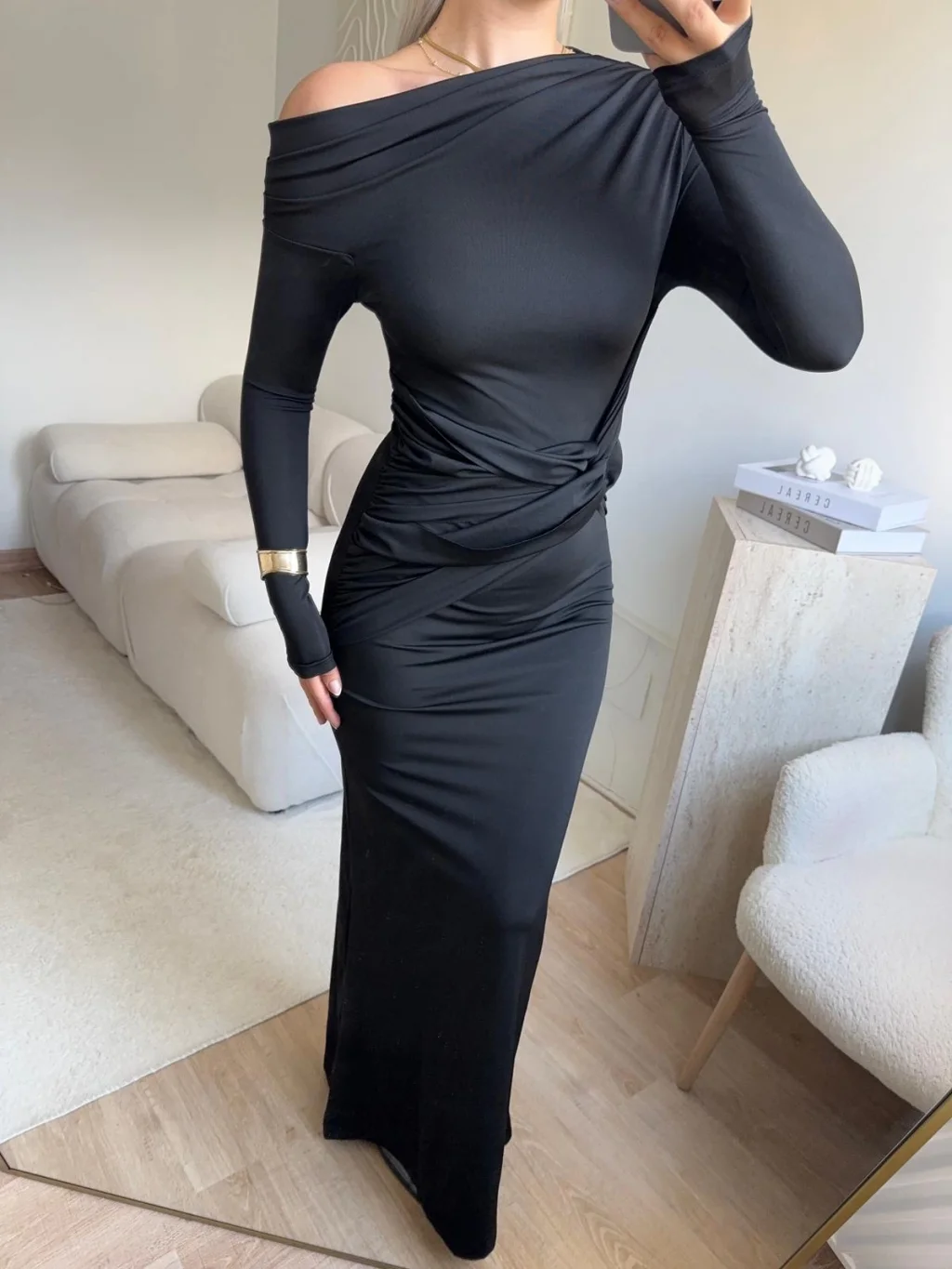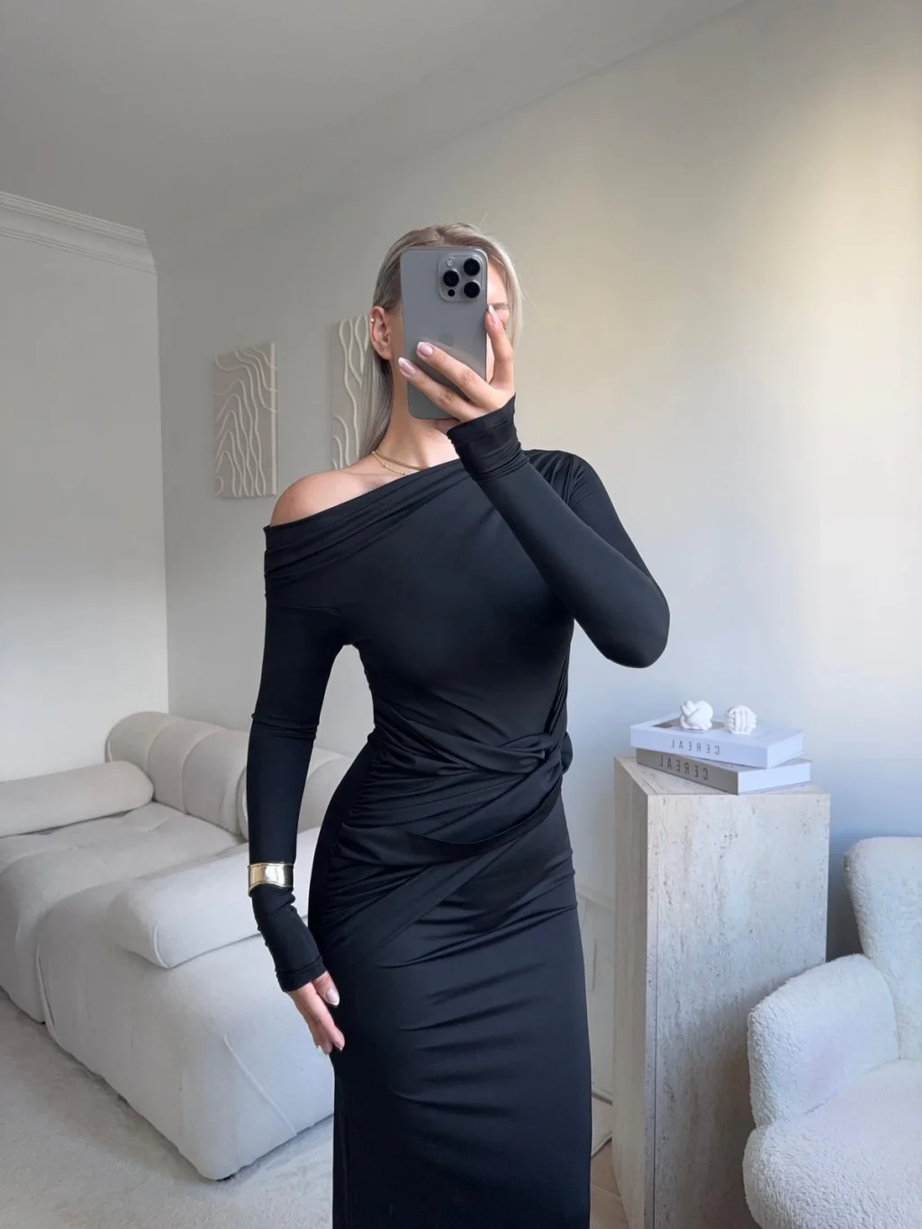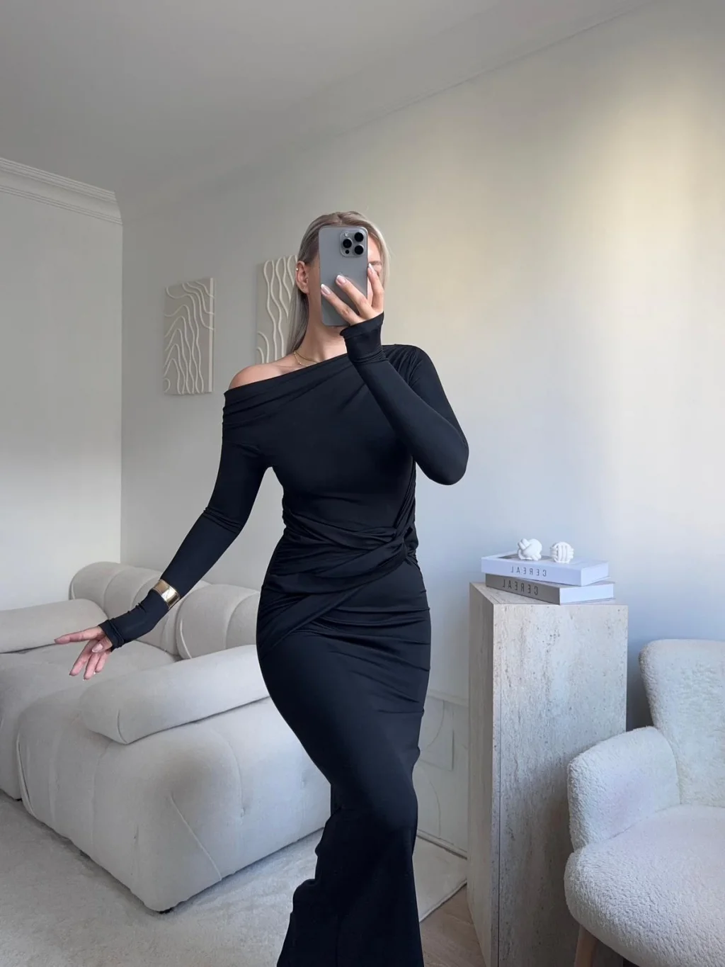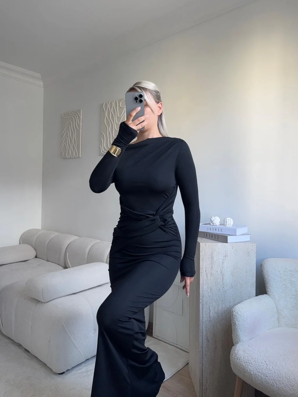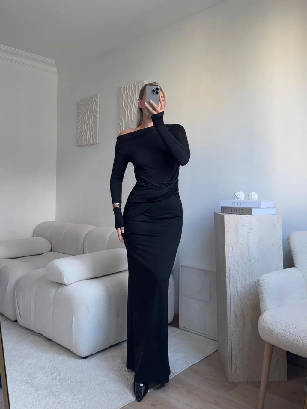 Bel Kruvaze Kayık Yaka Elbise - SİYAH