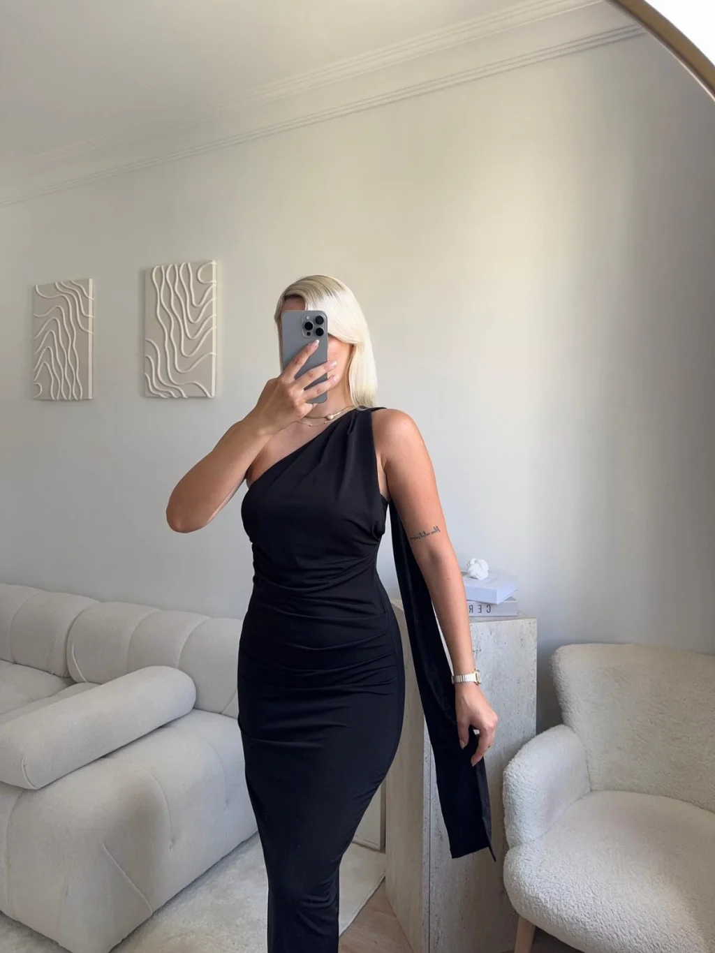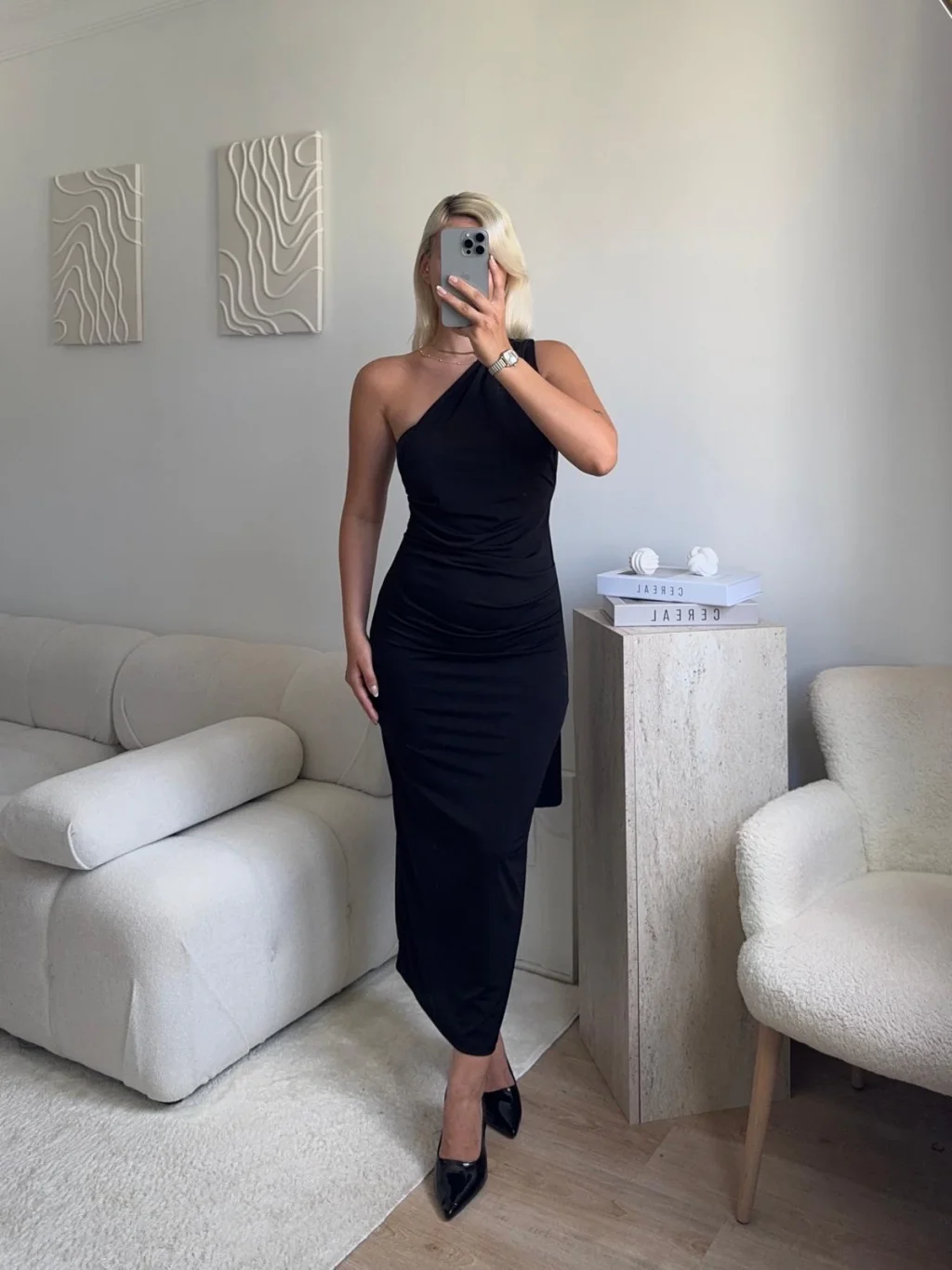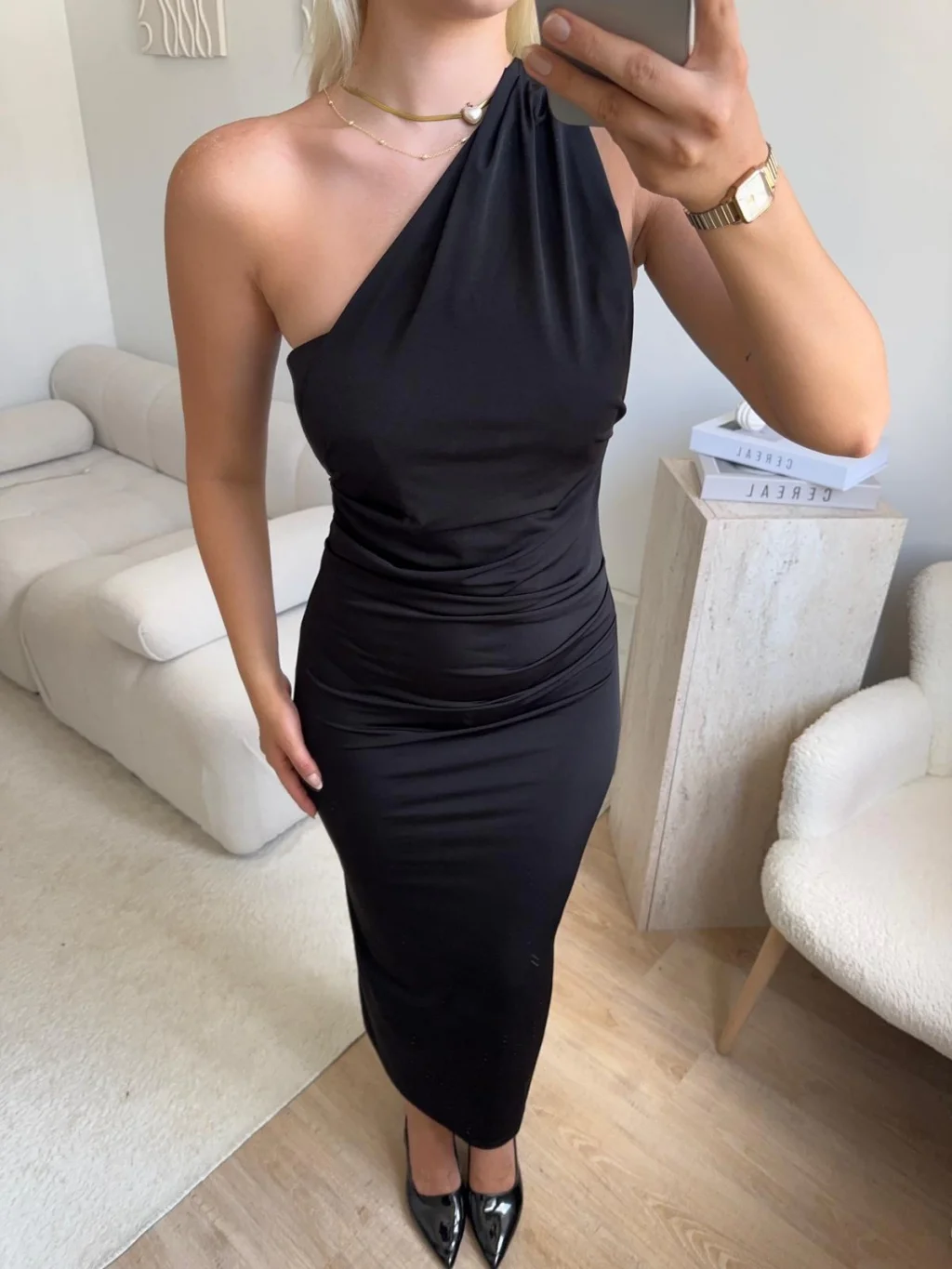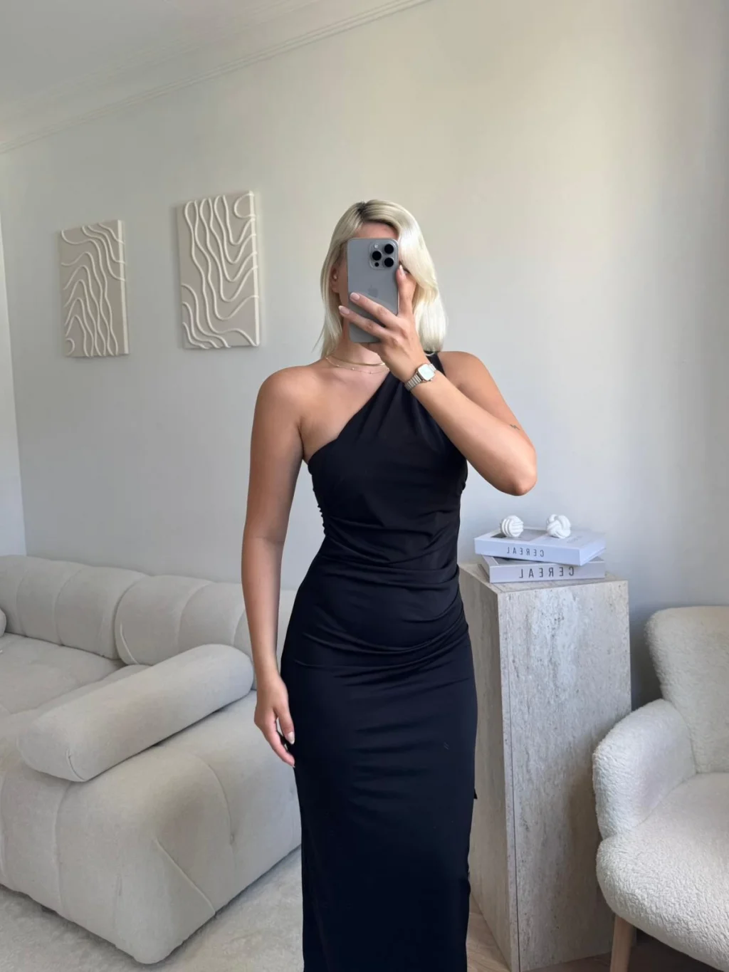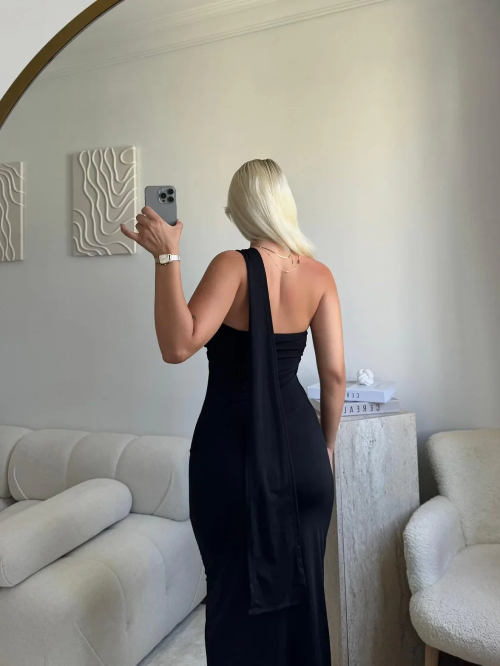 Boyun Bağlamalı Drapeli Elbise - SİYAH
