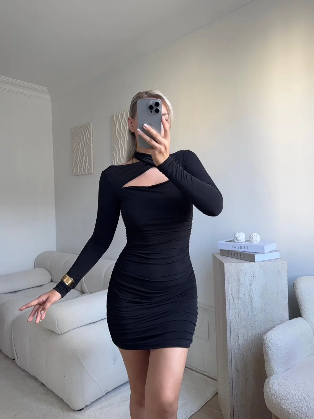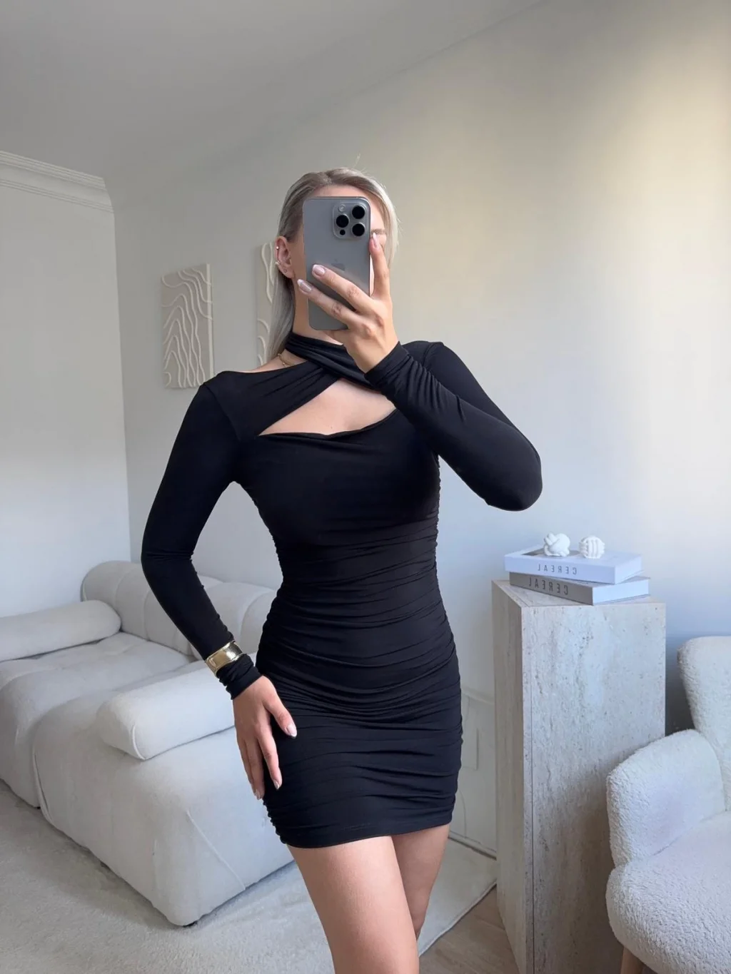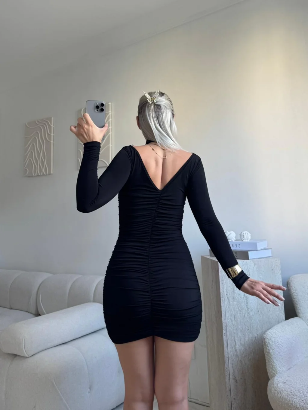 Boyun Çapraz Yan Büzgü Elbise - SİYAH