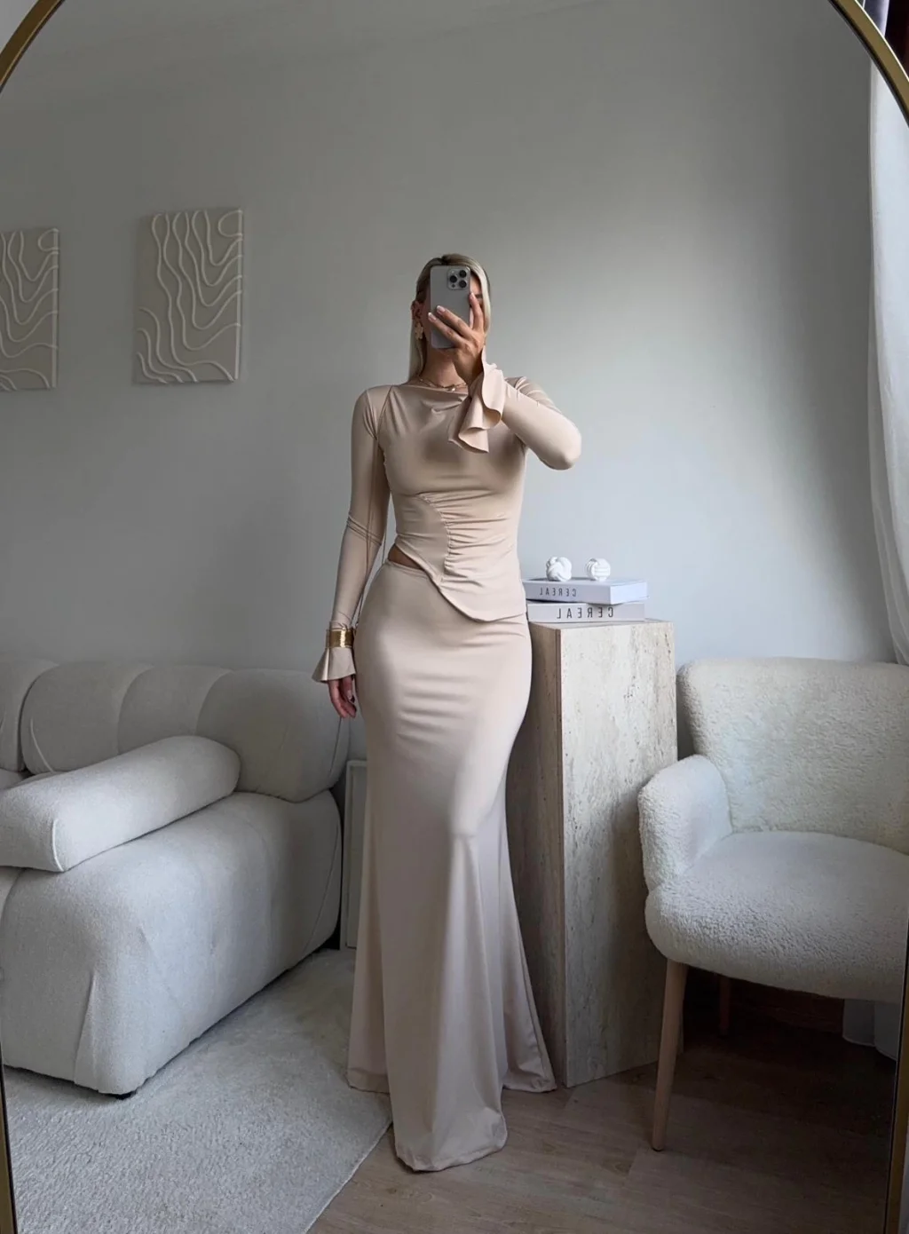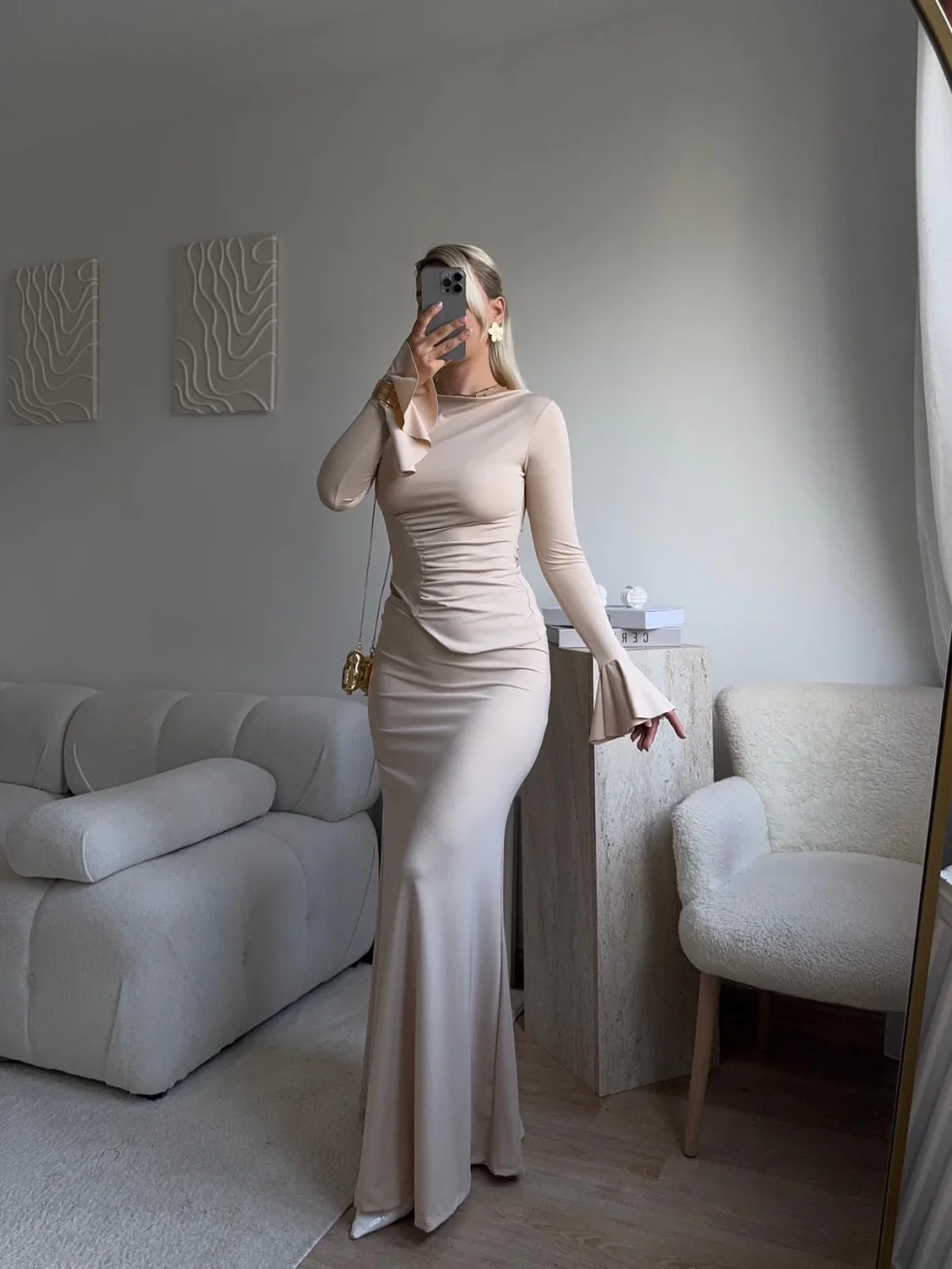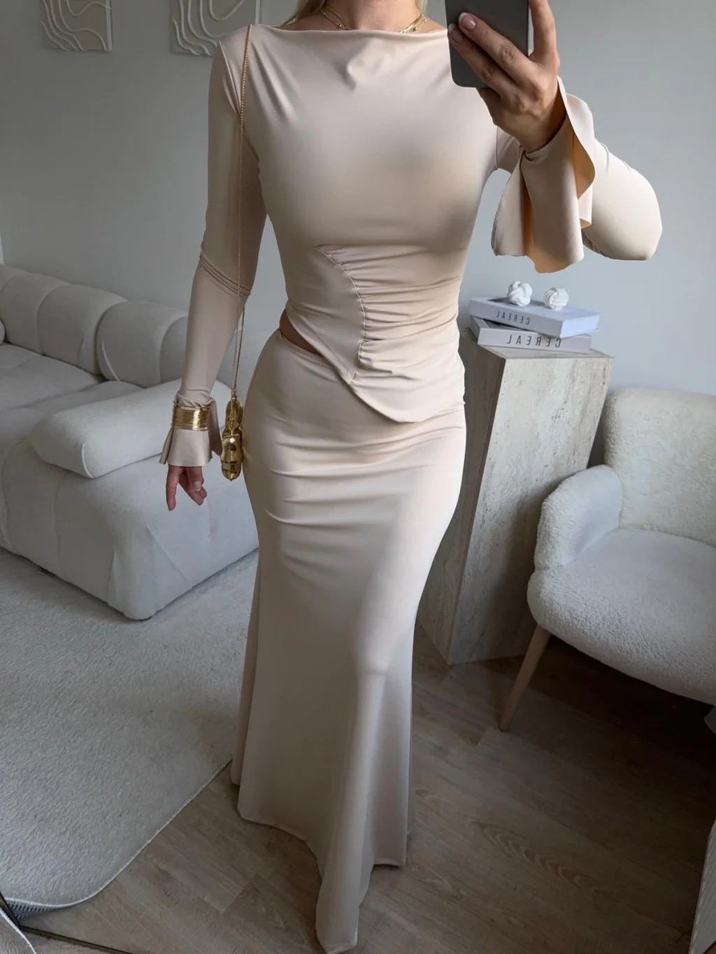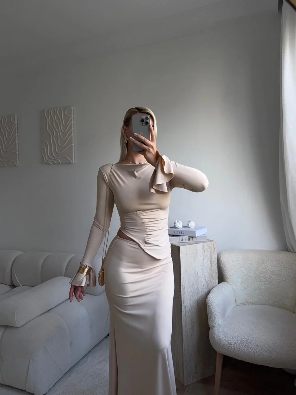 Büzgü Detay Fırfırlı İkili Takım - BEJ