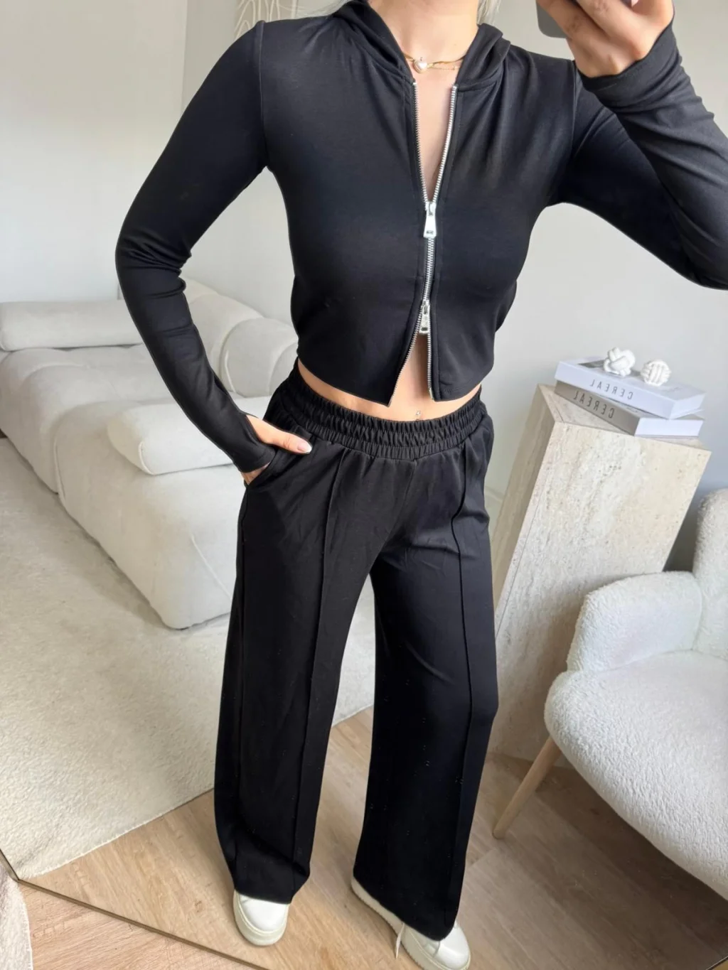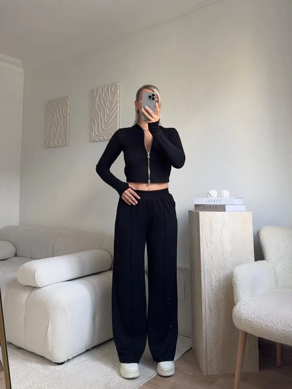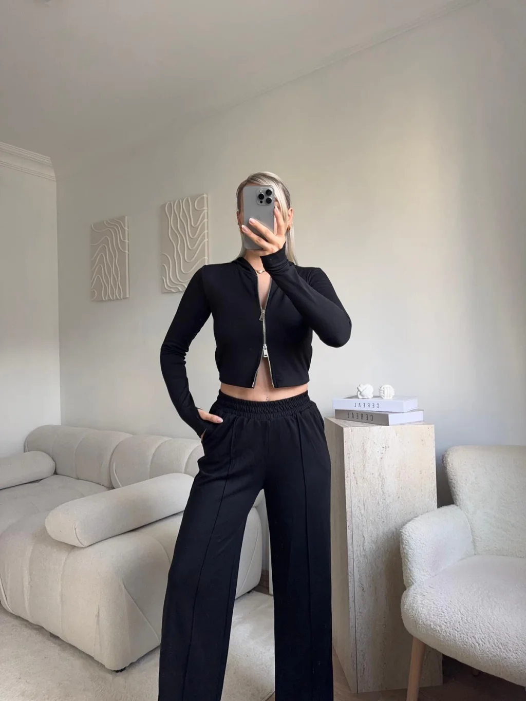 Modal Fermuar Crop & Pantolon Takım - SİYAH