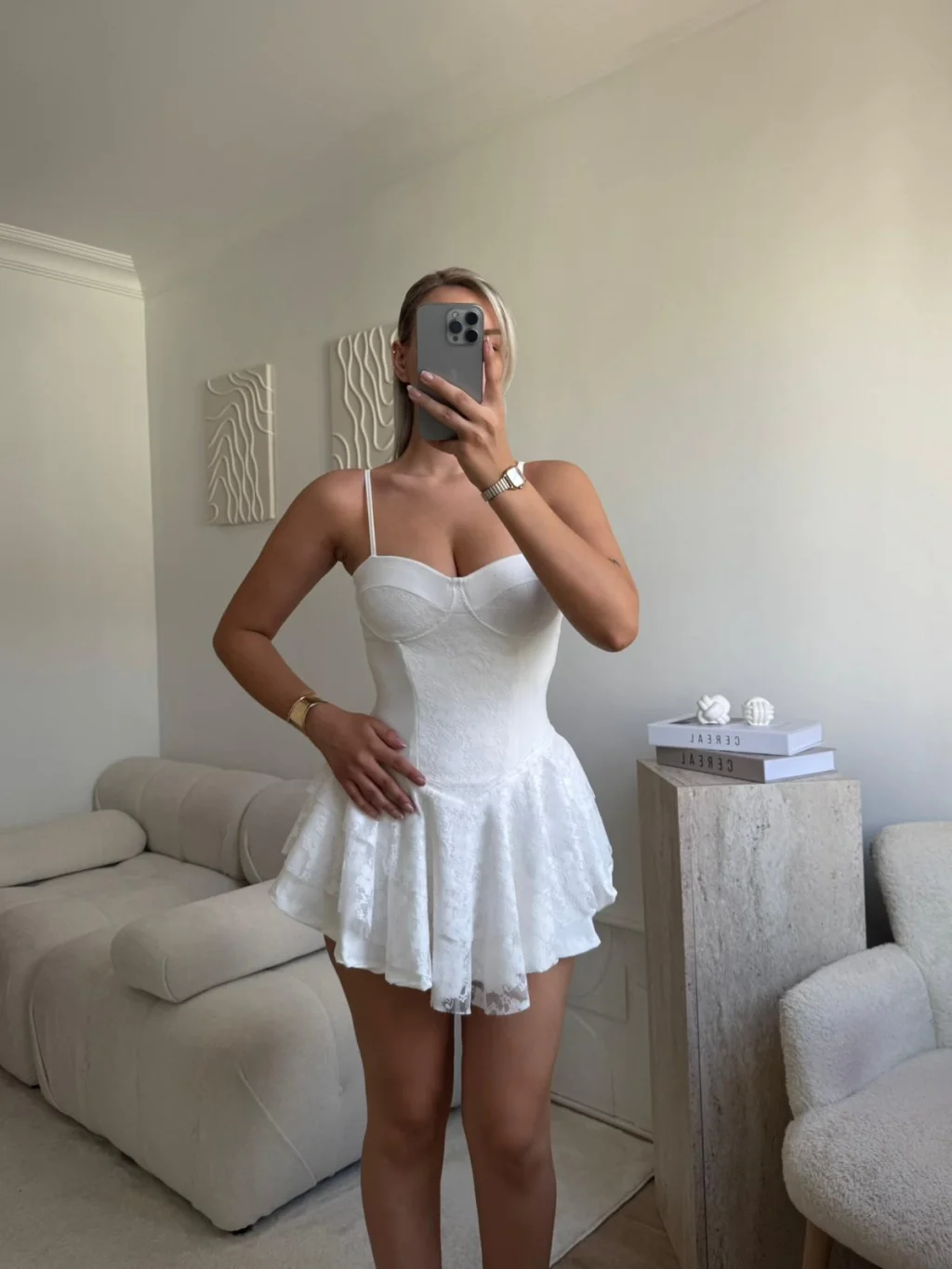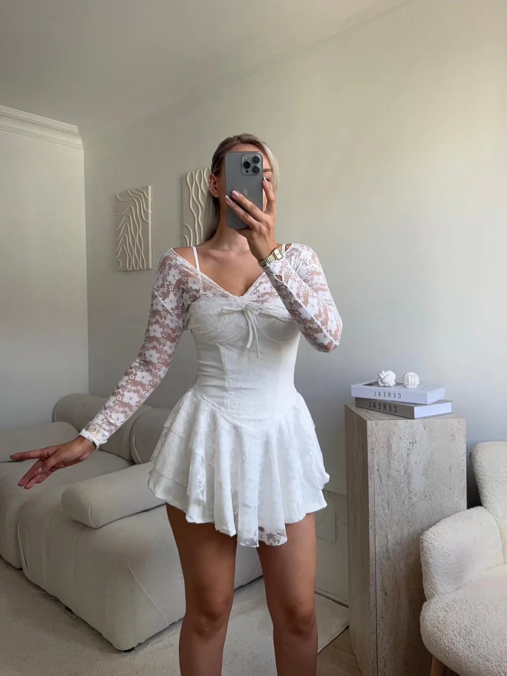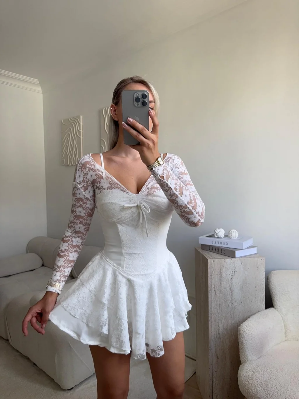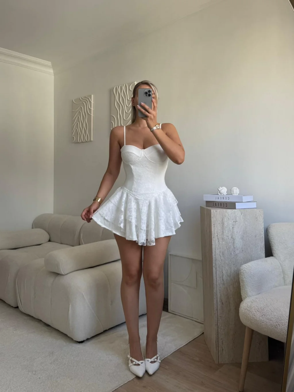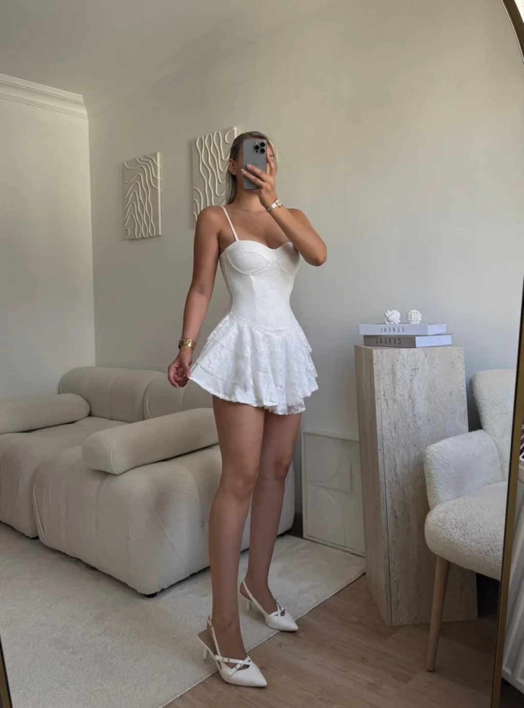 Dantel Kol Ön Büzgülü Elbise - BEYAZ