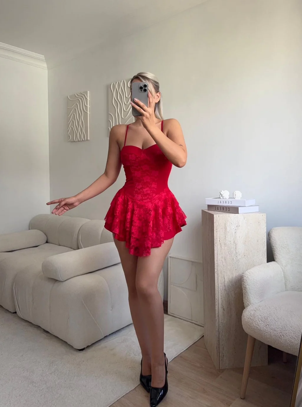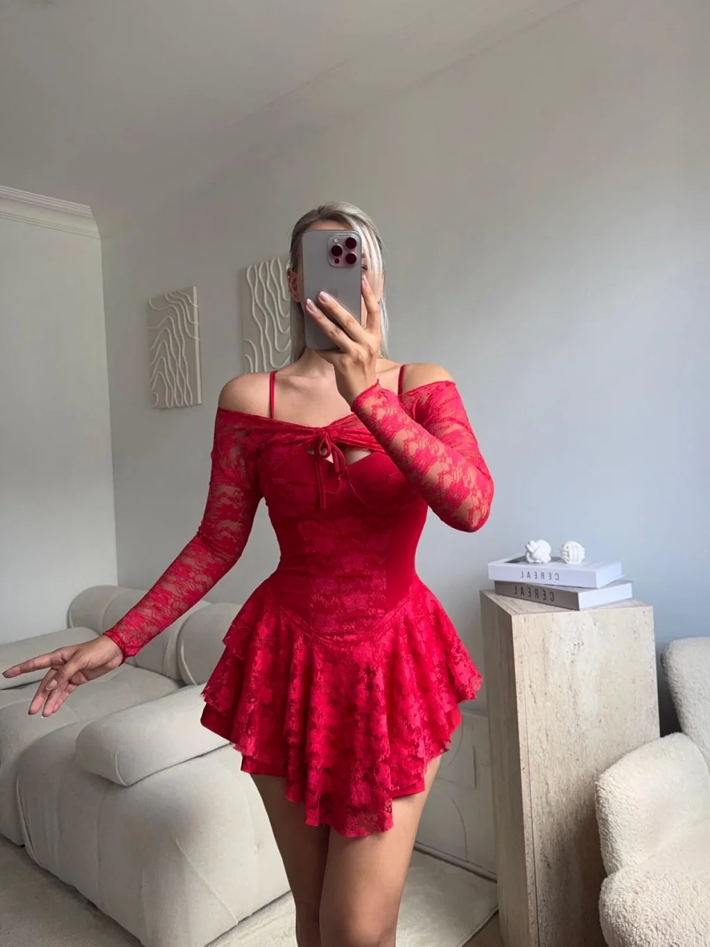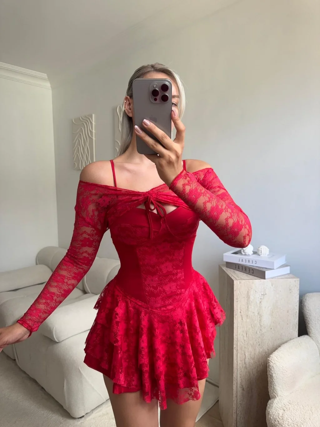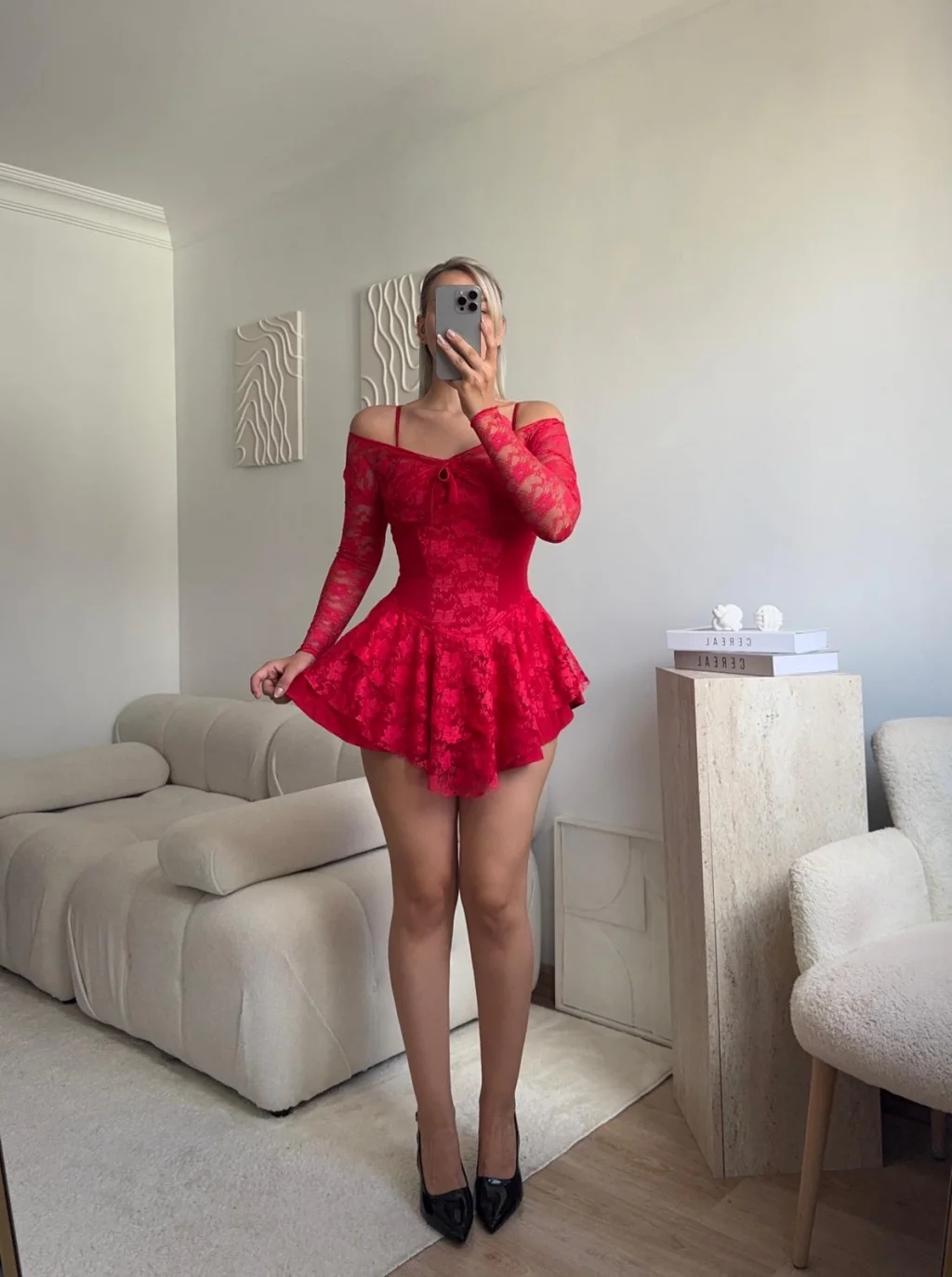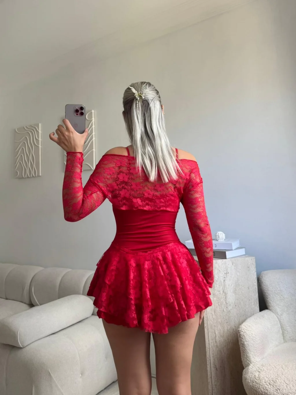 Dantel Kol Ön Büzgülü Elbise - KIRMIZI