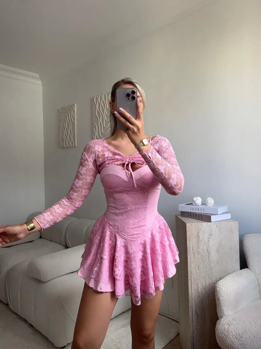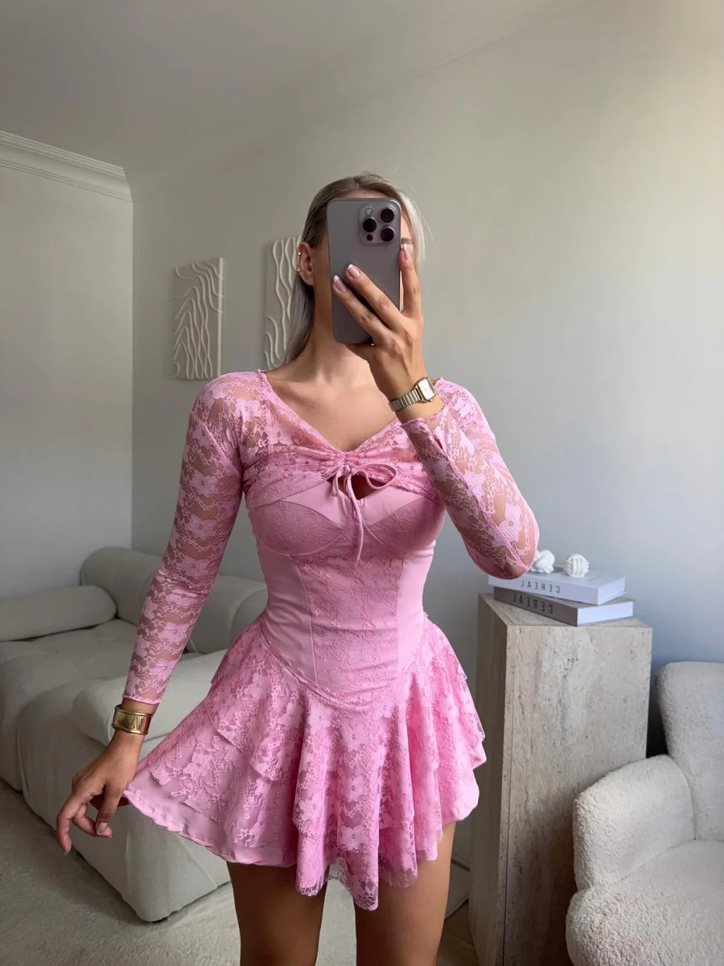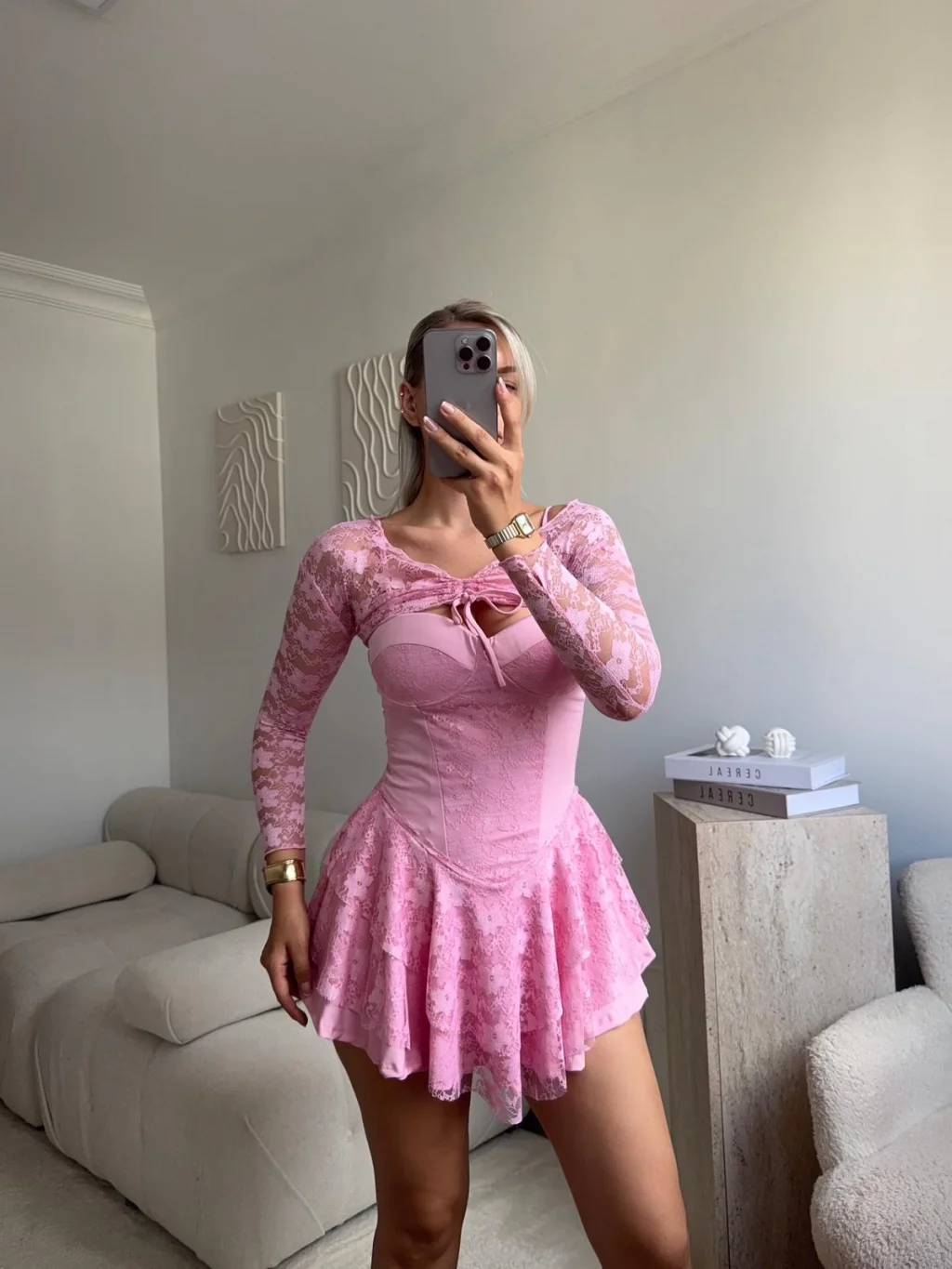 Dantel Kol Ön Büzgülü Elbise - PUDRA