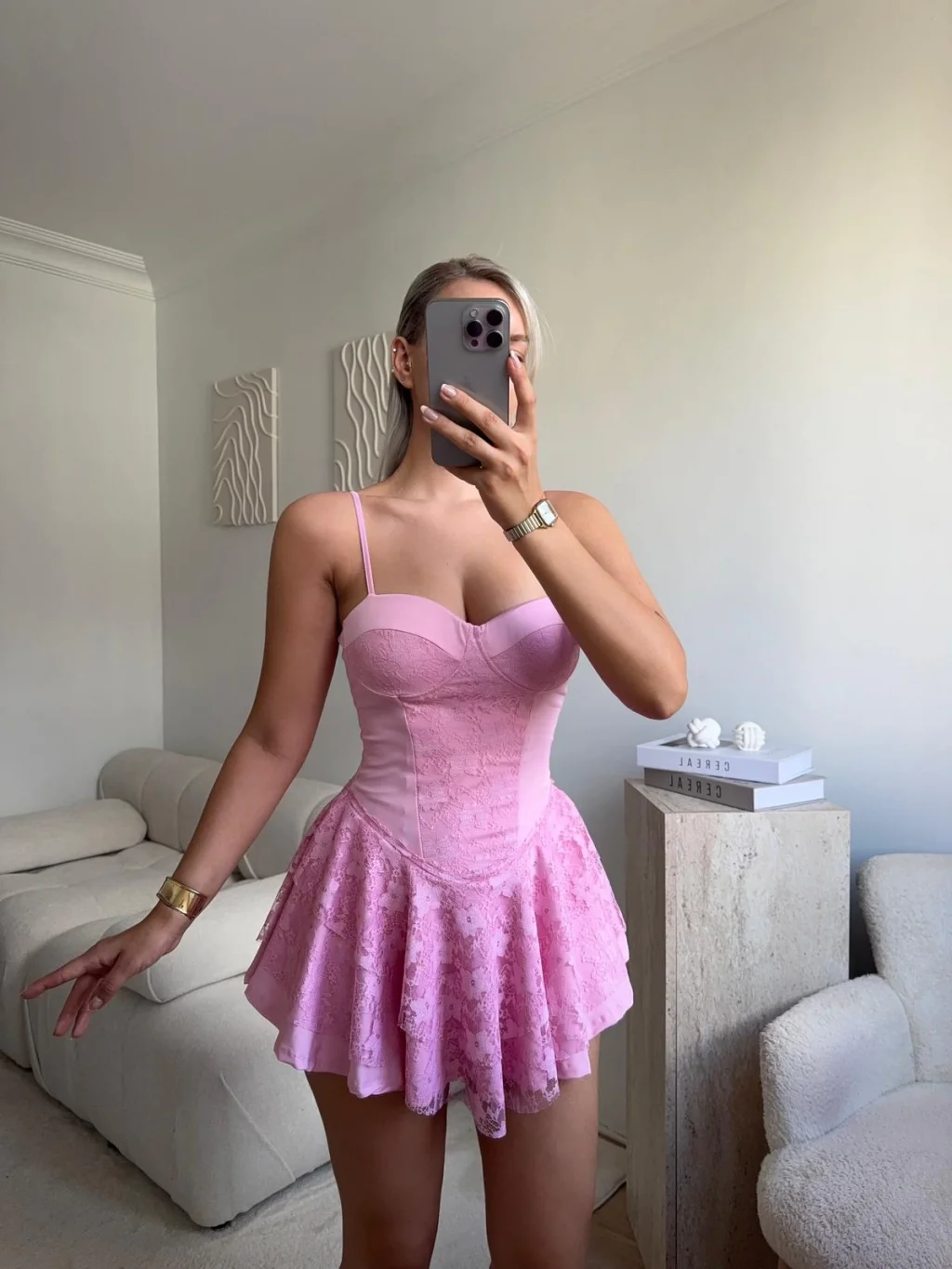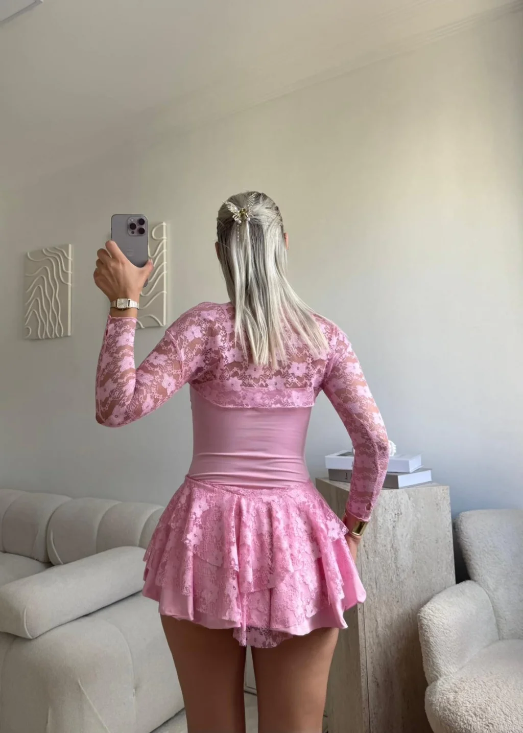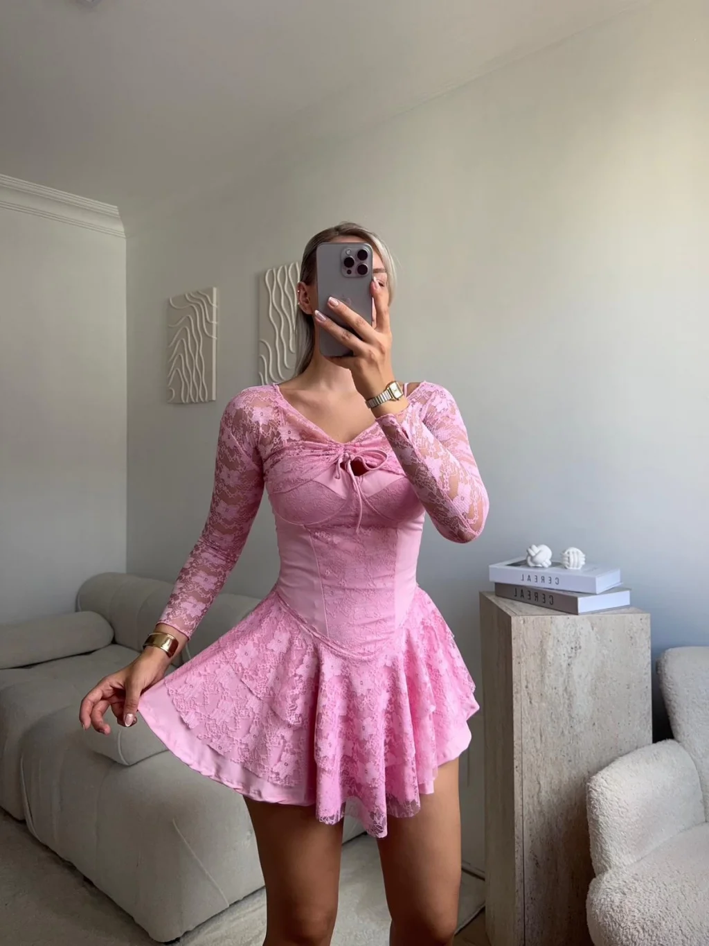 Dantel Kol Ön Büzgülü Elbise - PUDRA