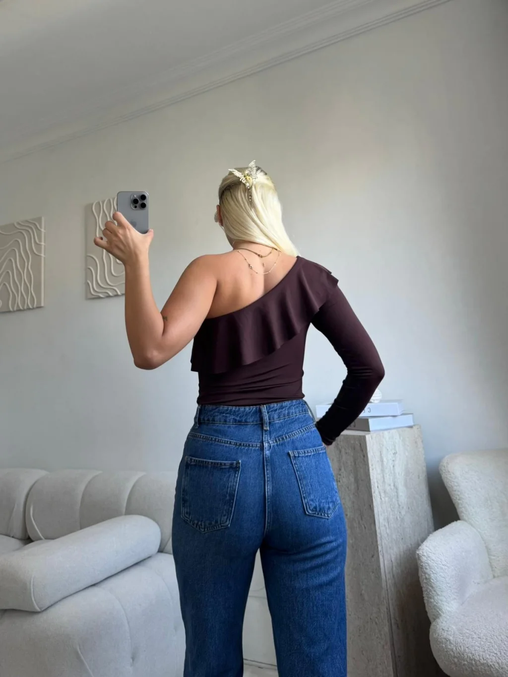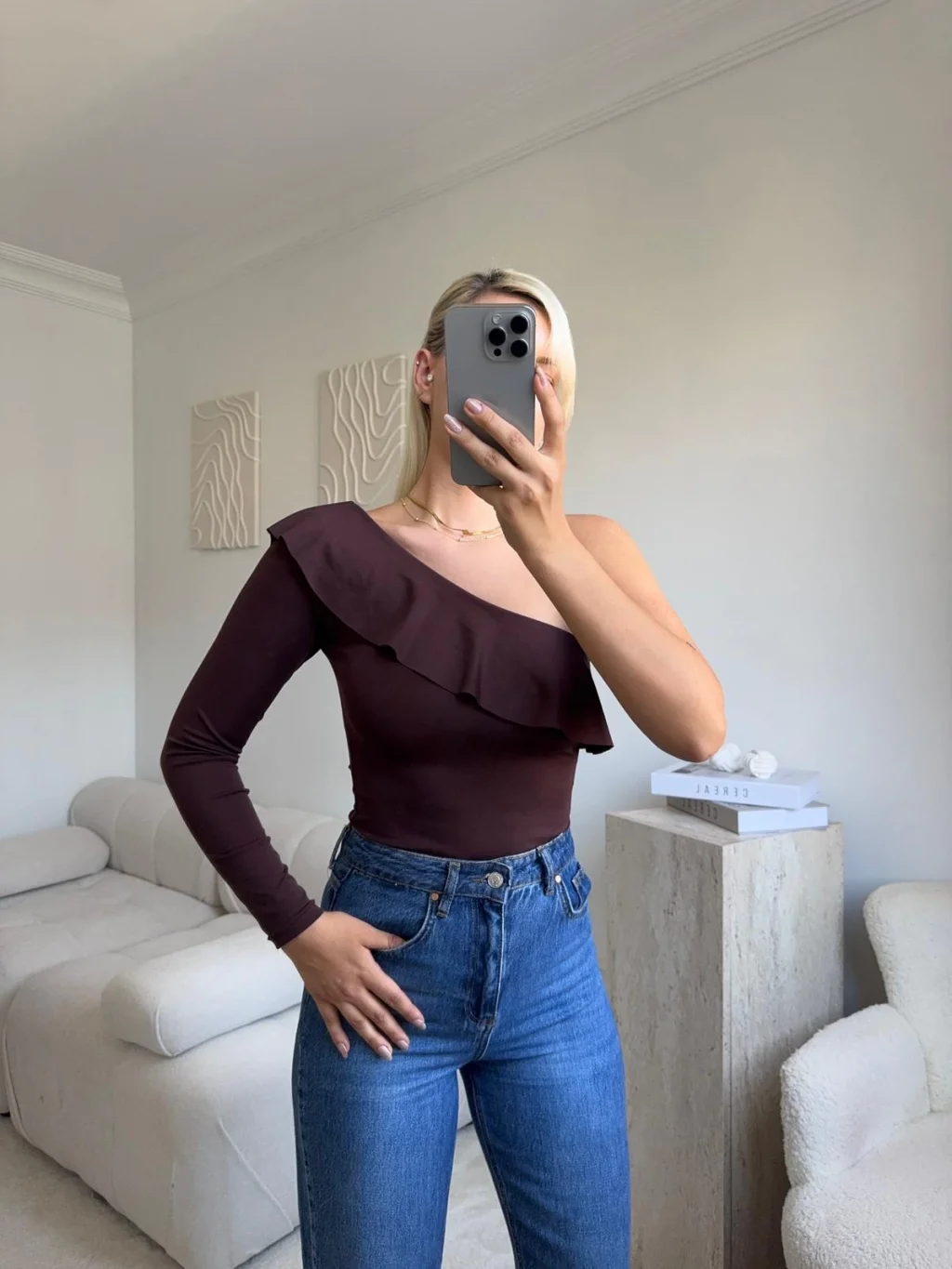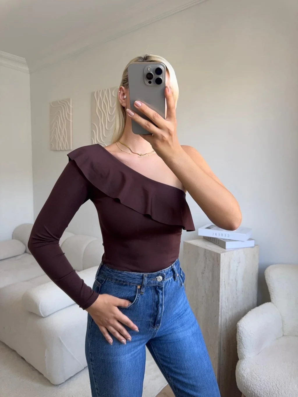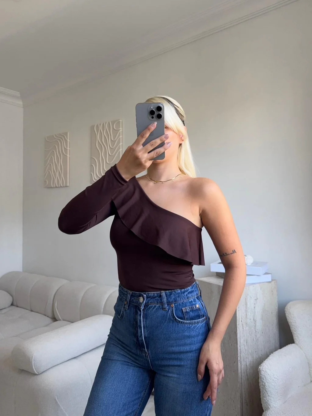 Fırfırlı Tek Omuz Bodysuit - KAHVE