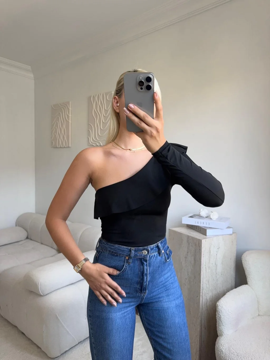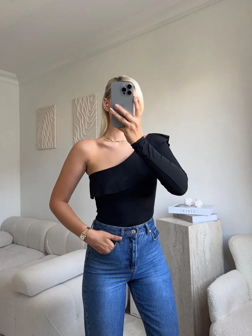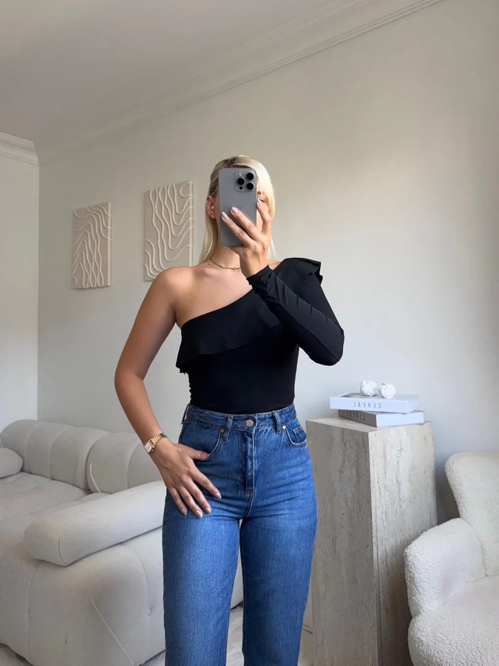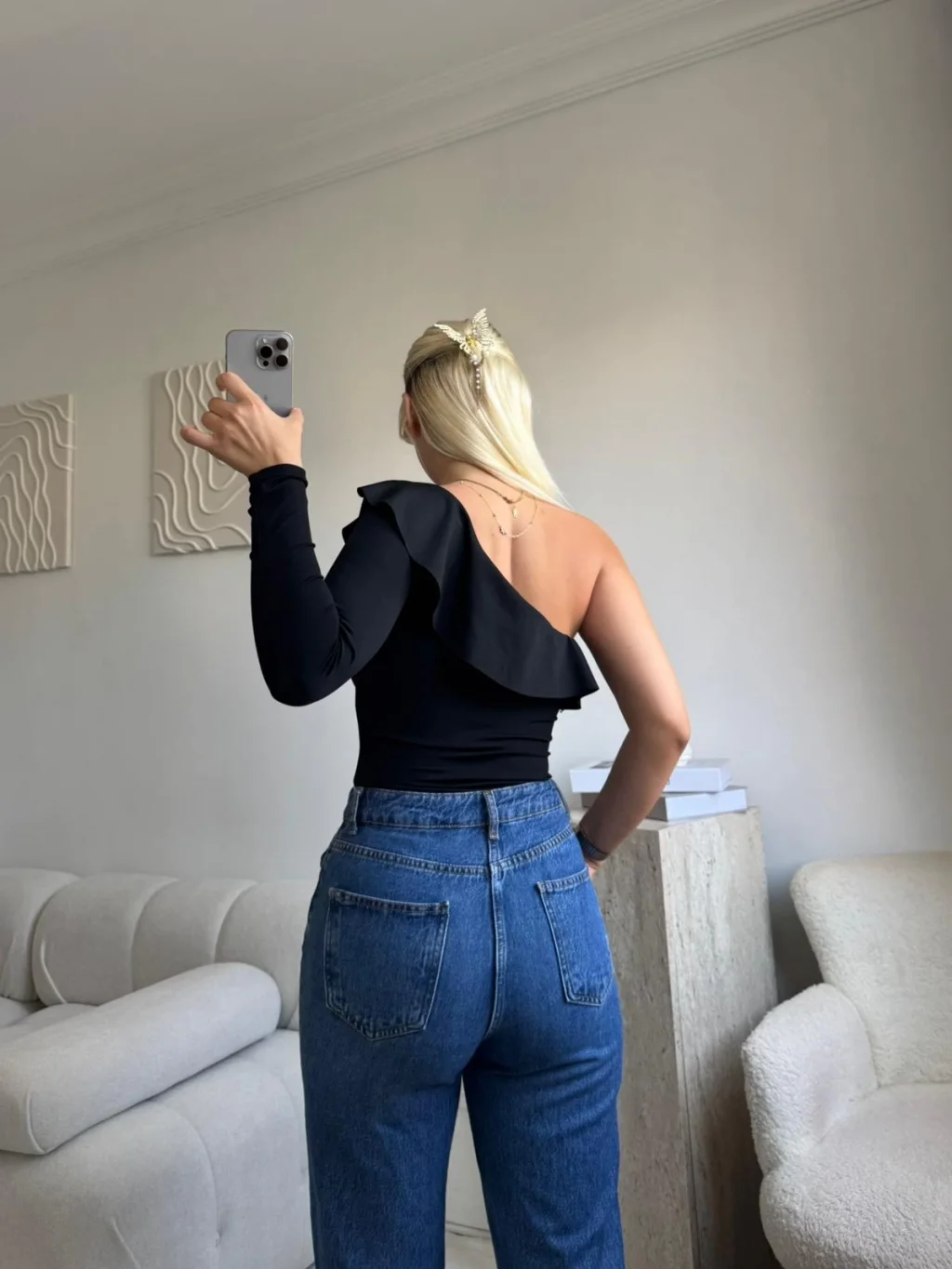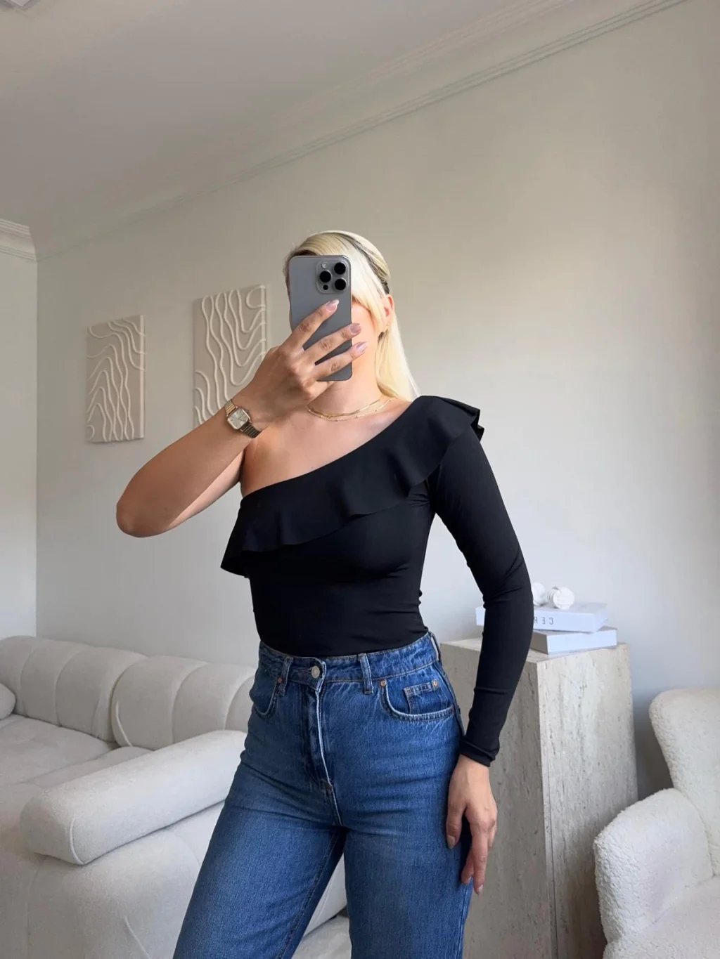 Fırfırlı Tek Omuz Bodysuit - SİYAH