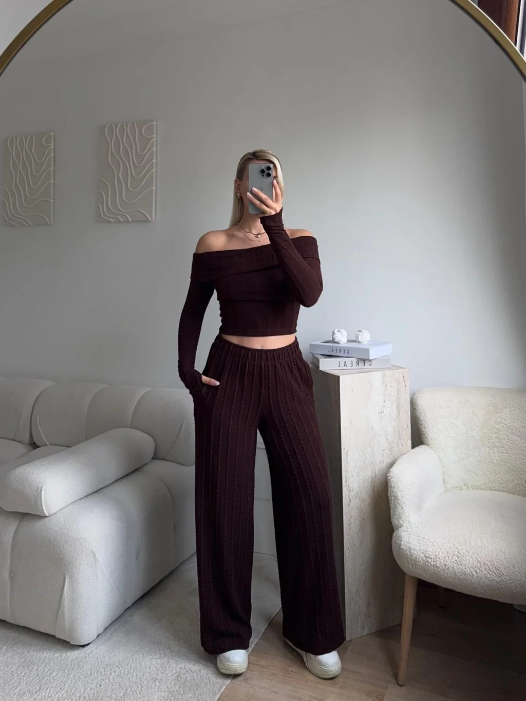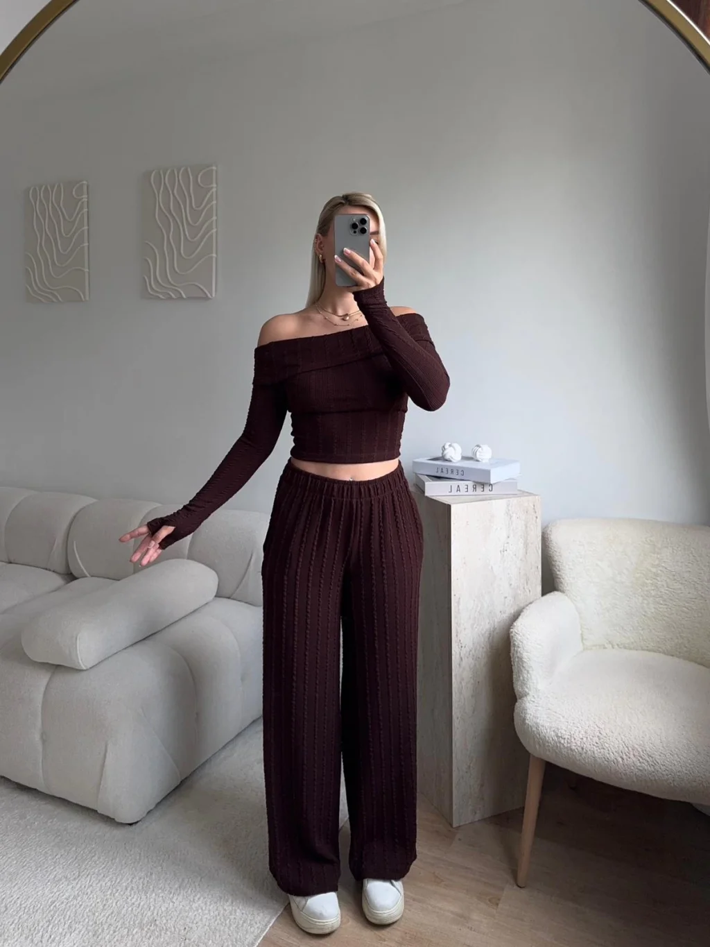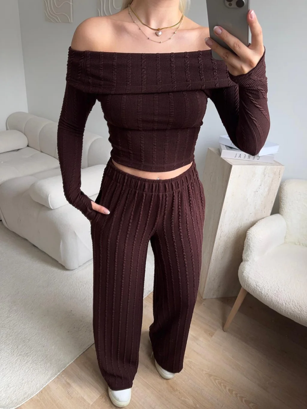 Fitilli Madonna Crop & Pantolon Takım - KAHVE