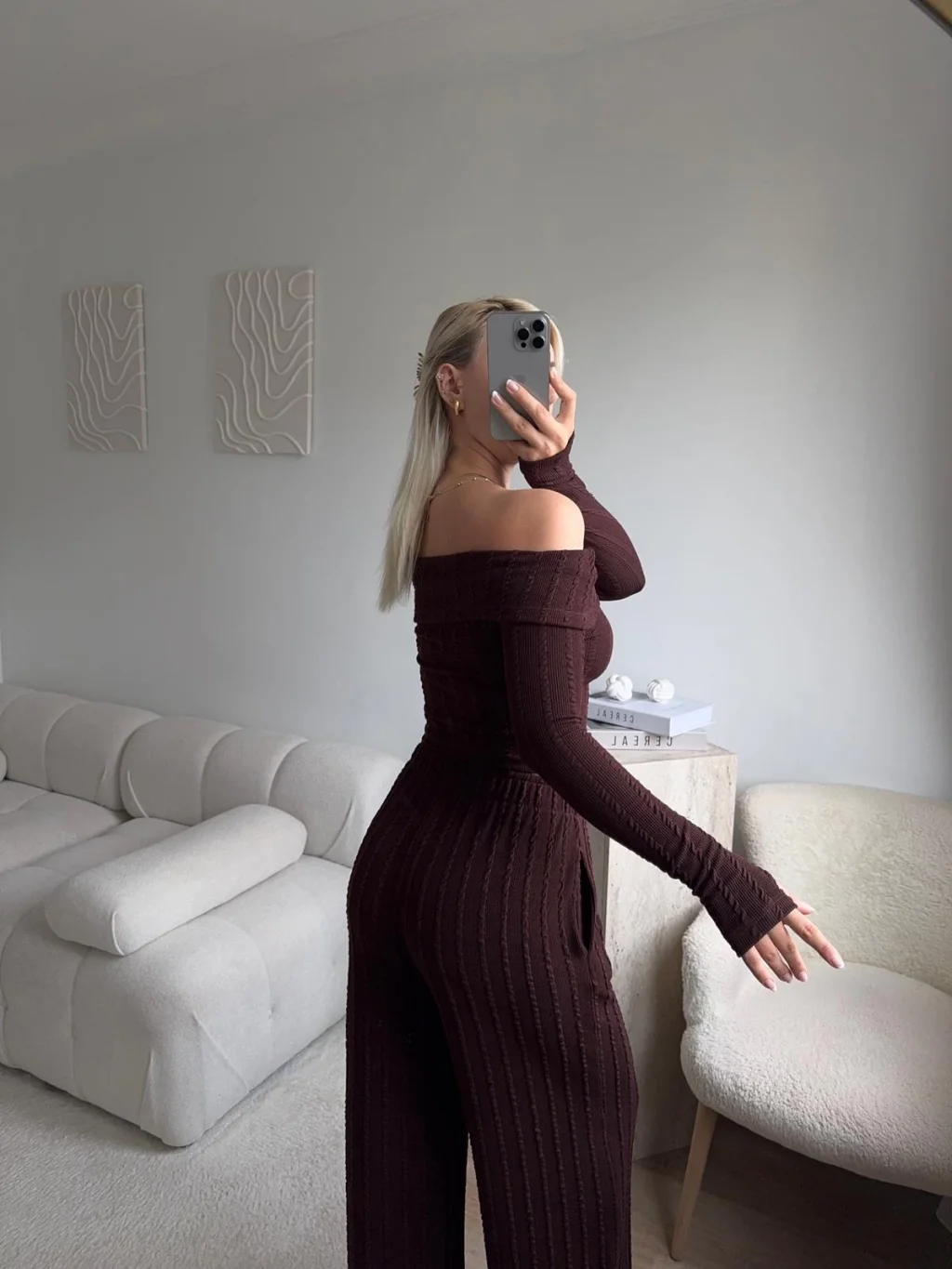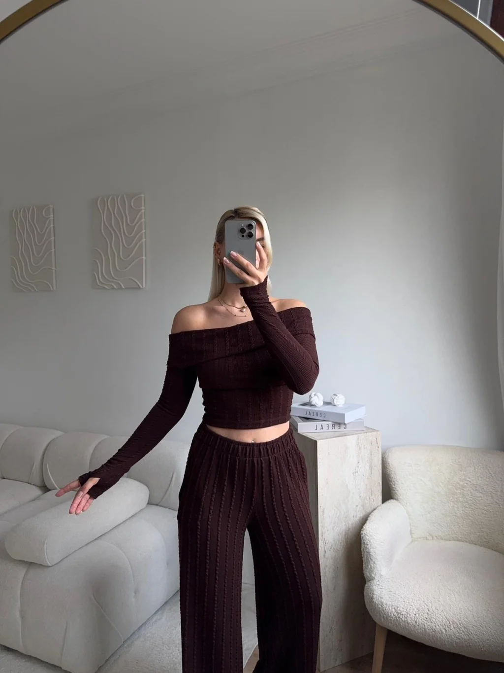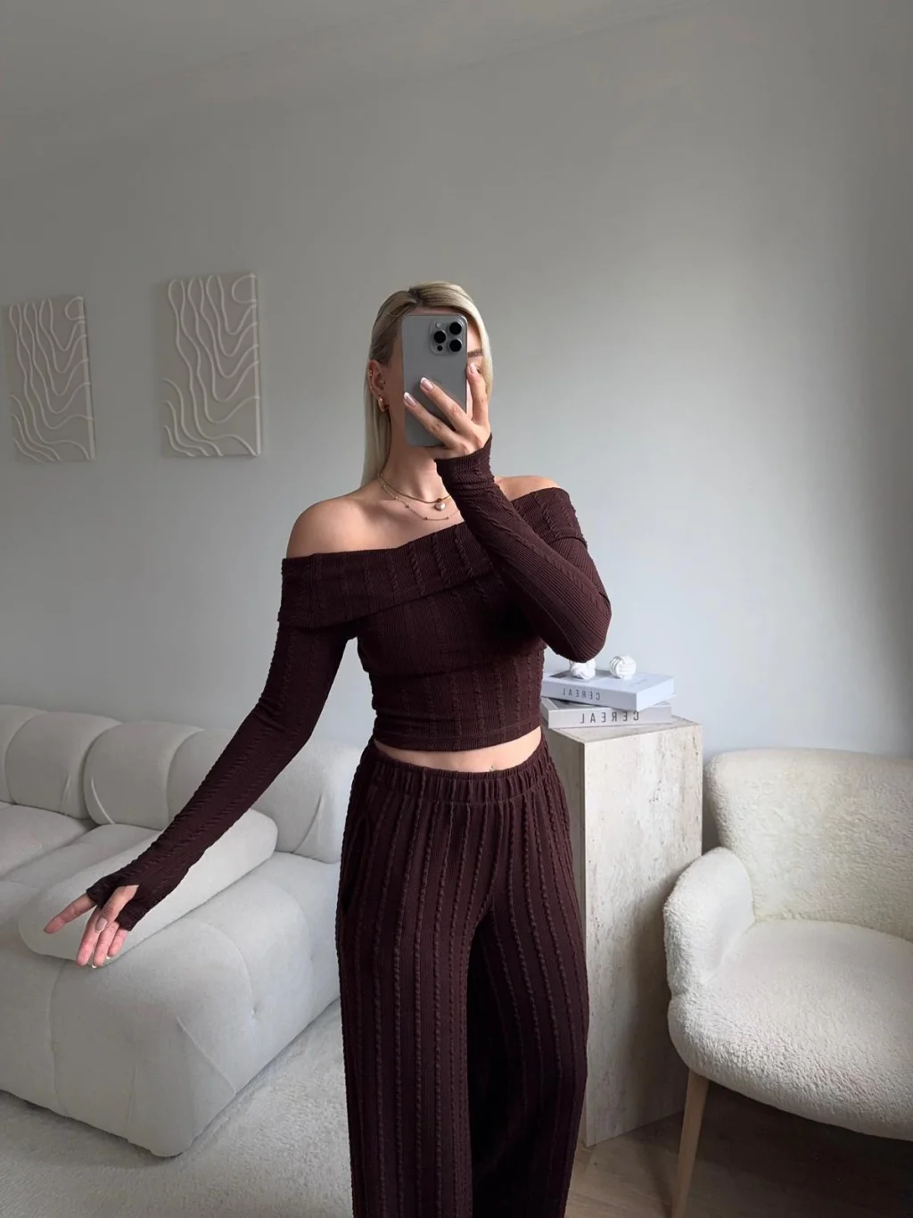 Fitilli Madonna Crop & Pantolon Takım - KAHVE