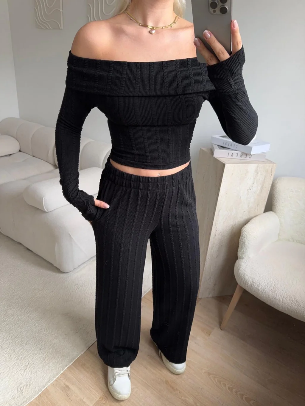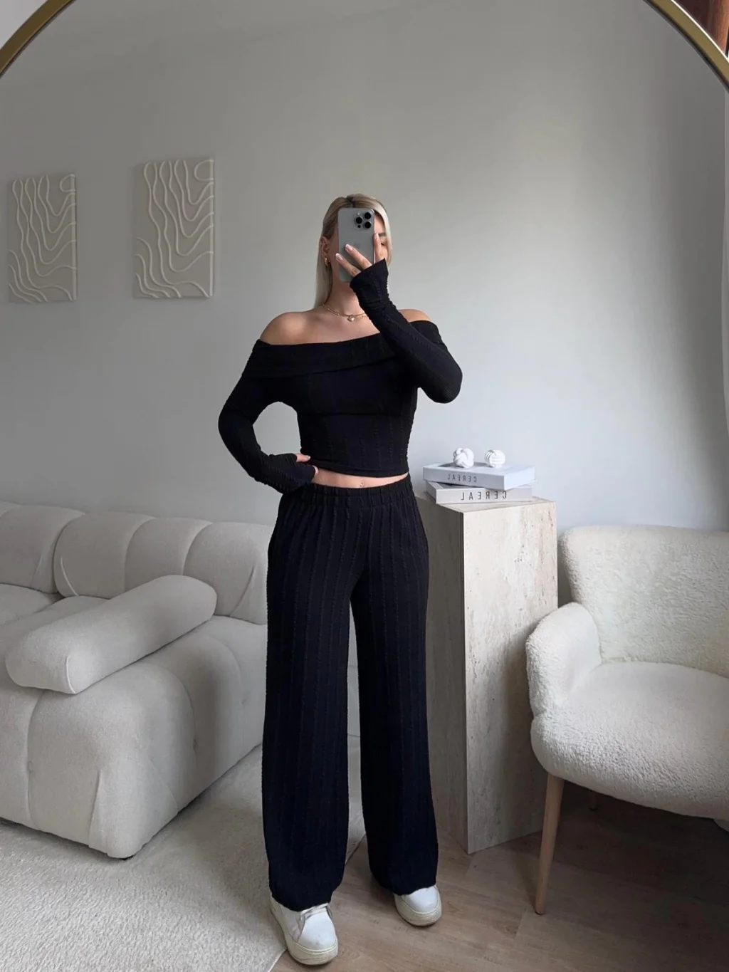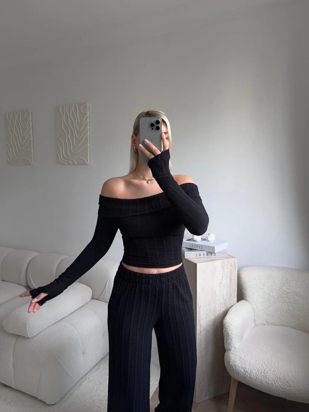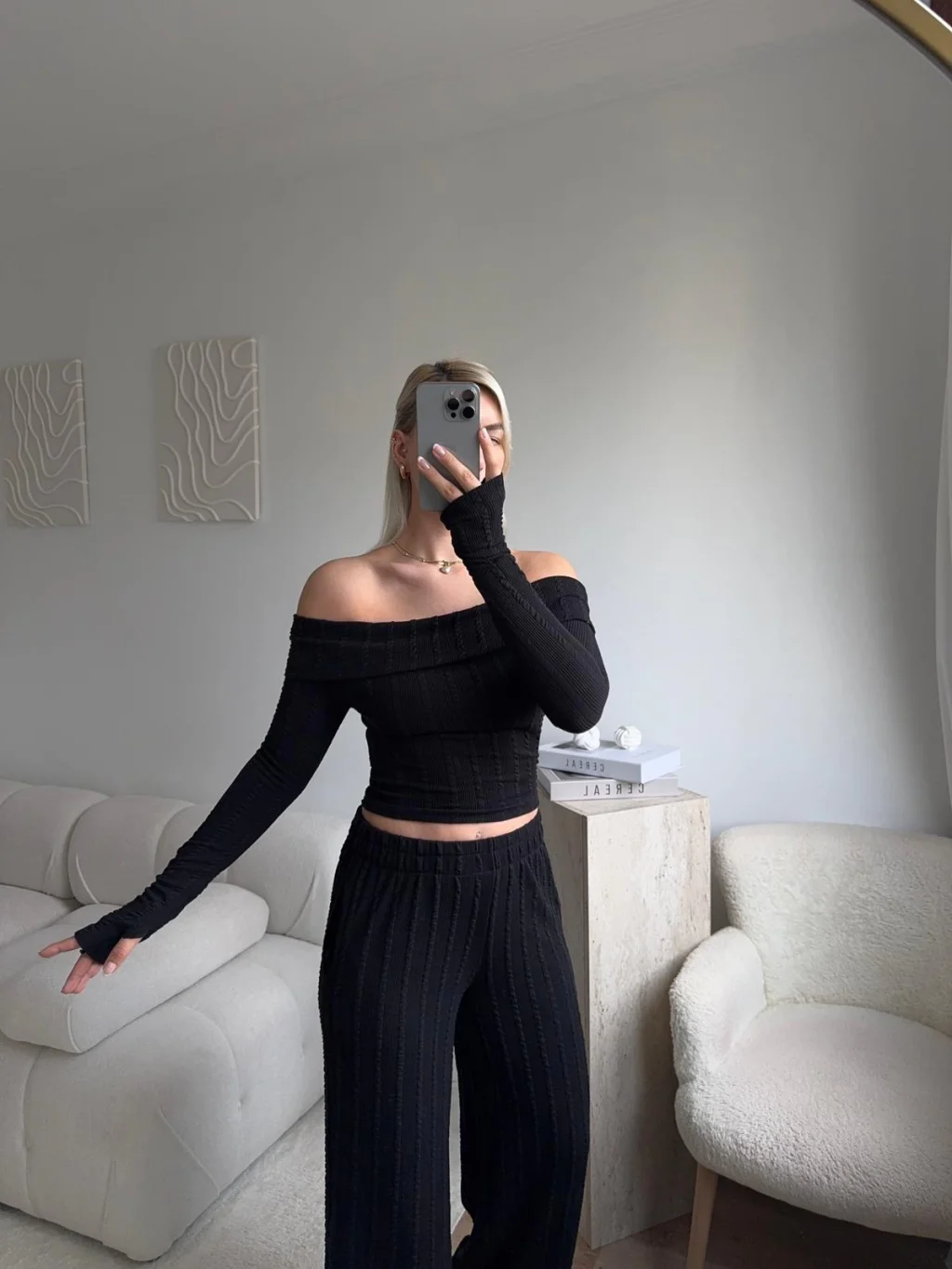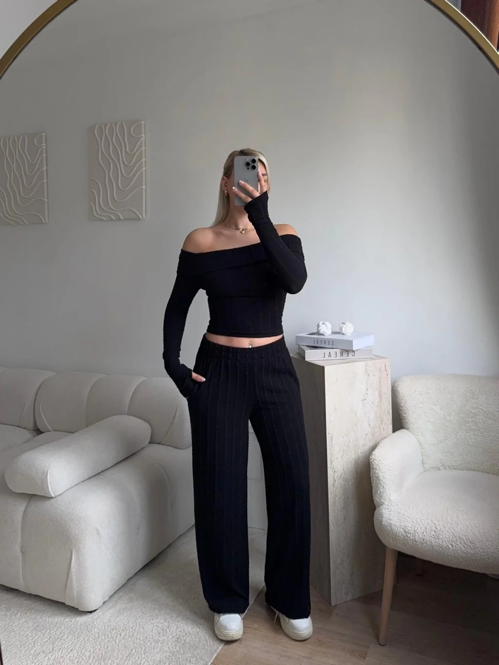 Fitilli Madonna Crop & Pantolon Takım - SİYAH