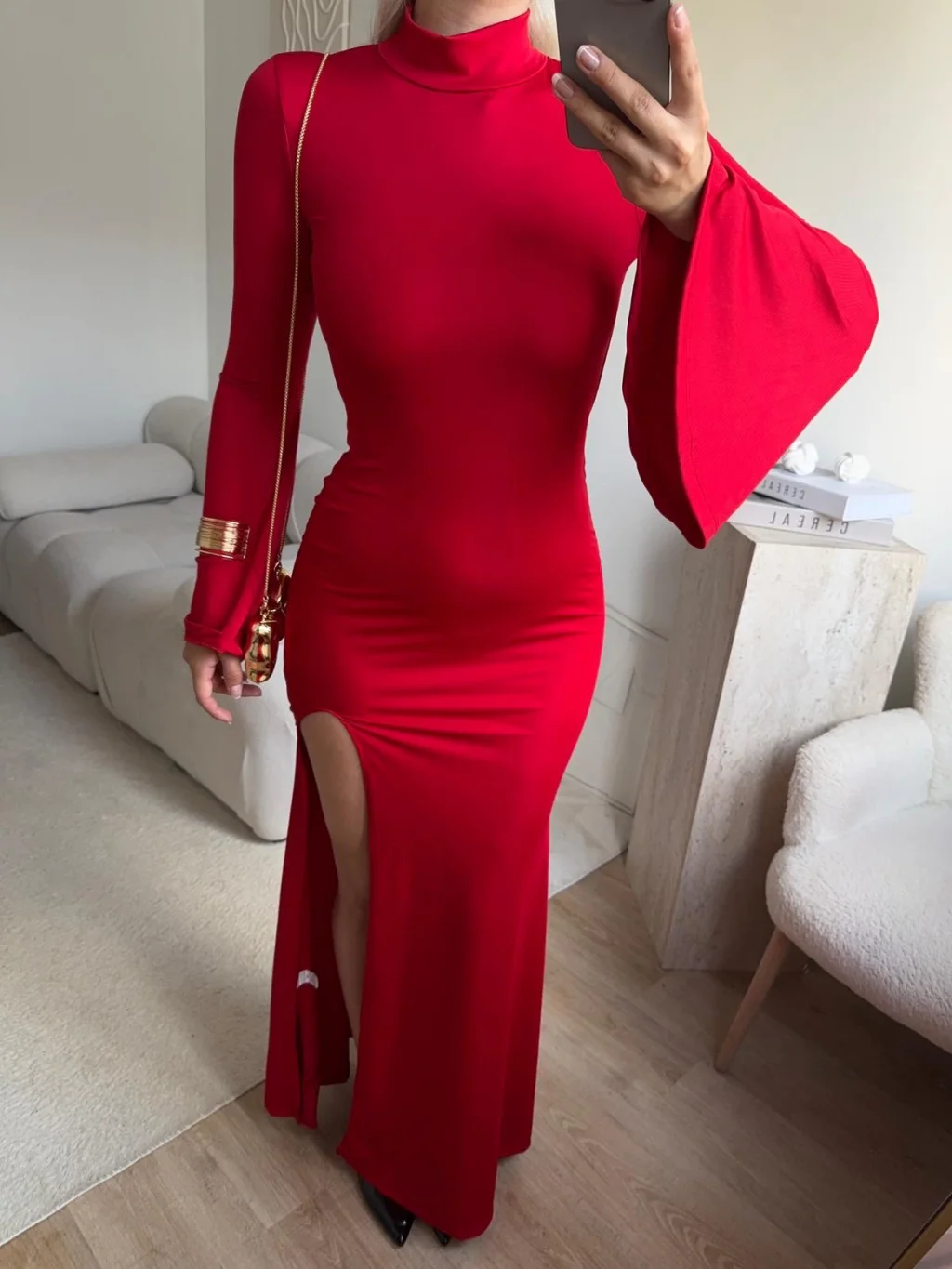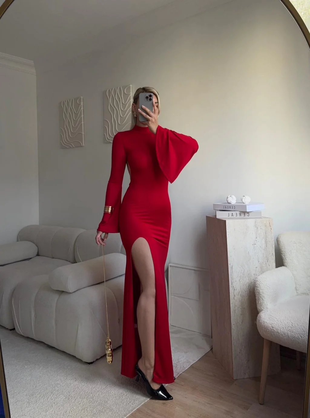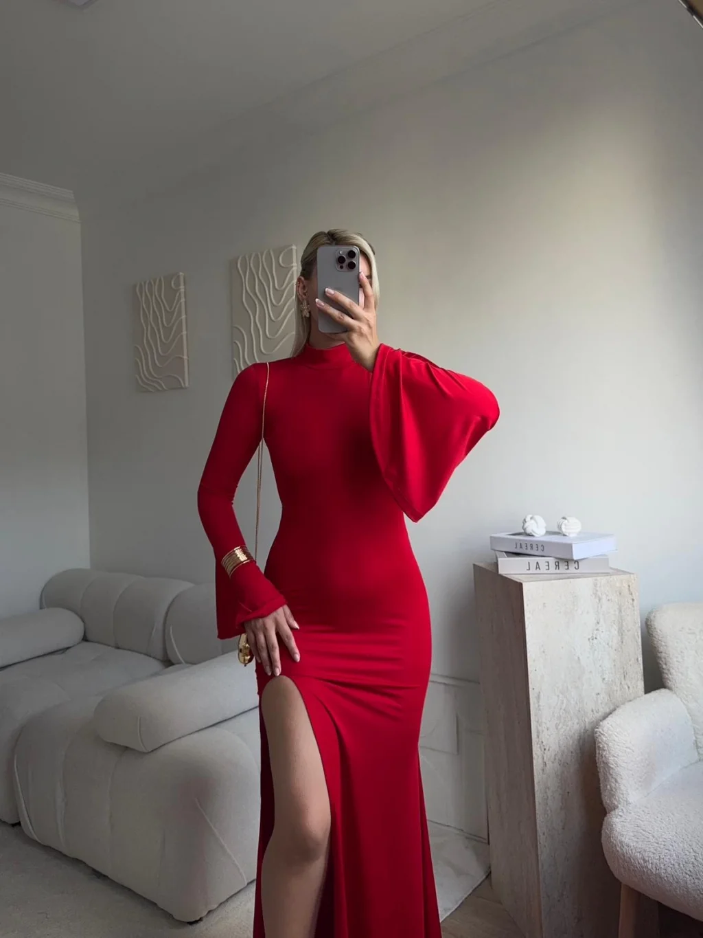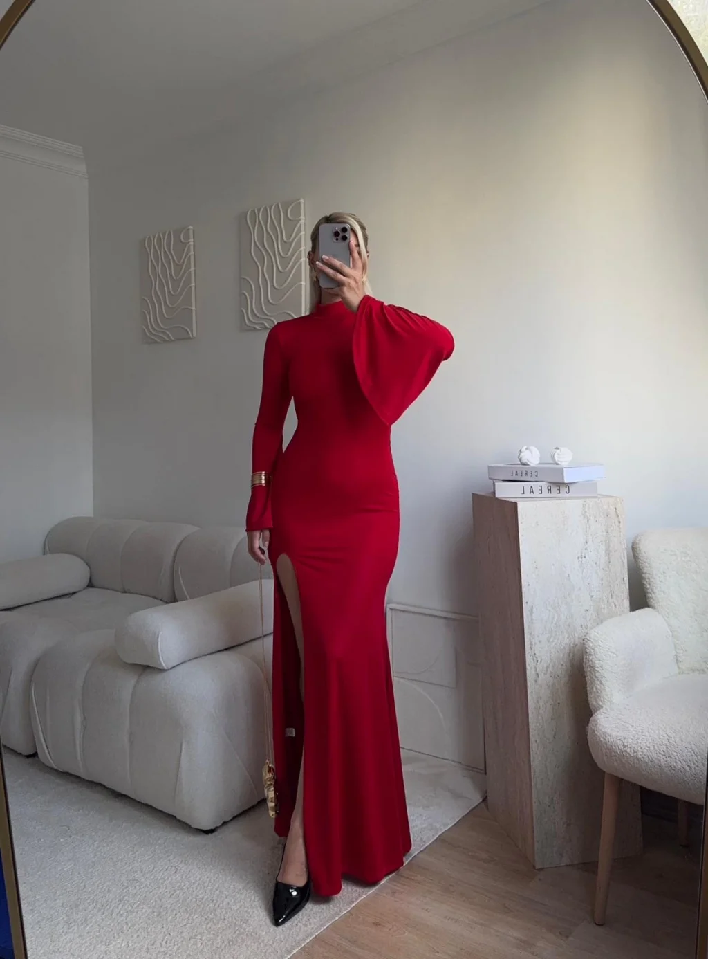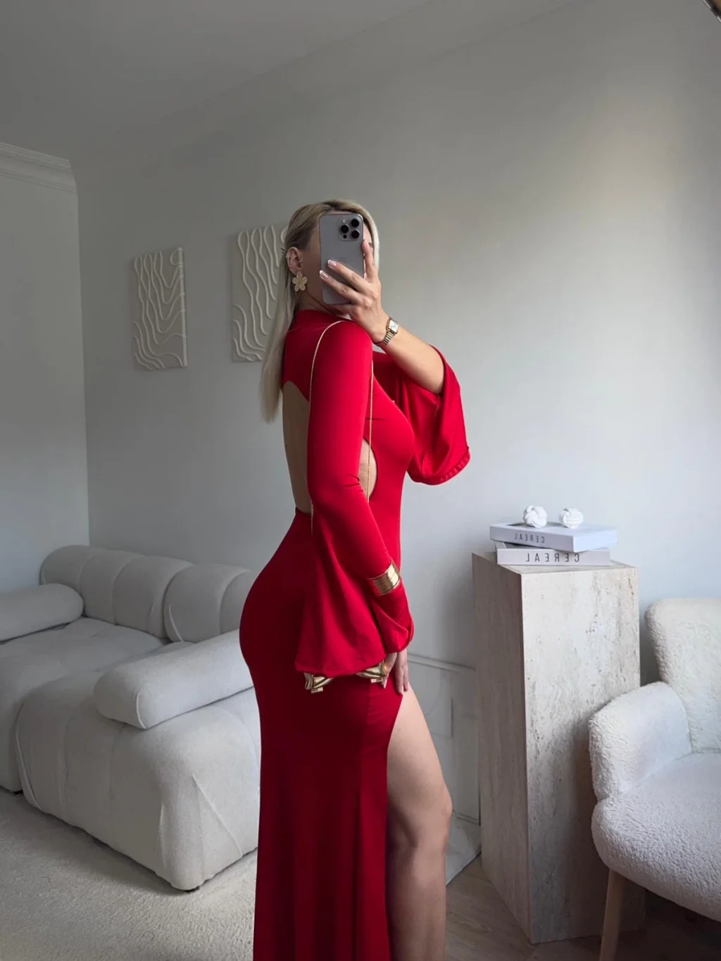 Flare Sırt Maxi Uzun Elbise - KIRMIZI