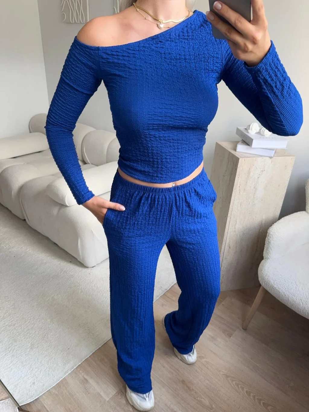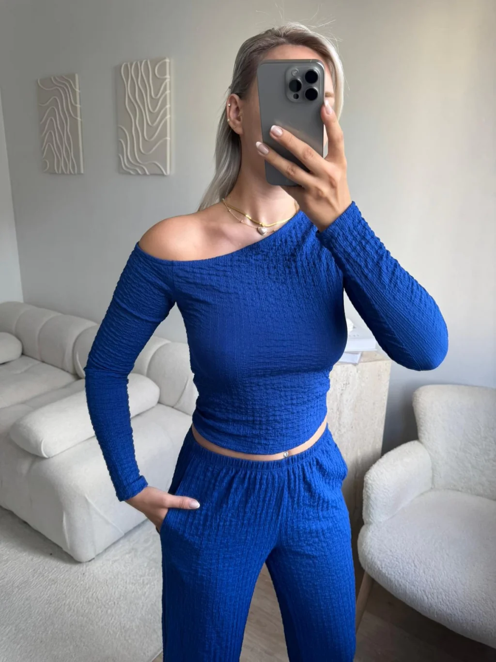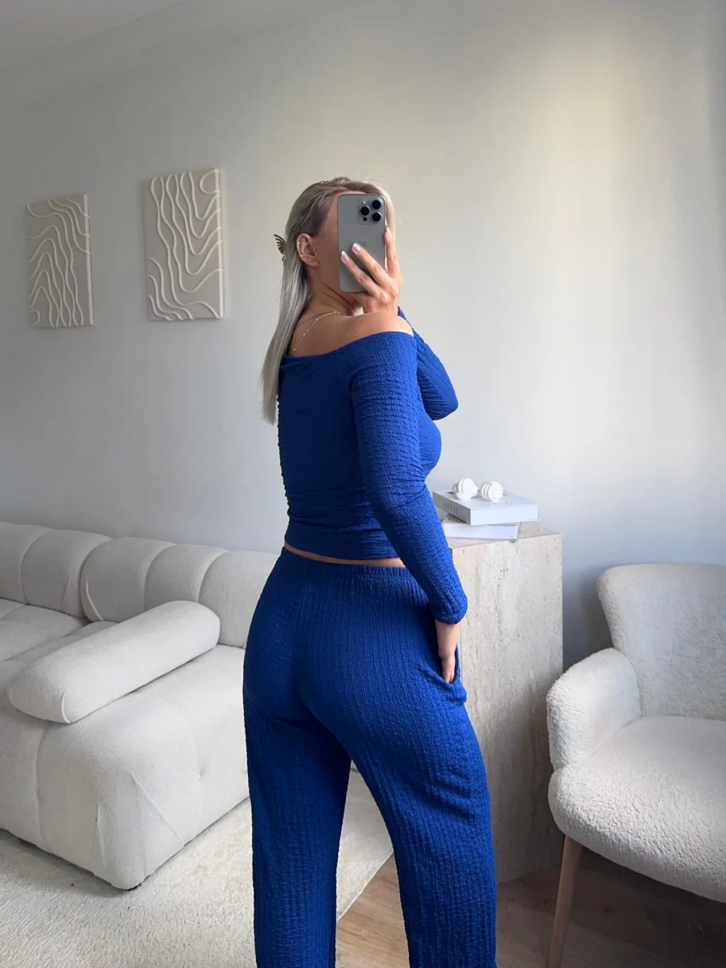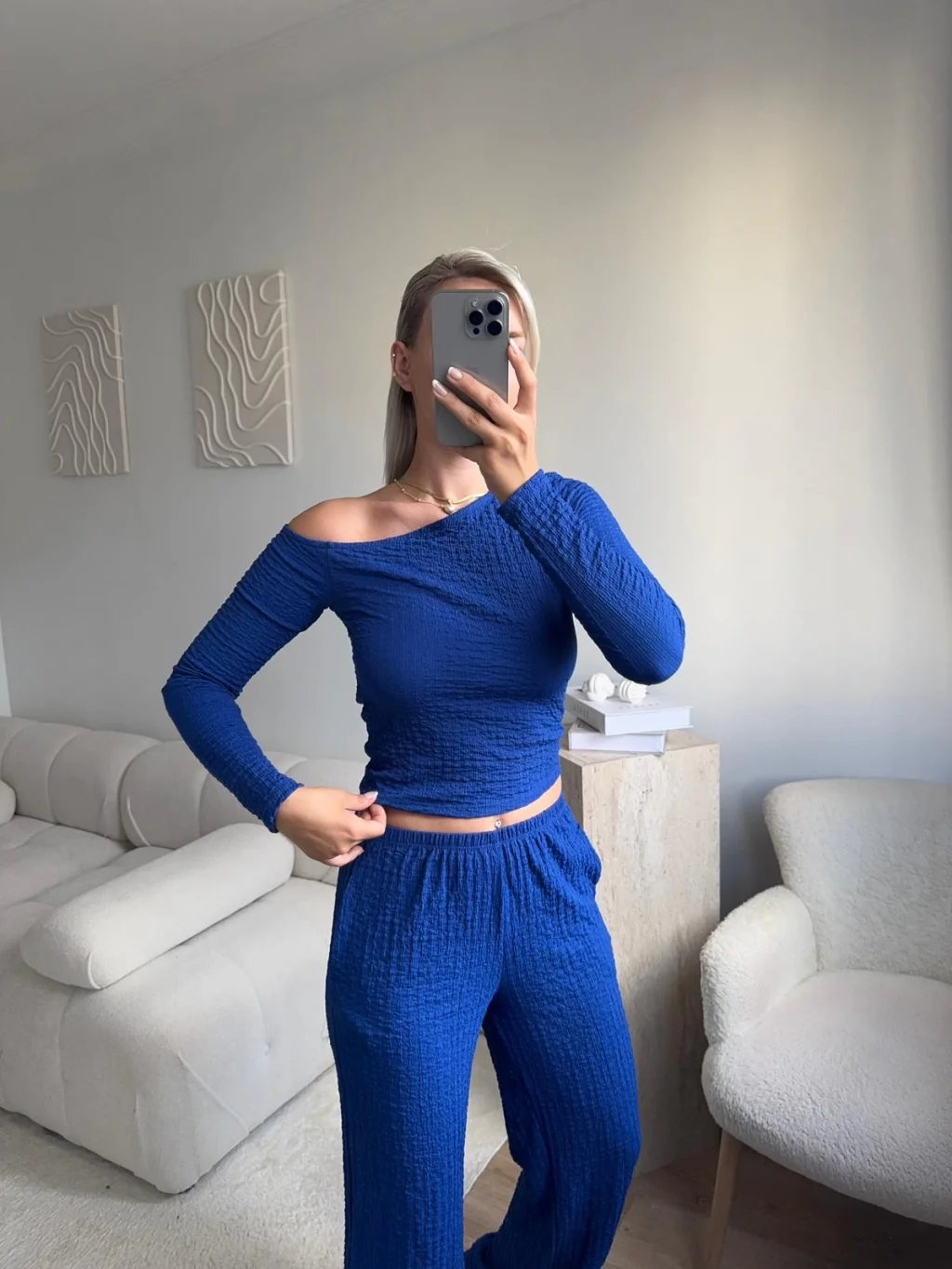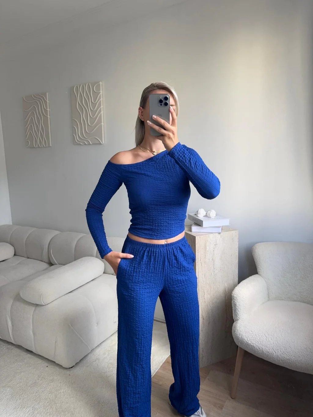Kayık Yaka Crop & Pantolon Takım - SAKS MAVİSİ