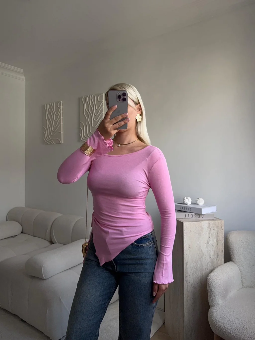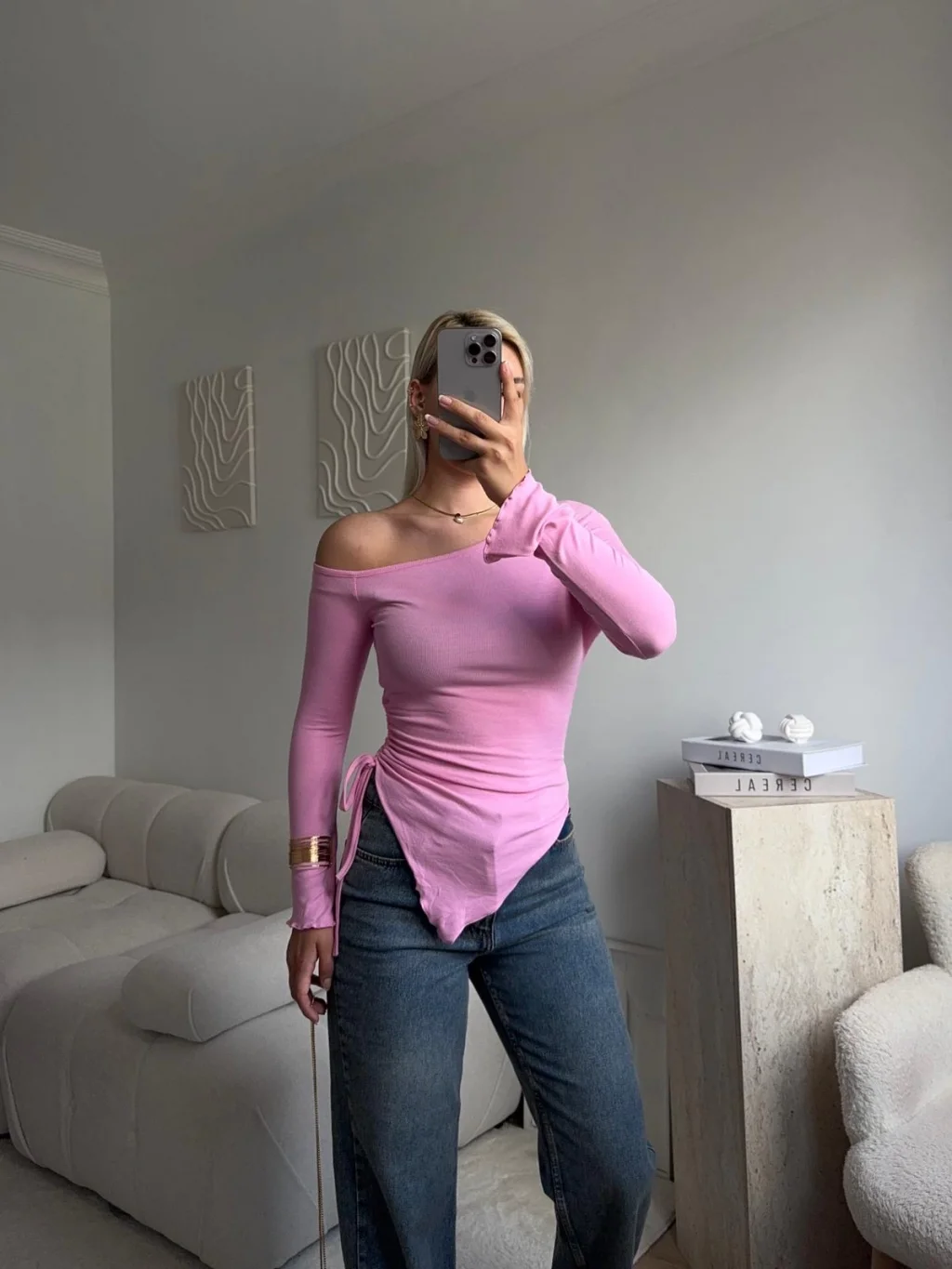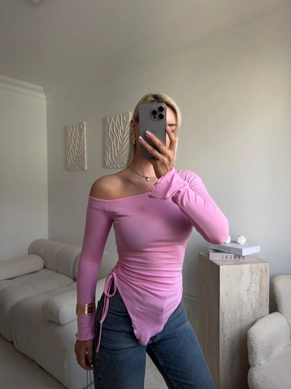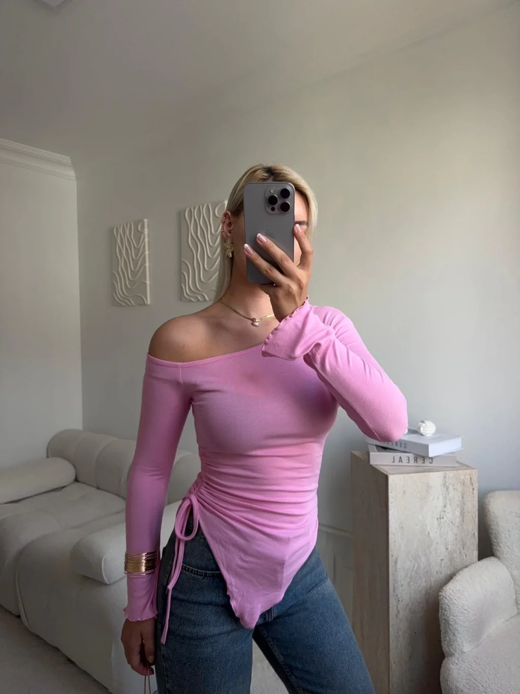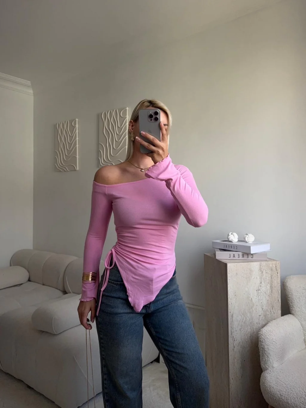 Kayık Yaka Yan Büzgü Bluz - PEMBE