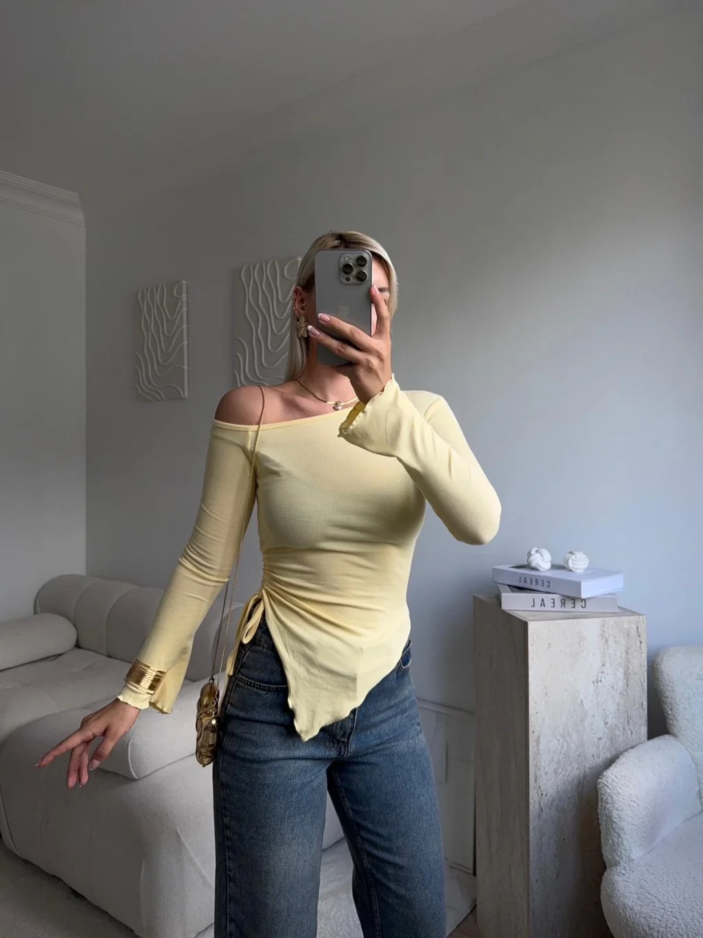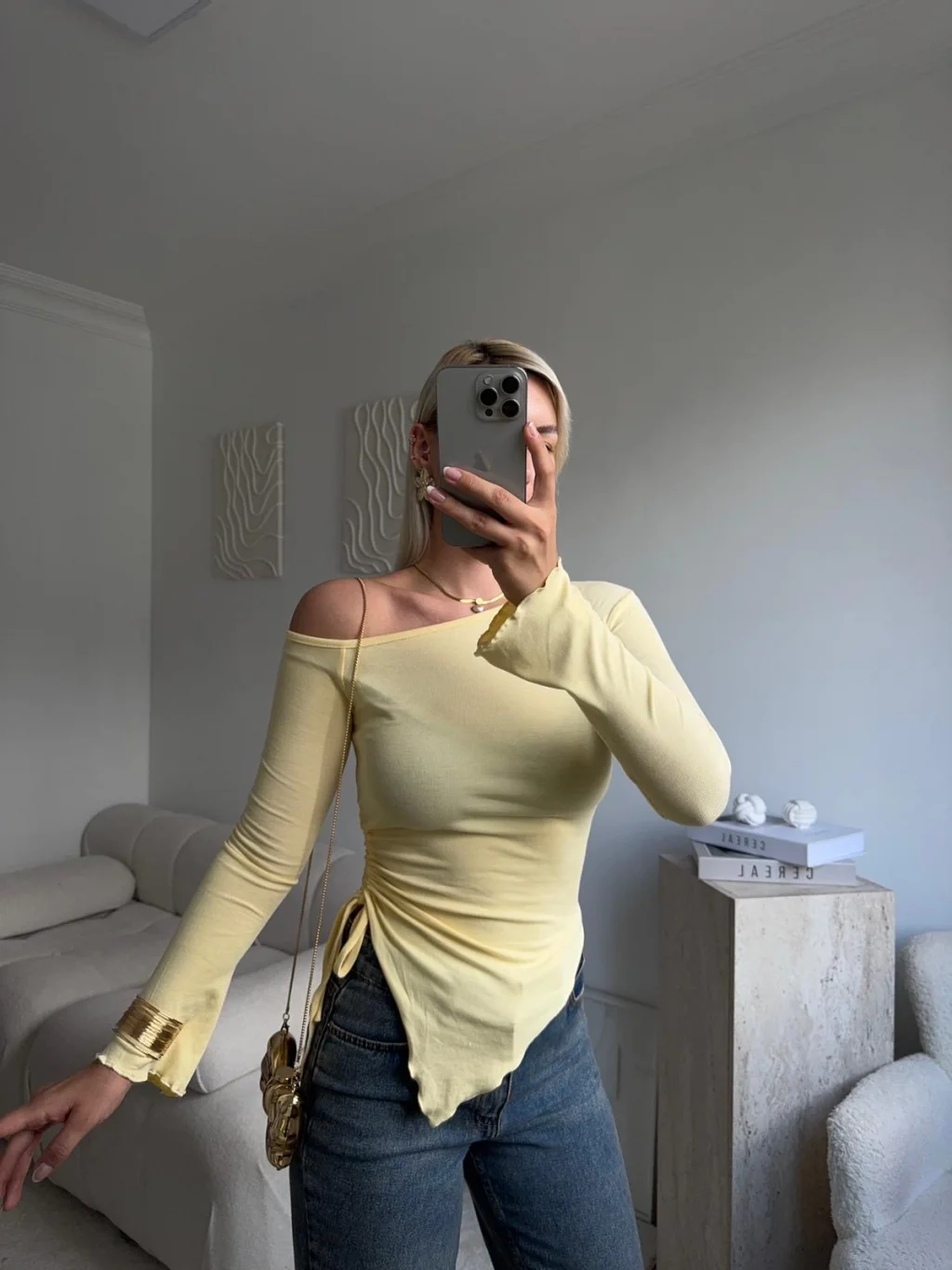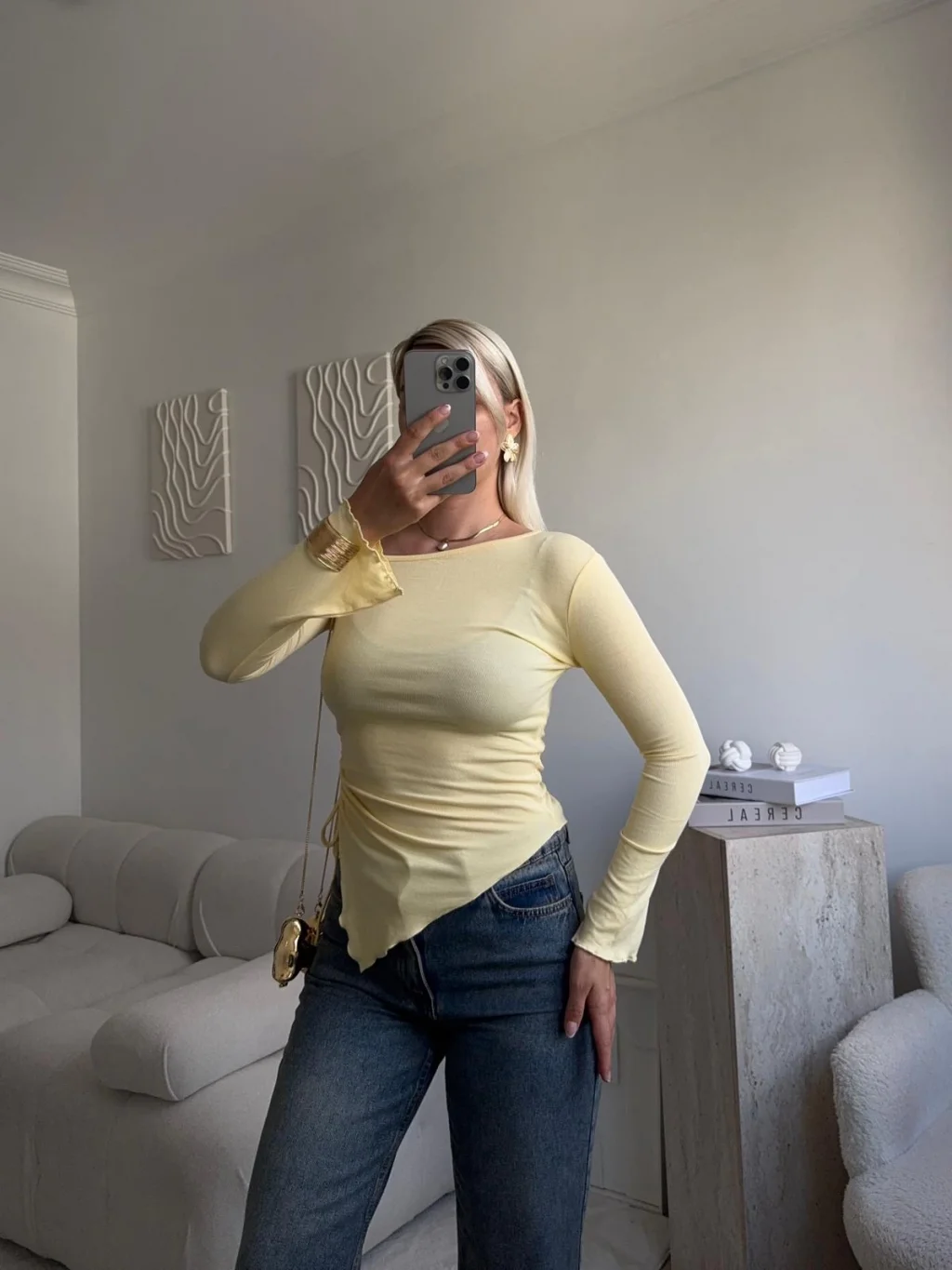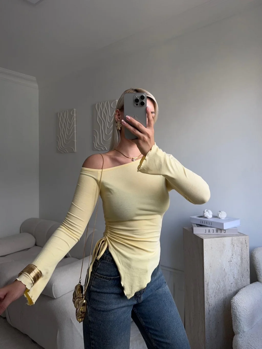 Kayık Yaka Yan Büzgü Bluz - SARI
