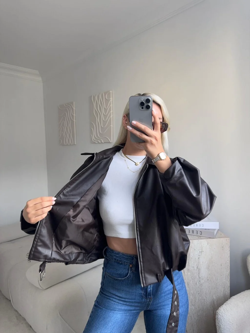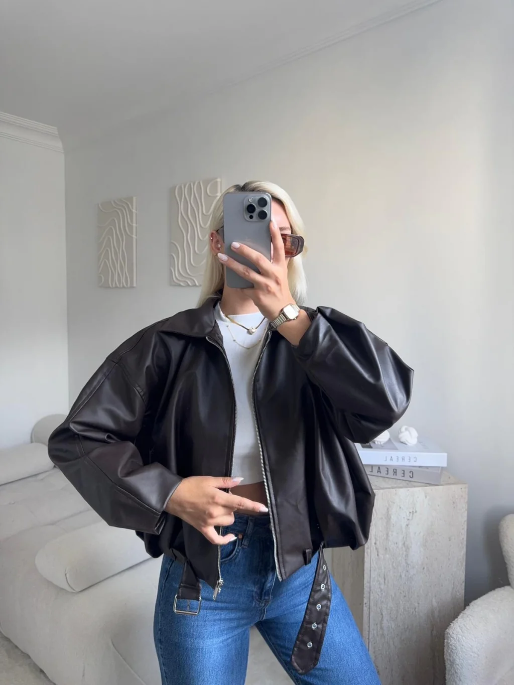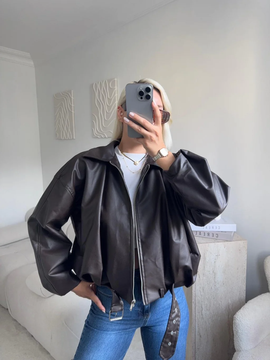 Kemerli Oversize Deri Ceket - ACI KAHVE