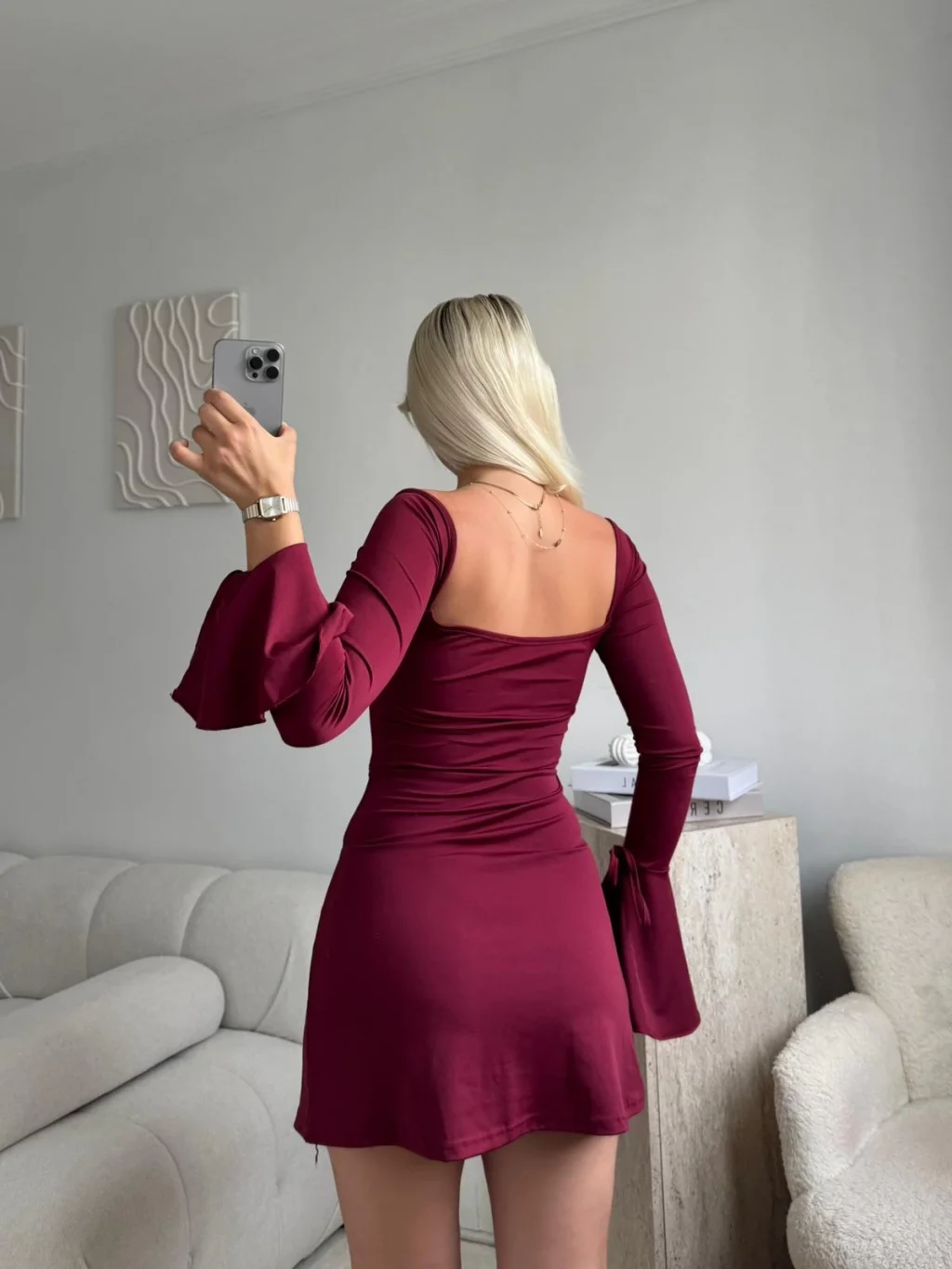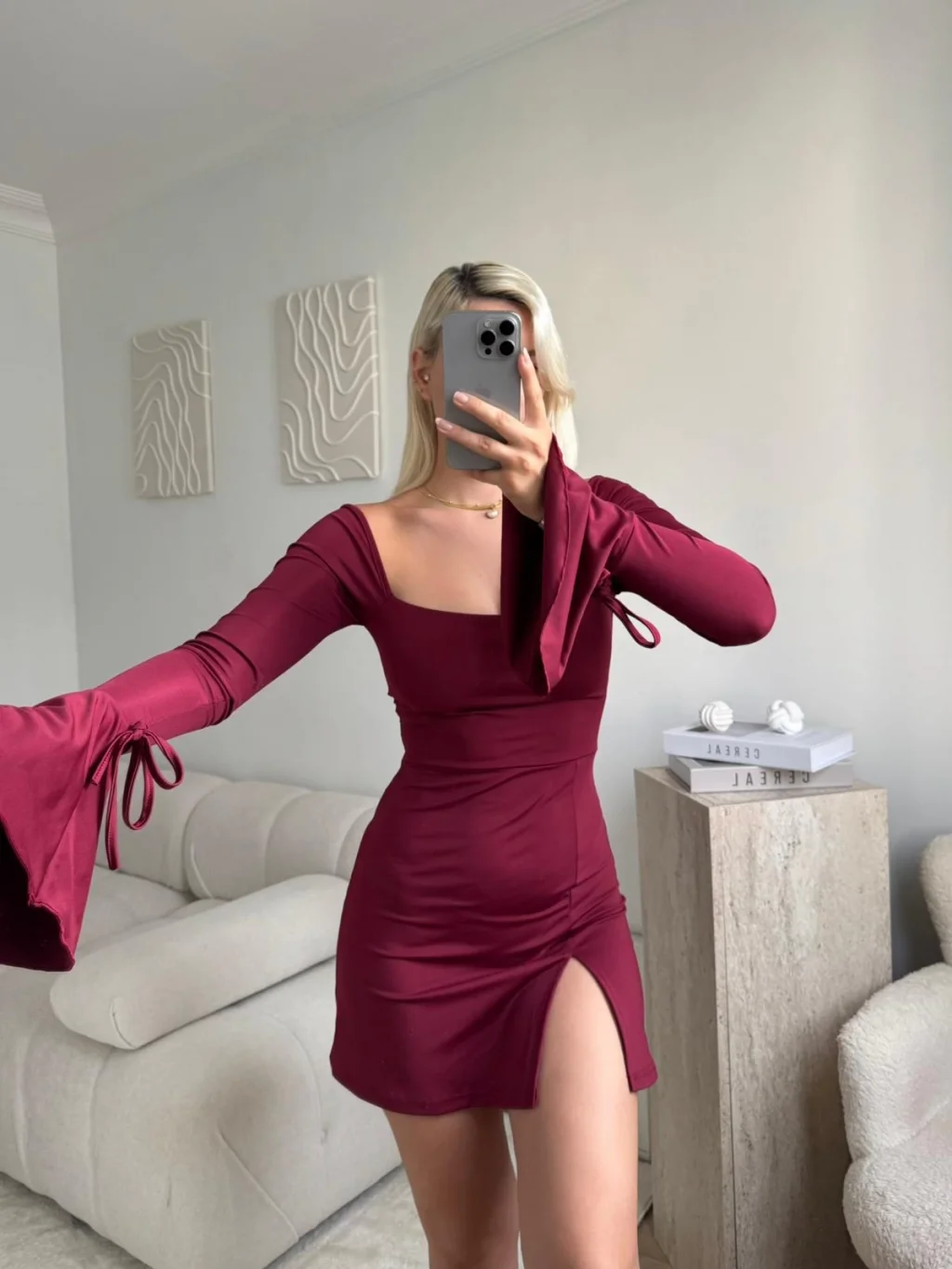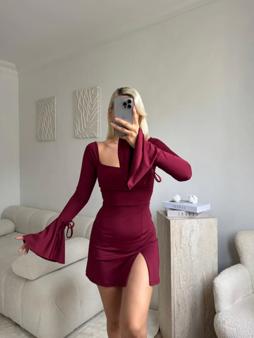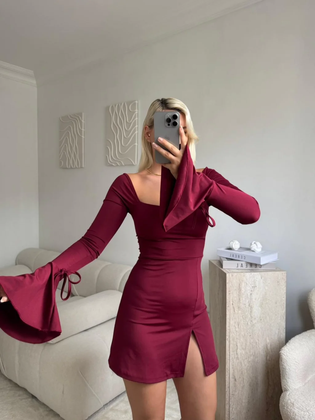 Kol Volanlı Yırtmaçlı Elbise - BORDO