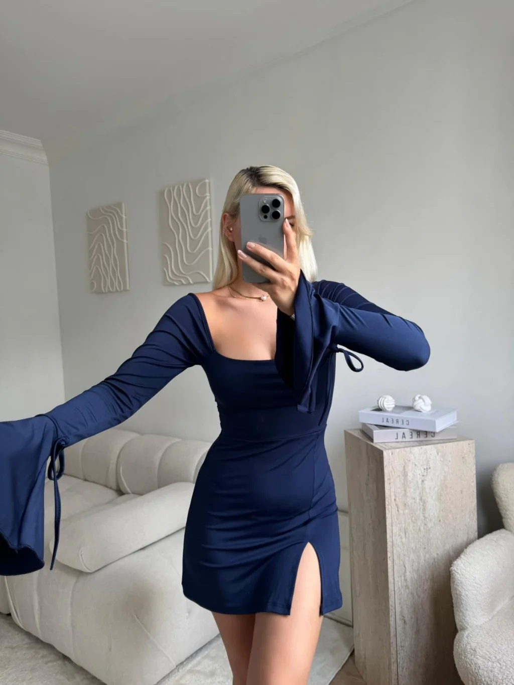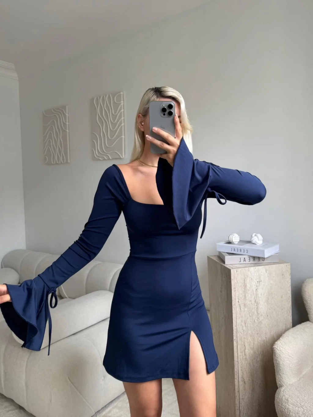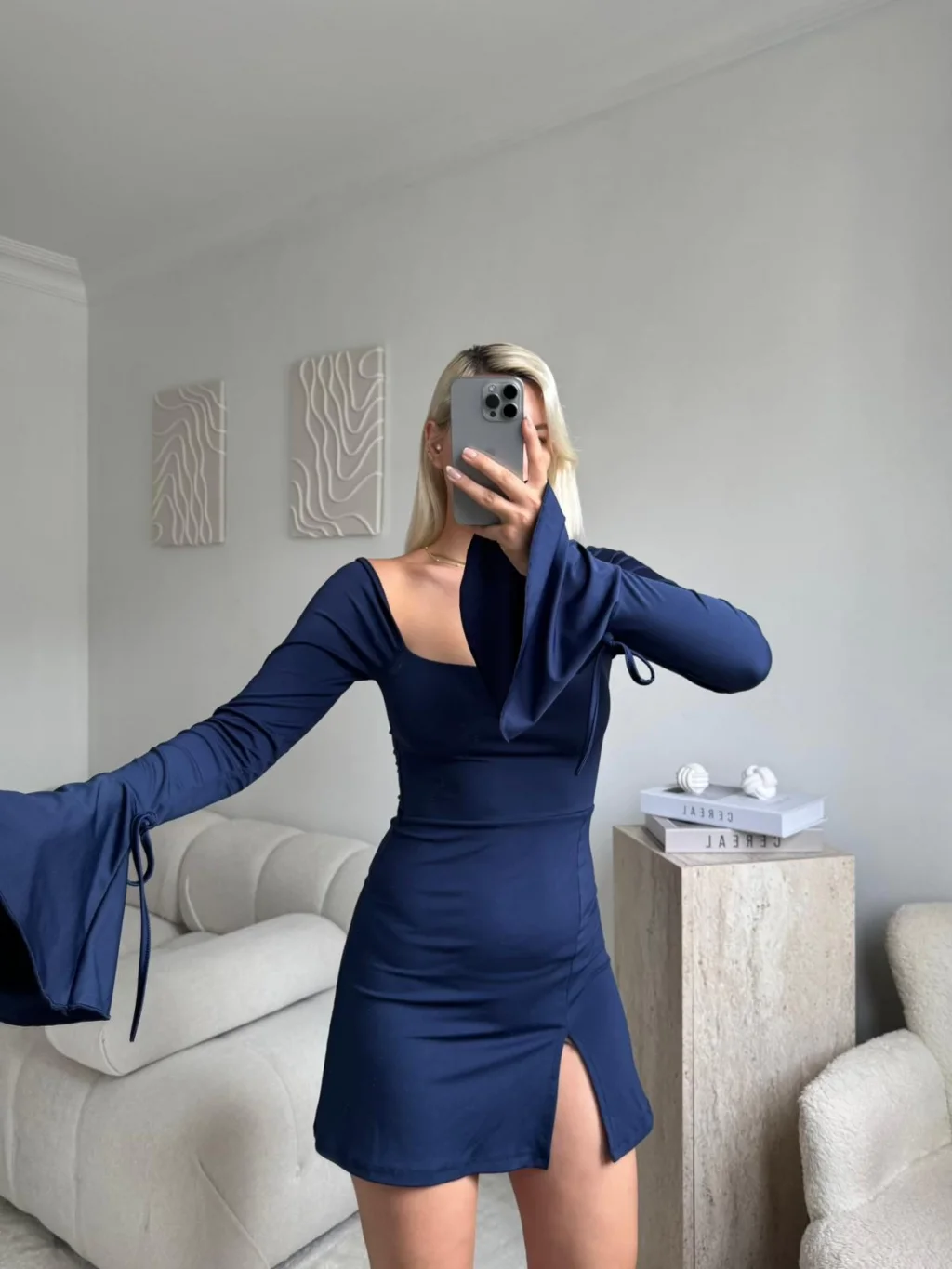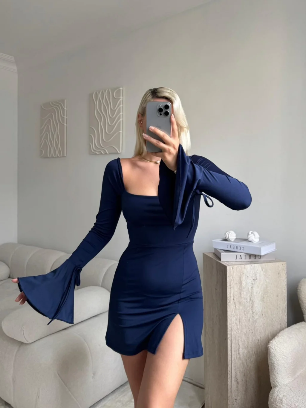 Kol Volanlı Yırtmaçlı Elbise - LACİVERT