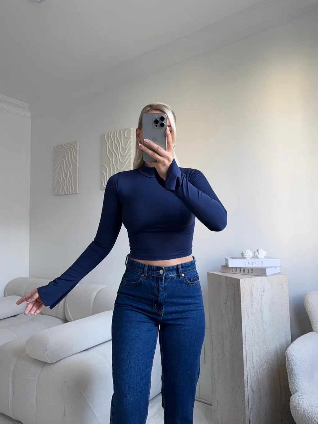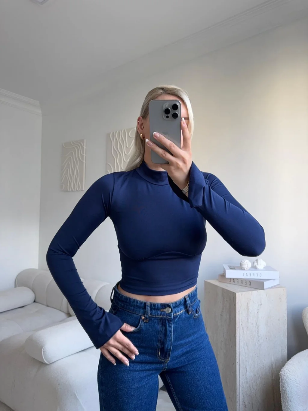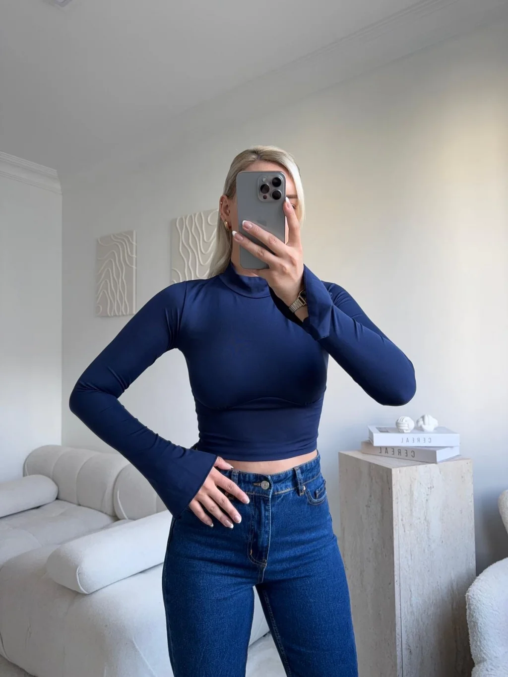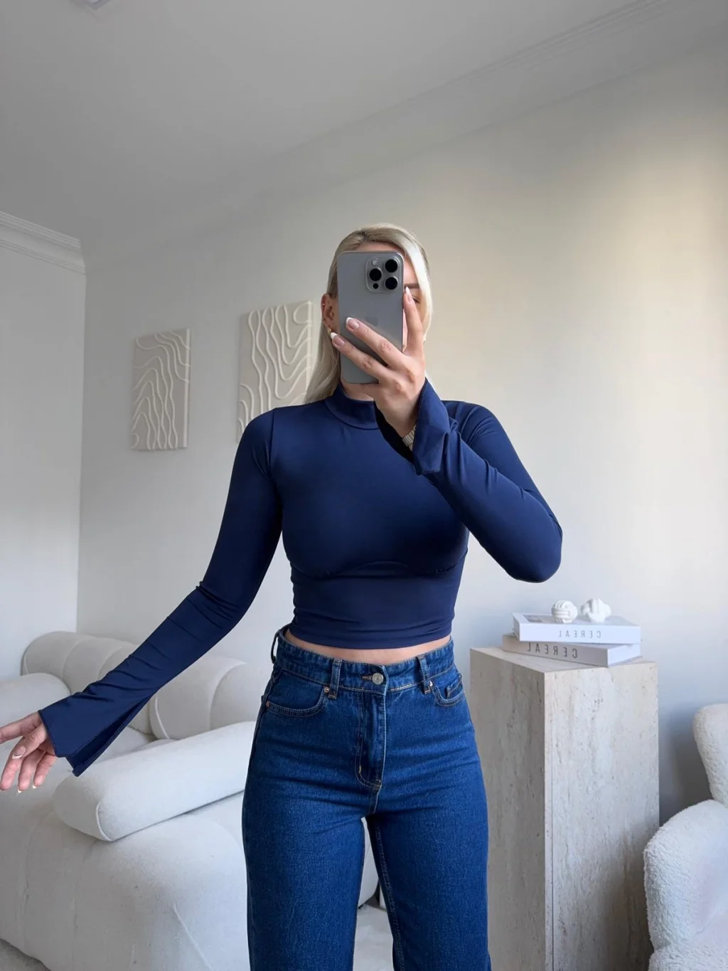 Kol Yırtmaç Yarım Balıkçı Crop - LACİVERT