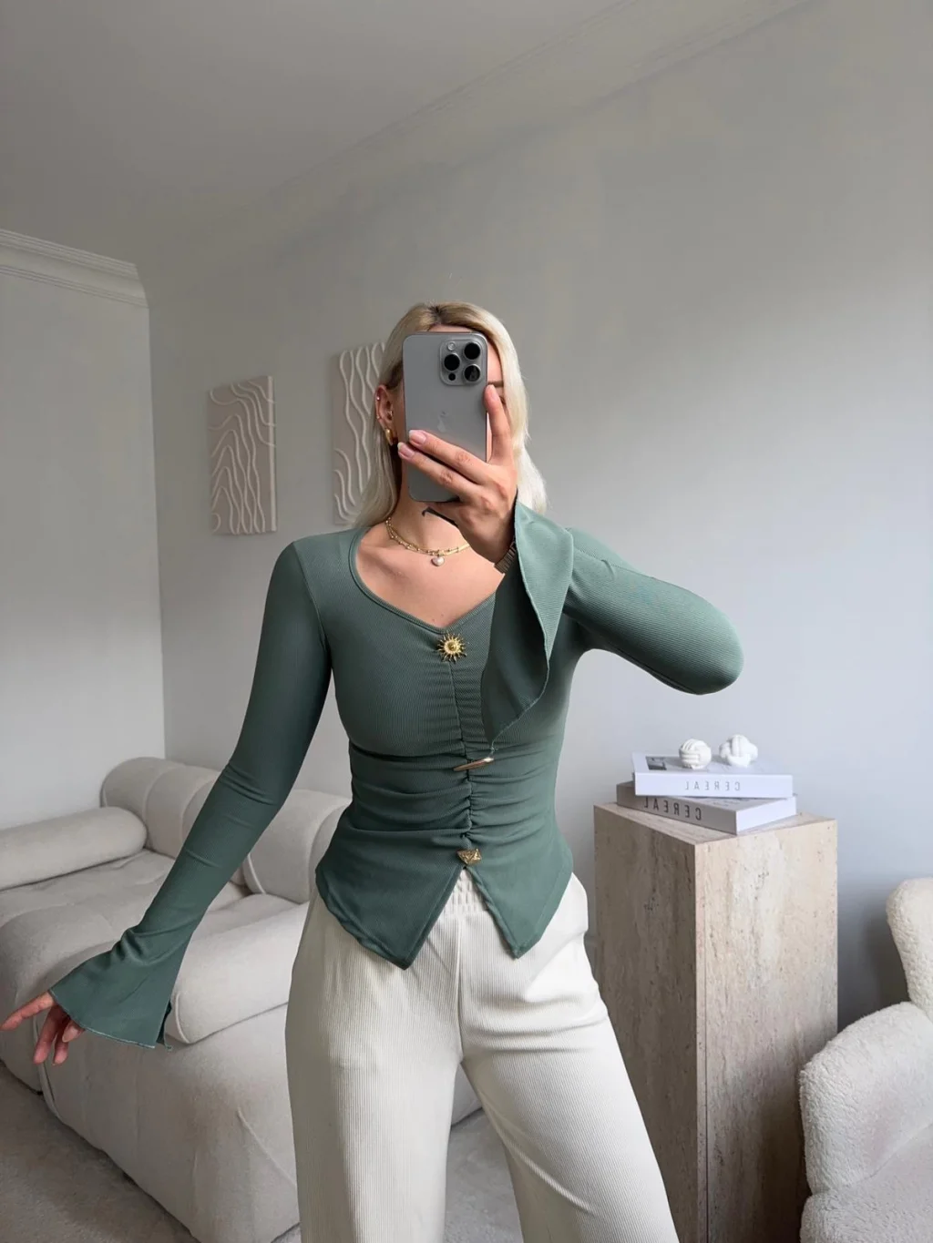 Kolları Volanlı Aksesuar Bluz - YEŞİL
