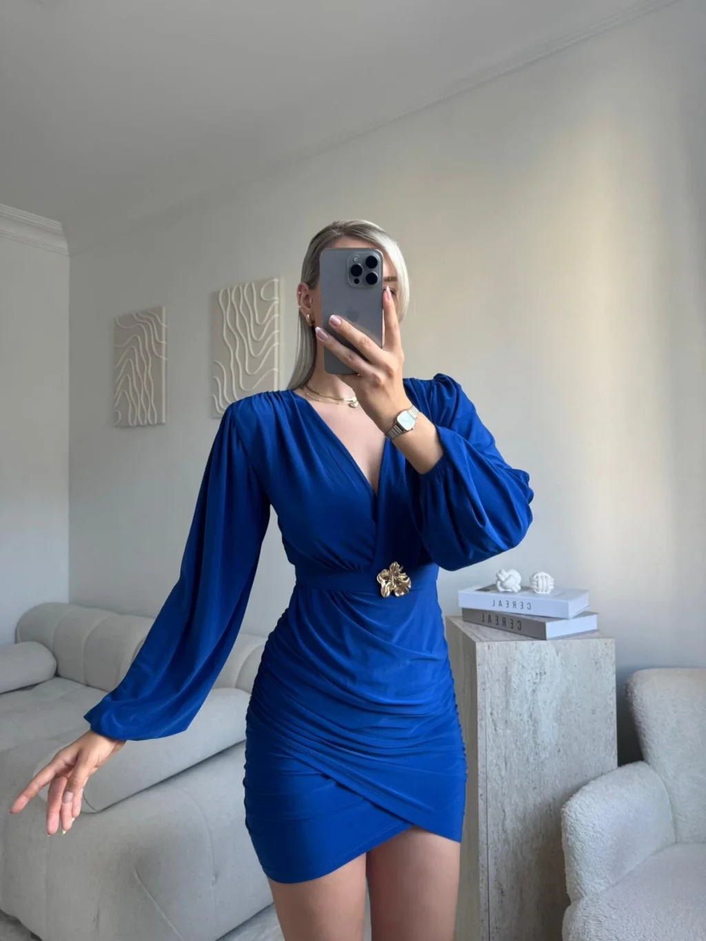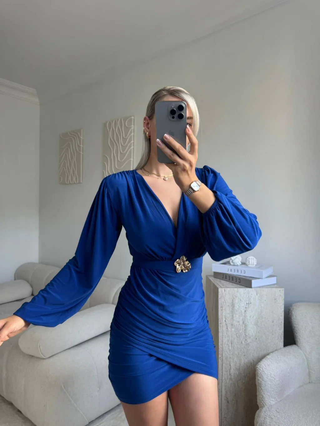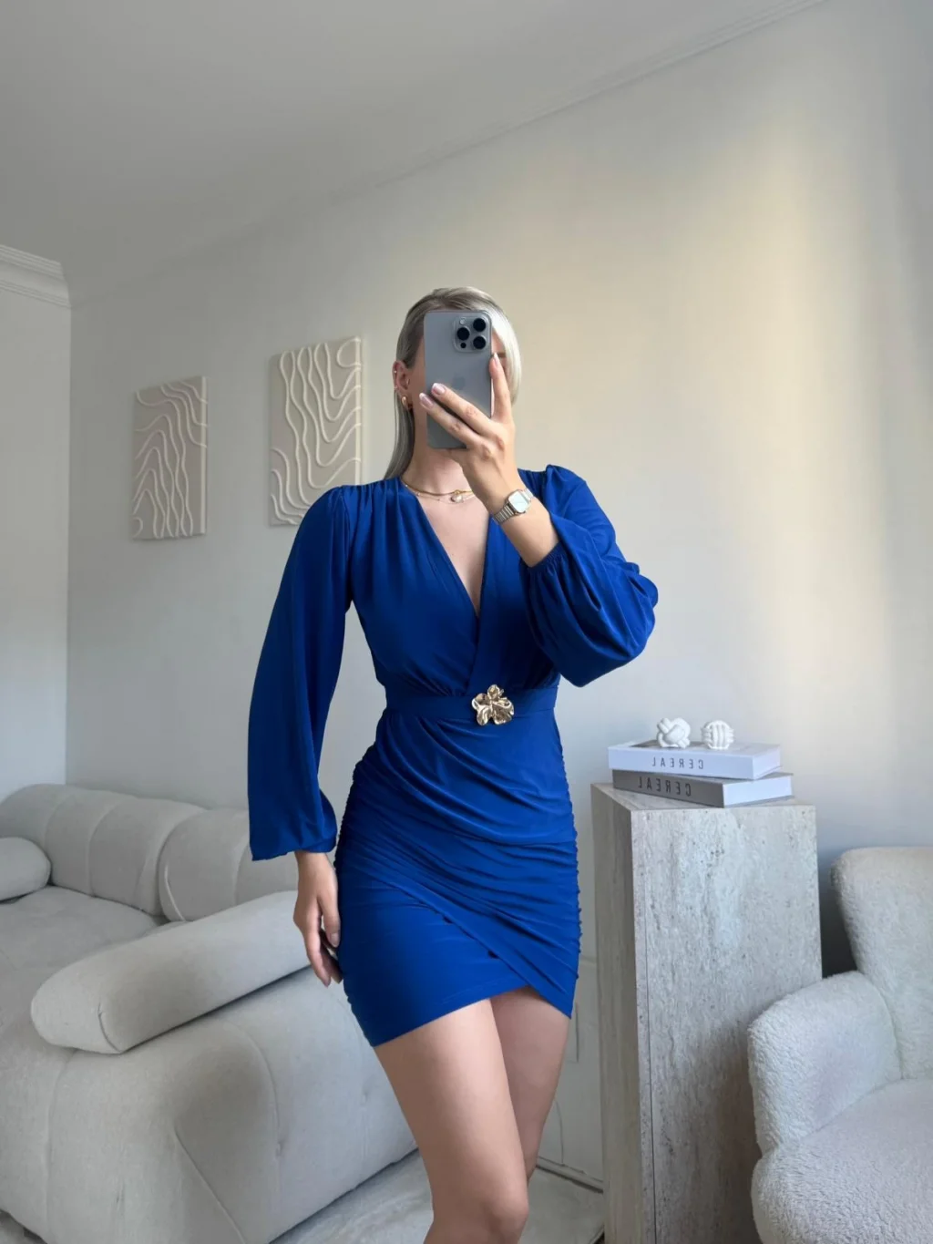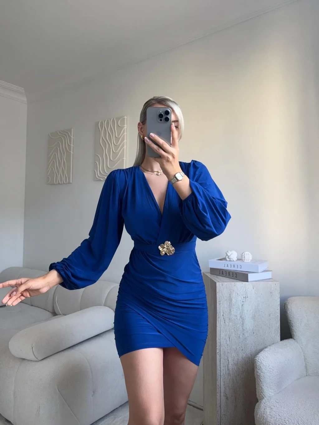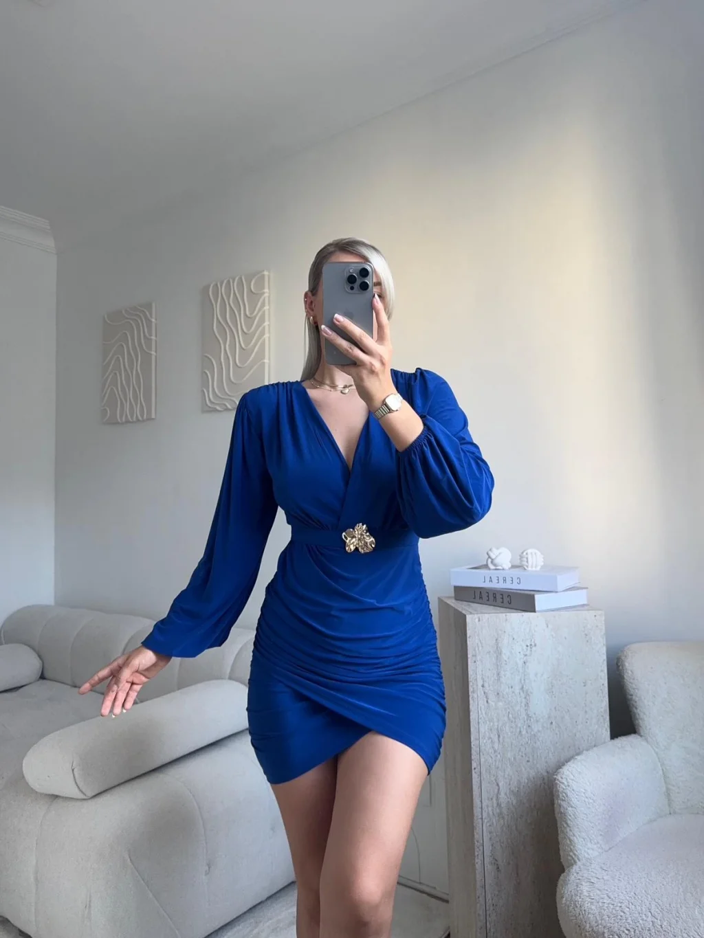 Kruvaze Önü Tokalı Elbise - SAKS MAVİSİ