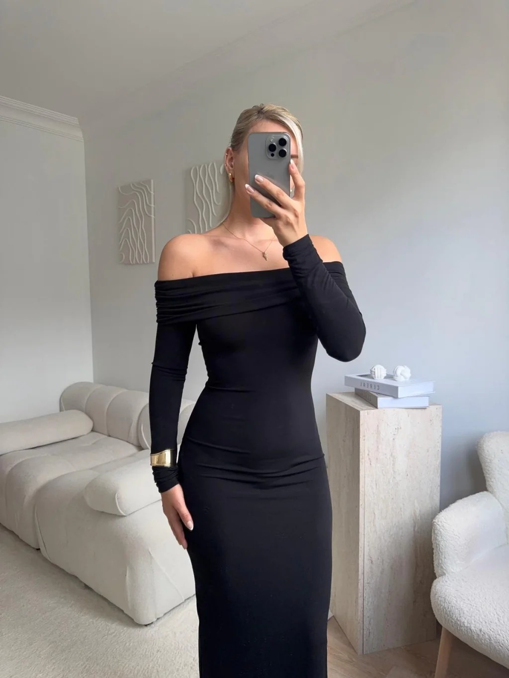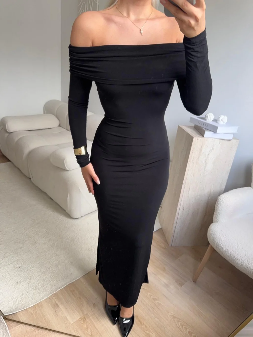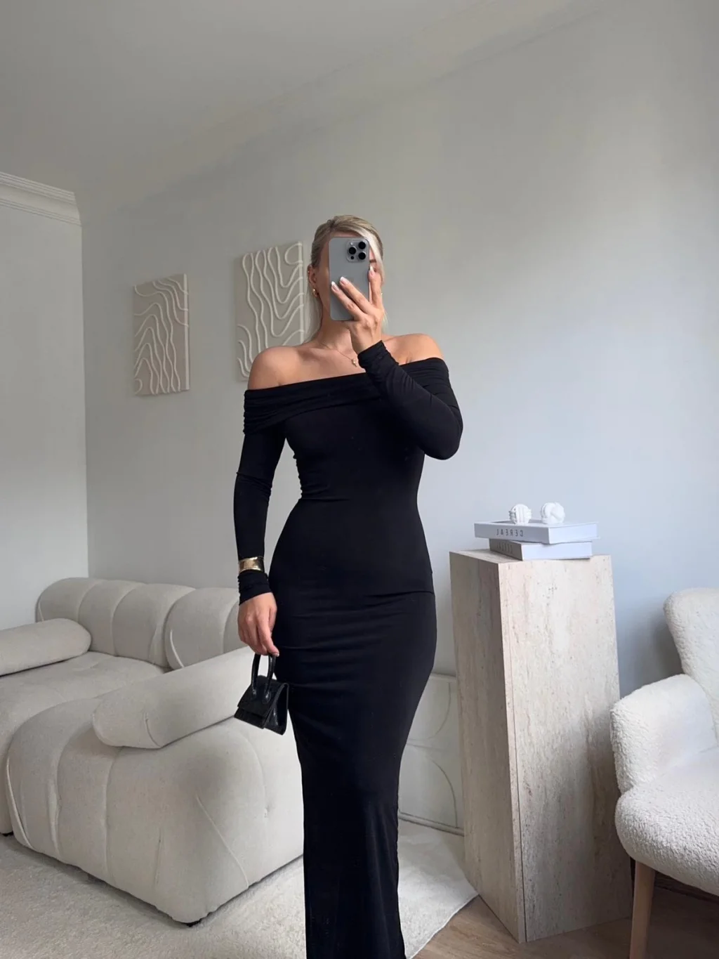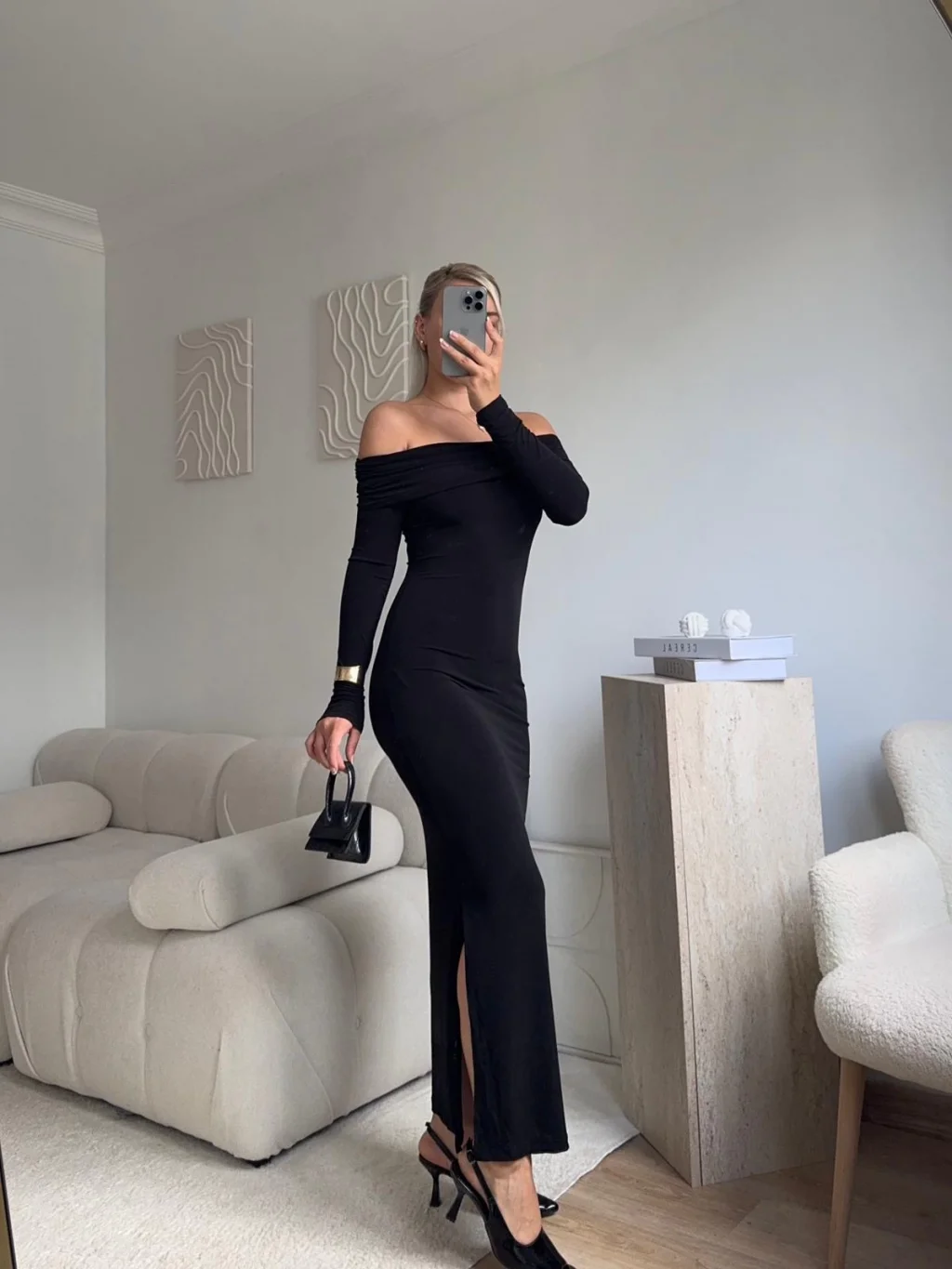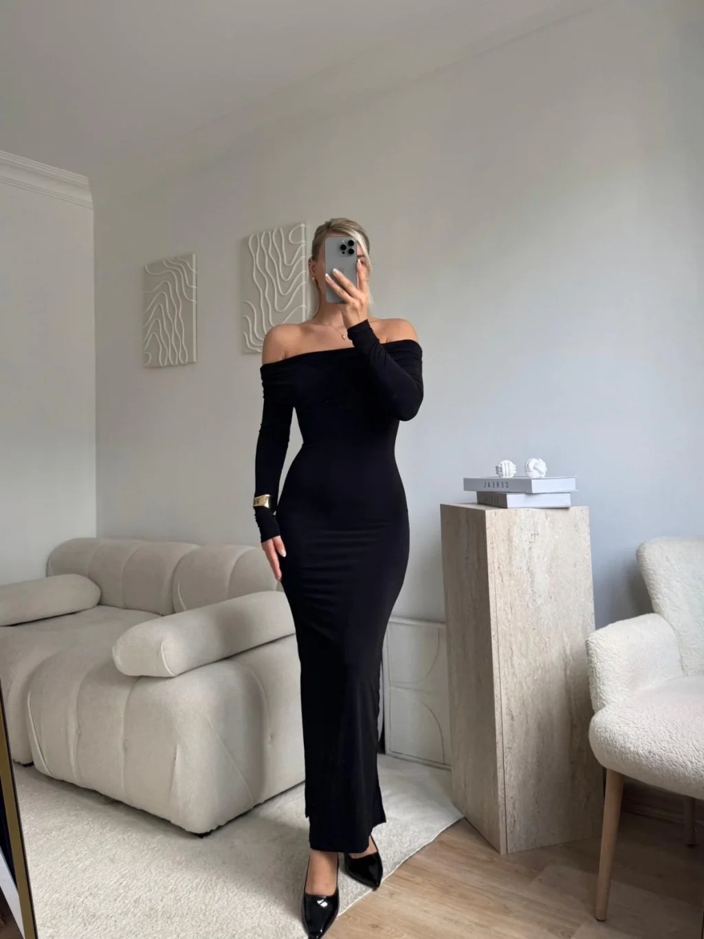 Madonna Yaka Yırtmaçlı Long Elbise - SİYAH