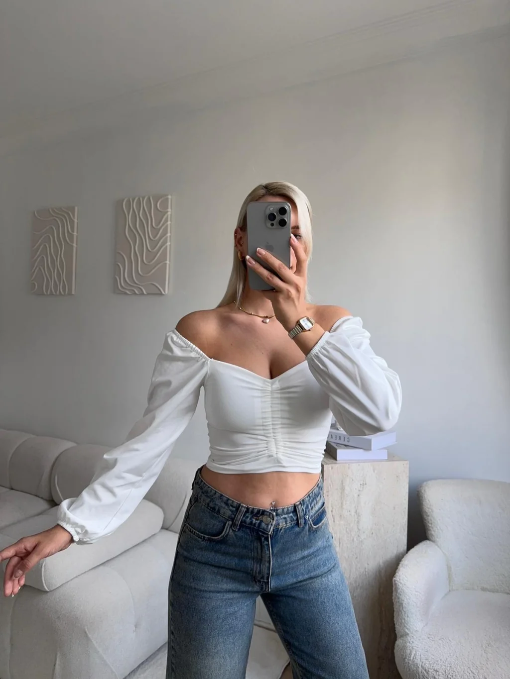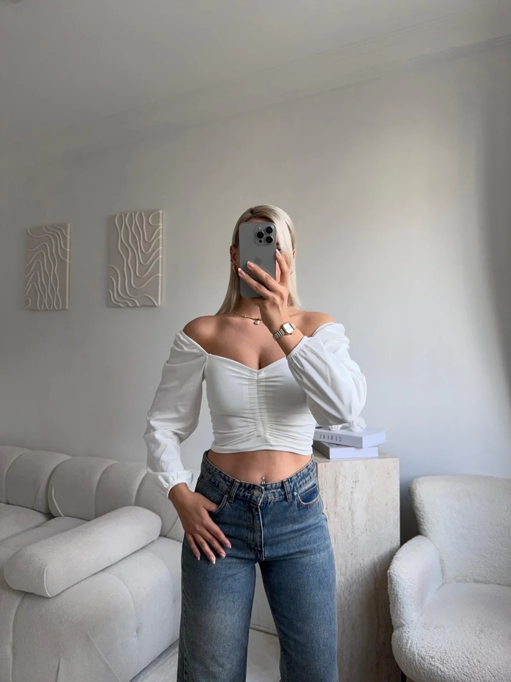 Ön Büzgülü Balon Kol Crop - BEYAZ