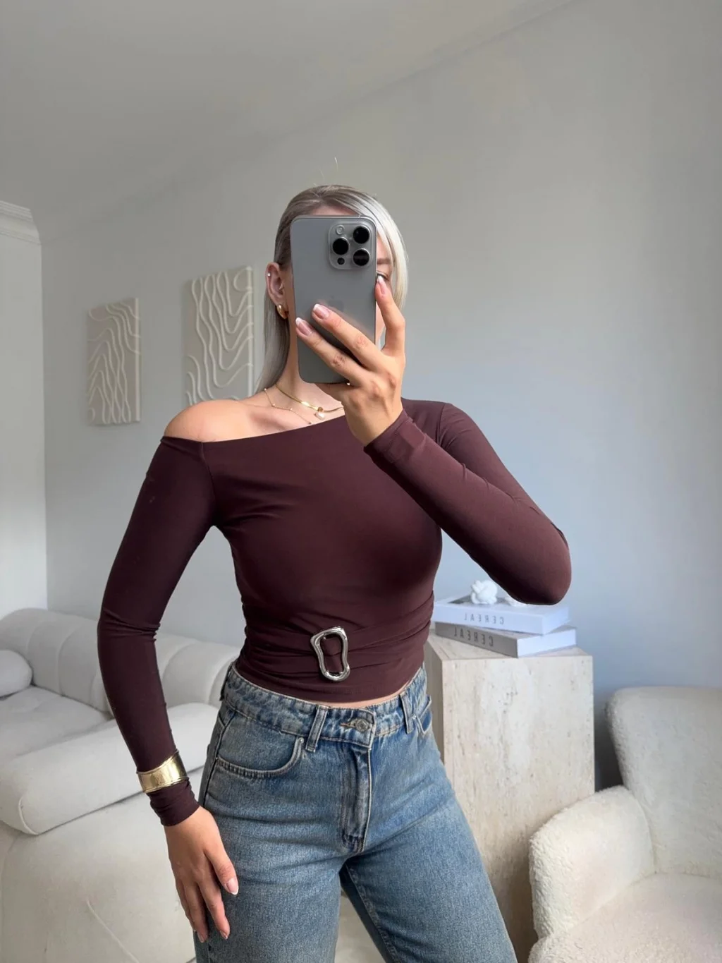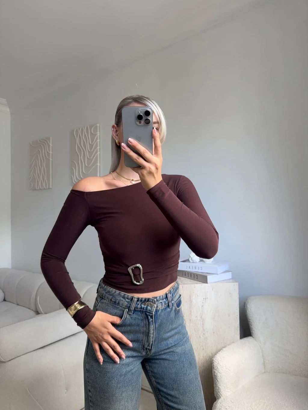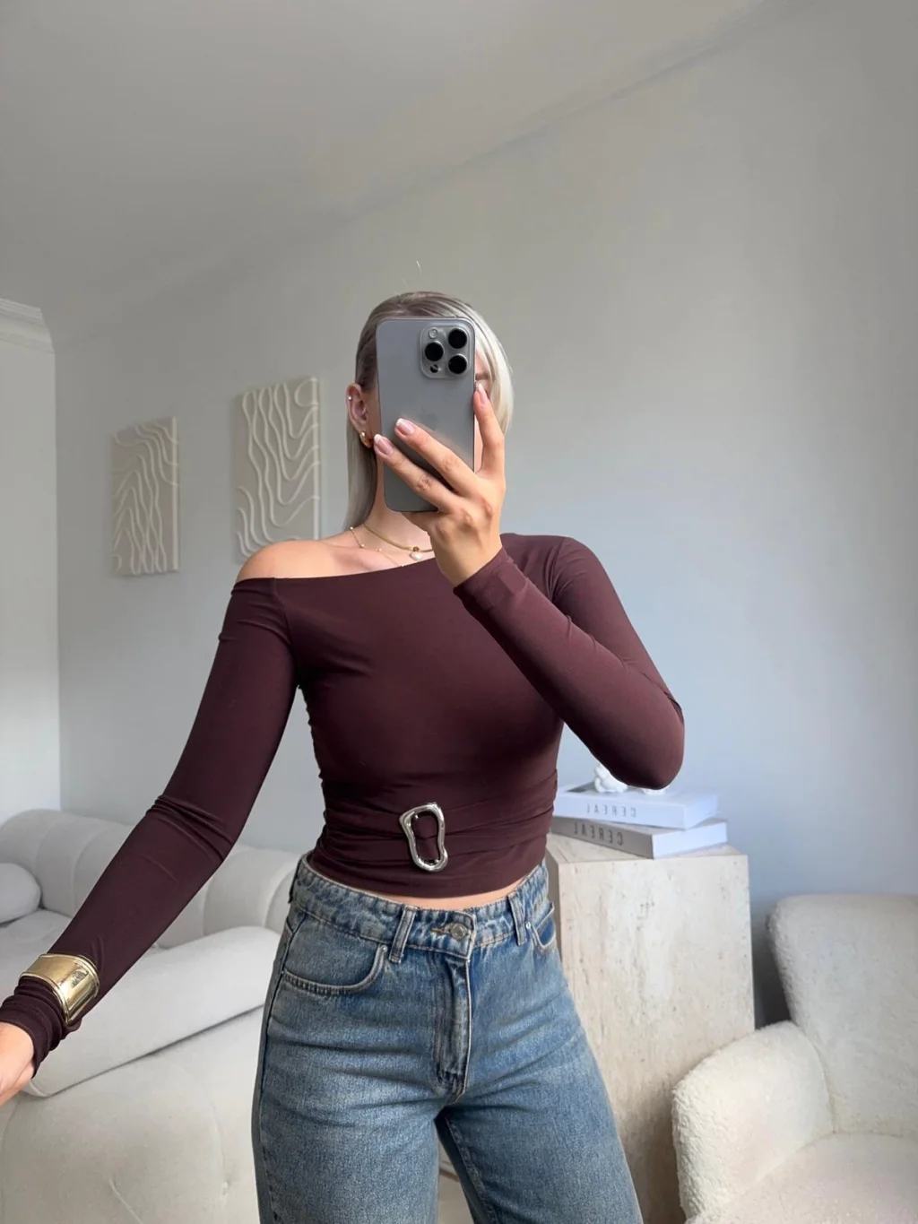 Önü Tokalı Kayık Yaka Crop - KAHVE