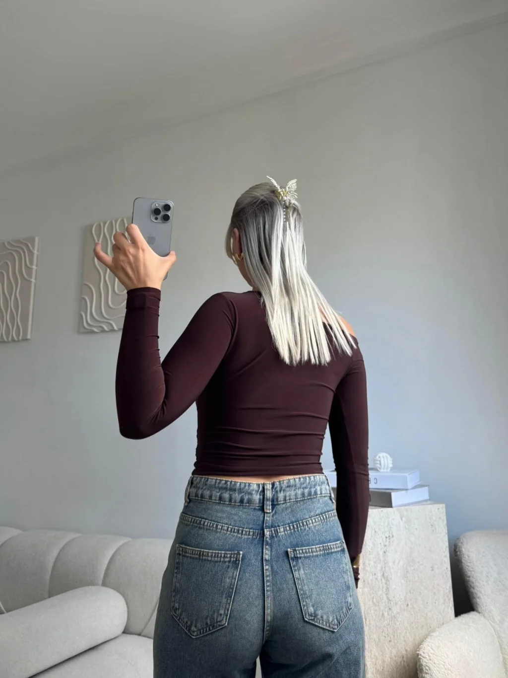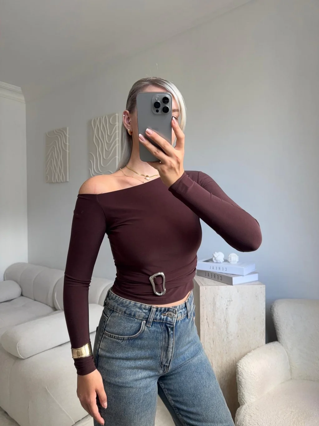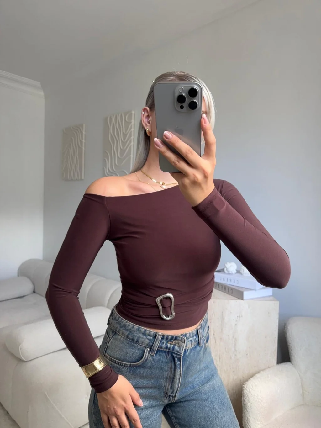 Önü Tokalı Kayık Yaka Crop - KAHVE