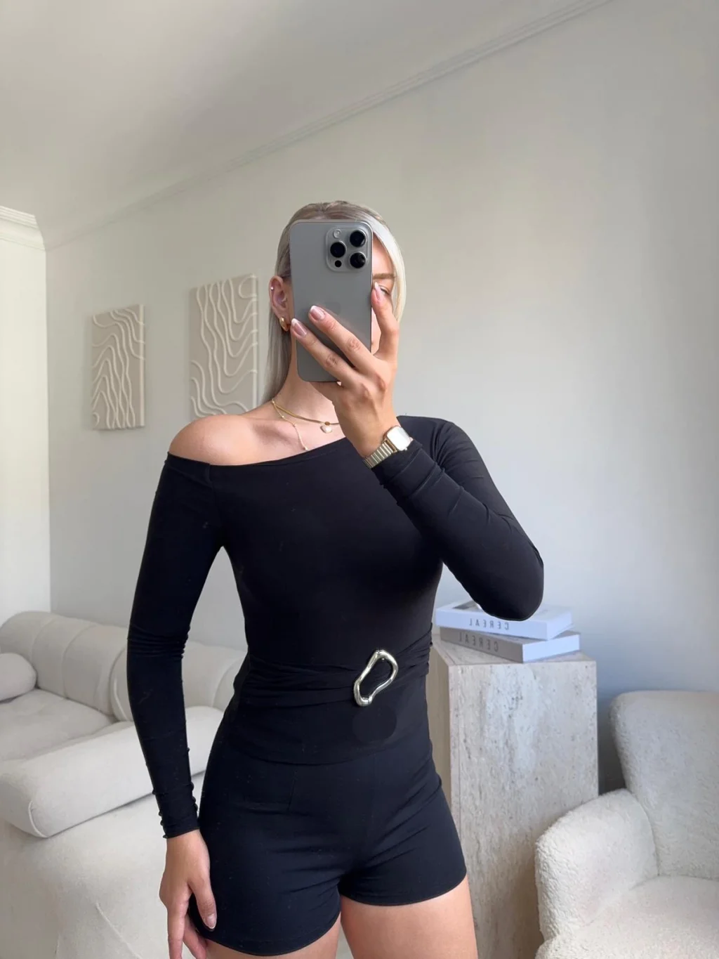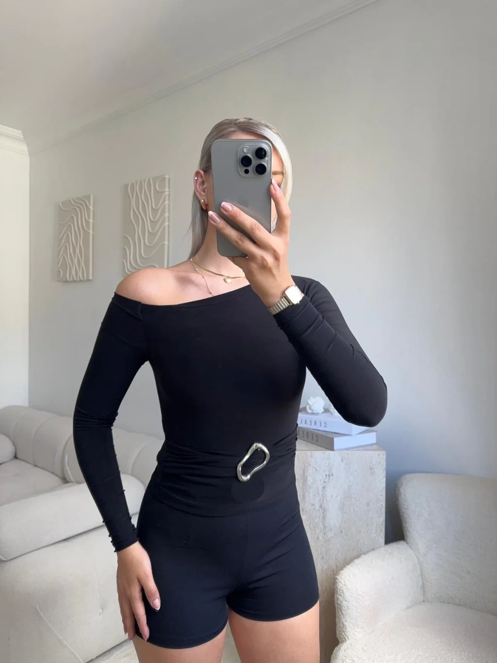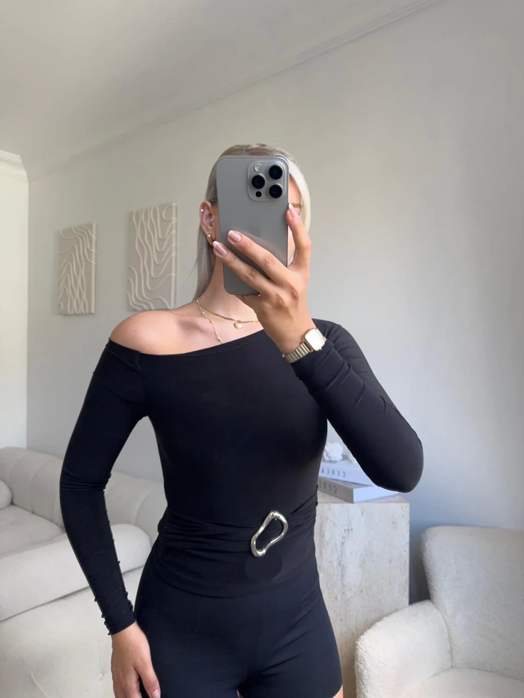 Önü Tokalı Kayık Yaka Crop - SİYAH