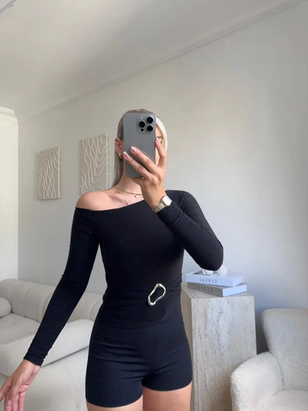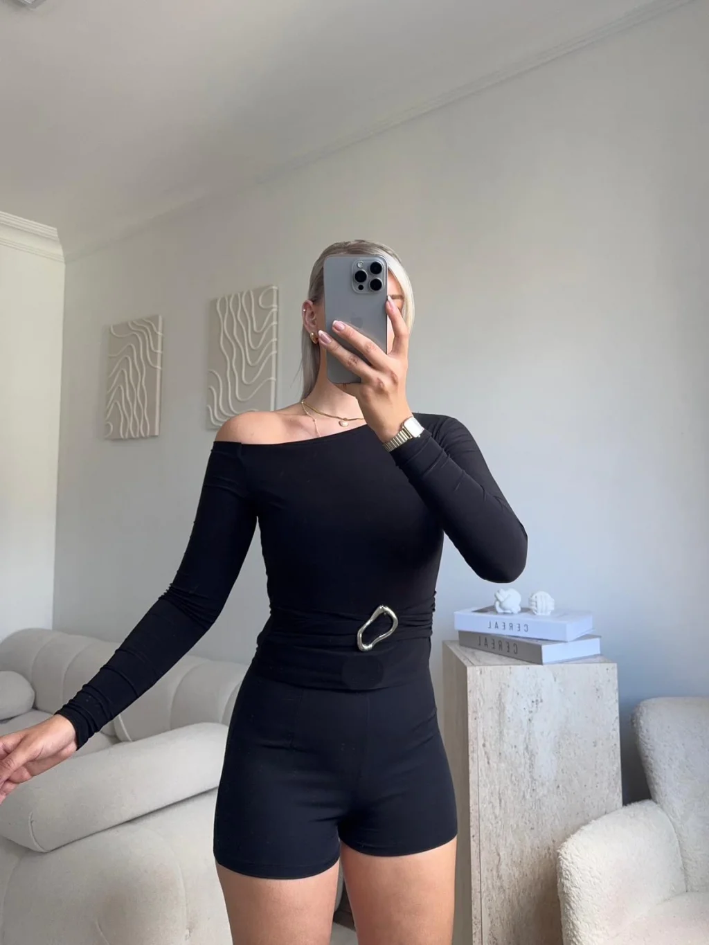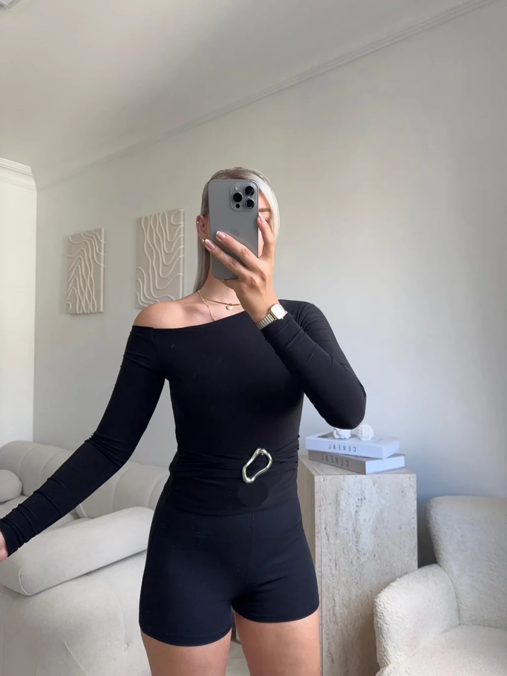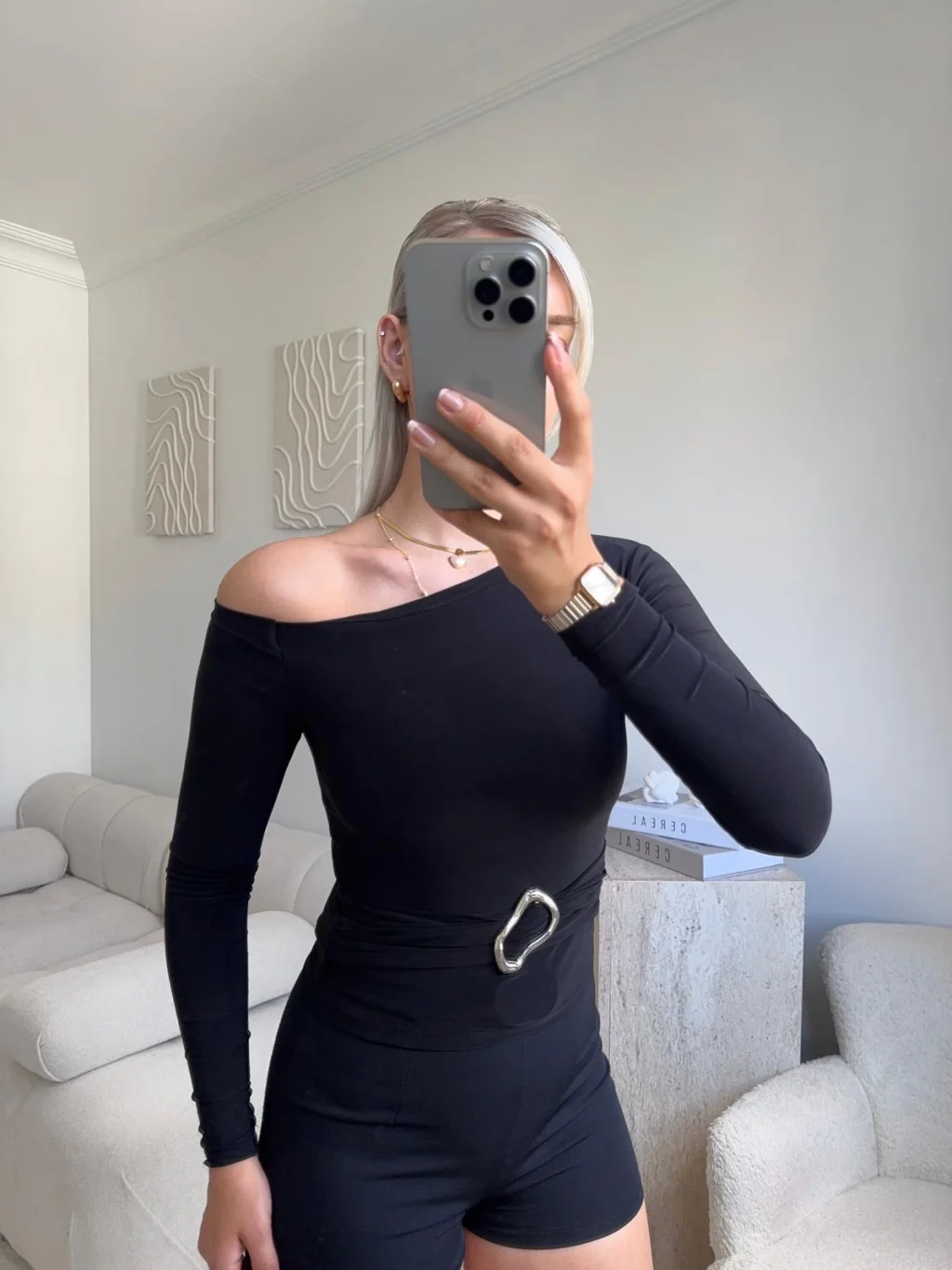 Önü Tokalı Kayık Yaka Crop - SİYAH