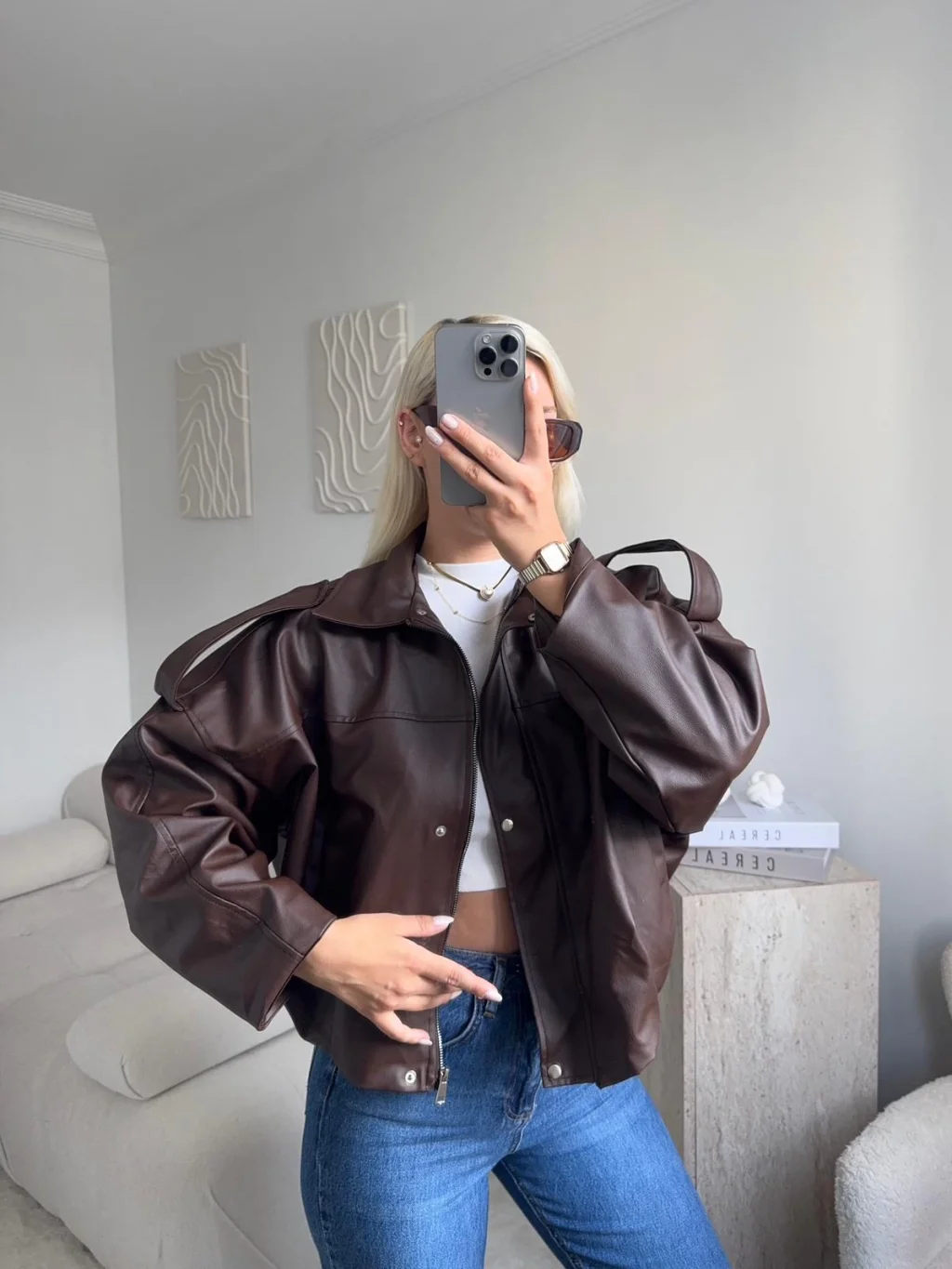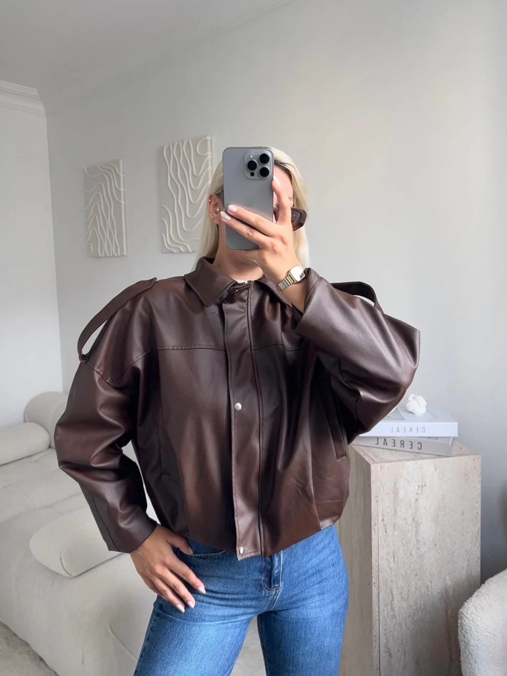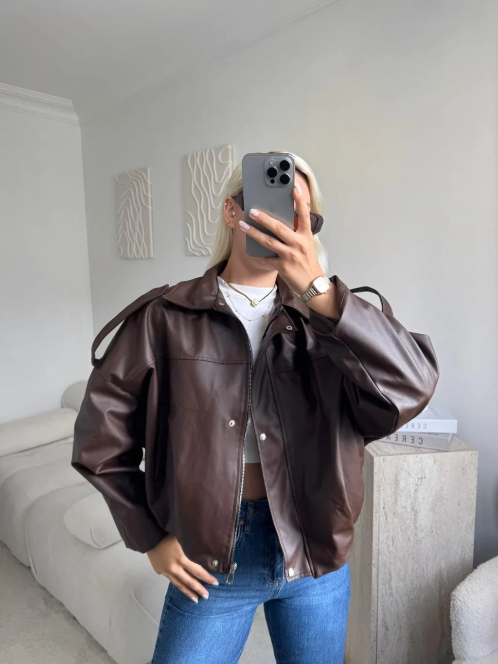 Oversize Bel Lastik Deri Ceket - KAHVE