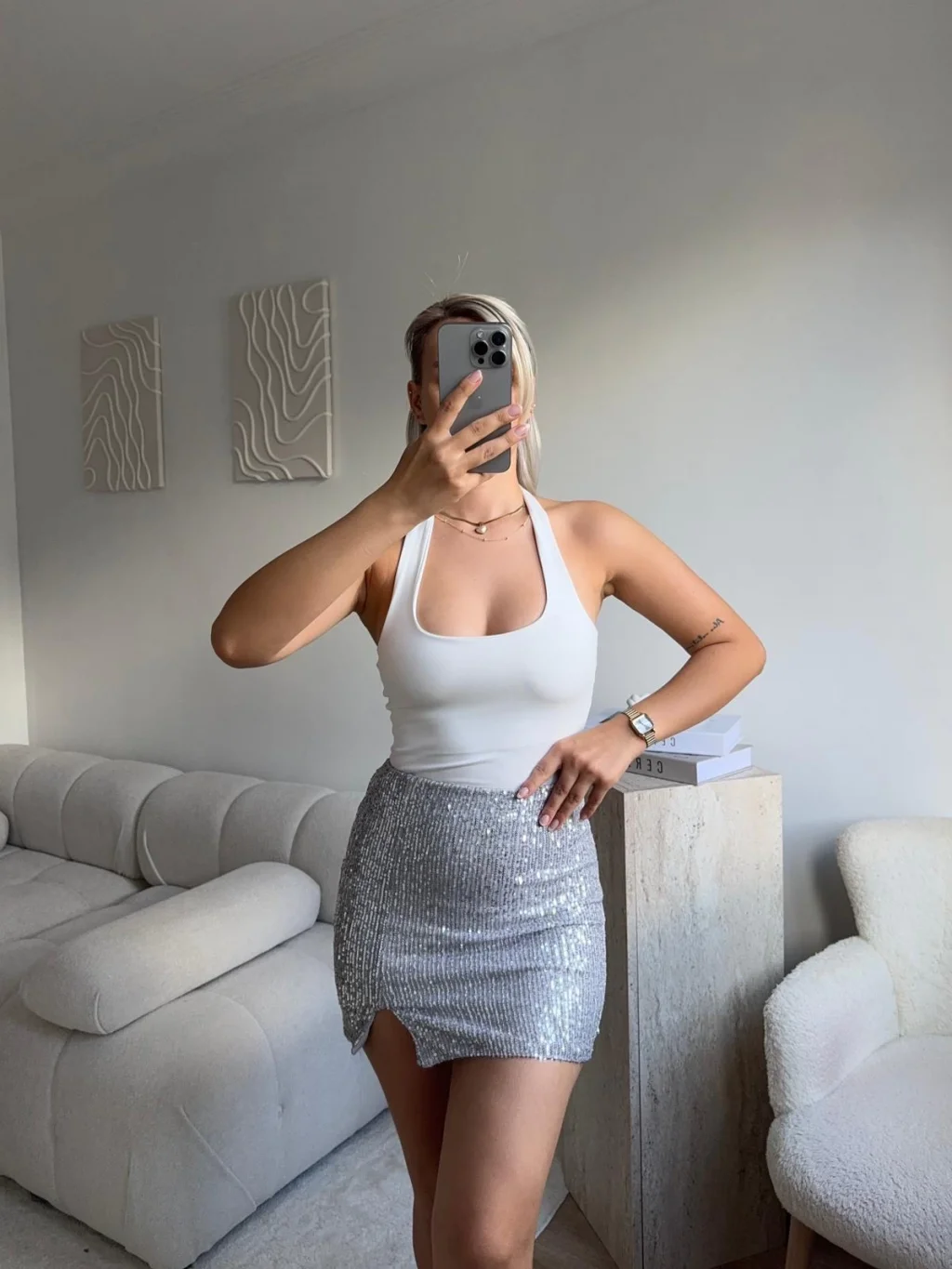 Pul Payetli Yırtmaçlı Mini Etek - GÜMÜŞ