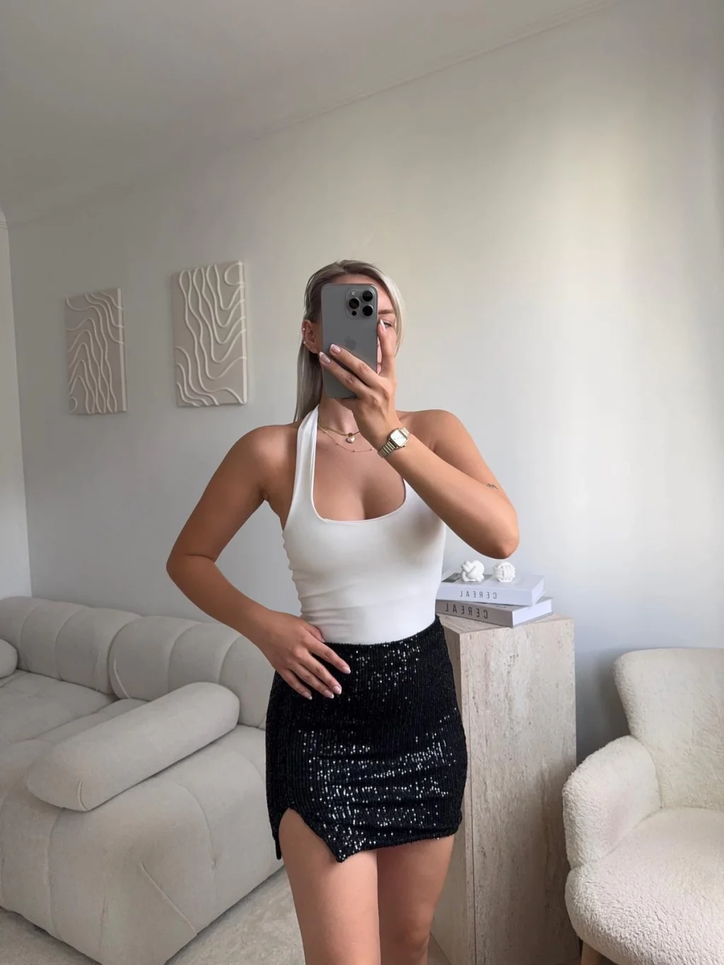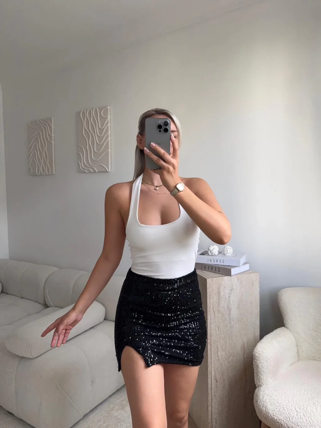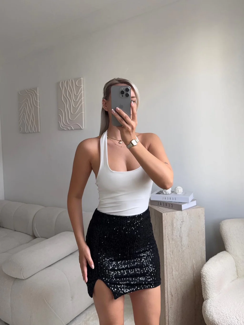 Pul Payetli Yırtmaçlı Mini Etek - SİYAH