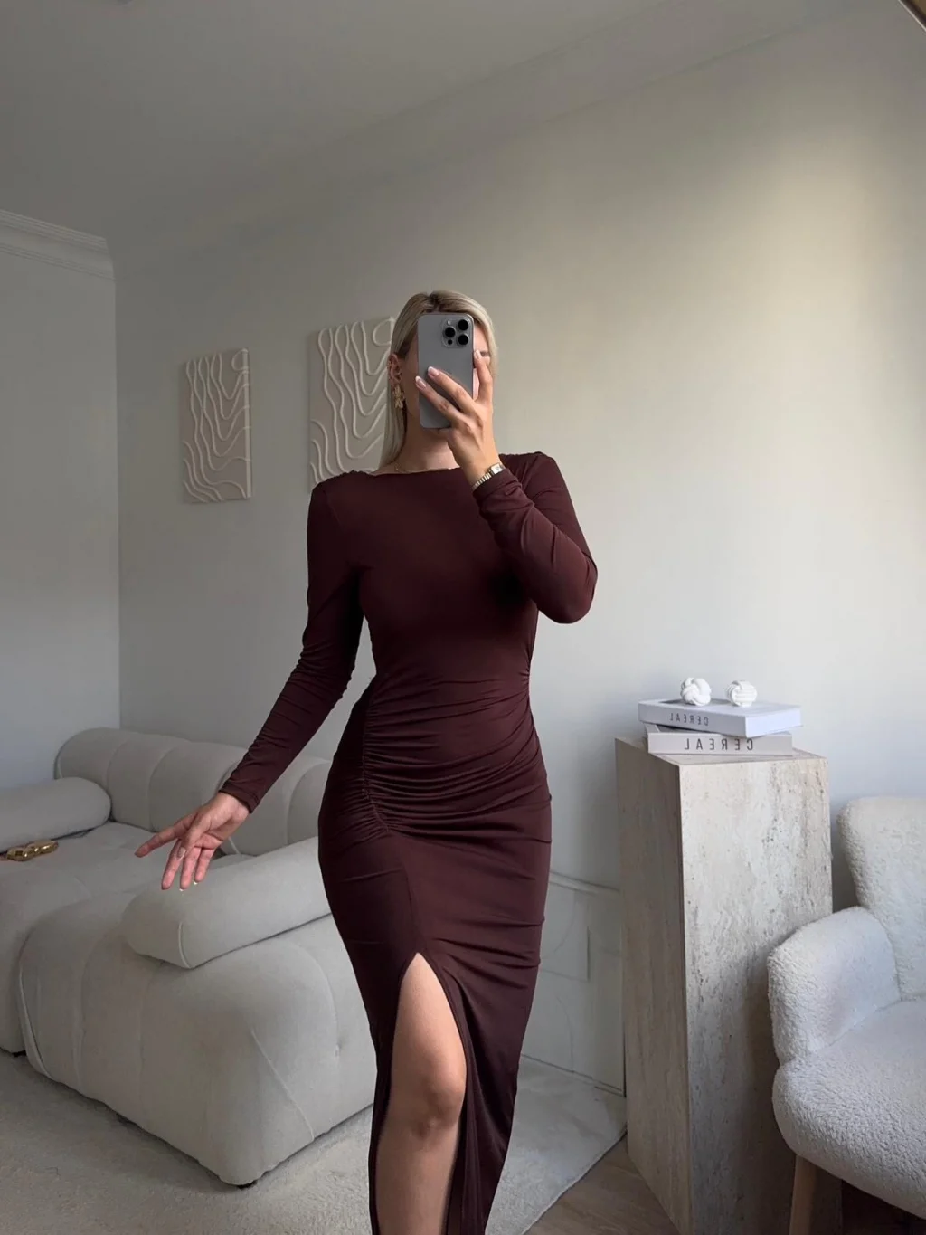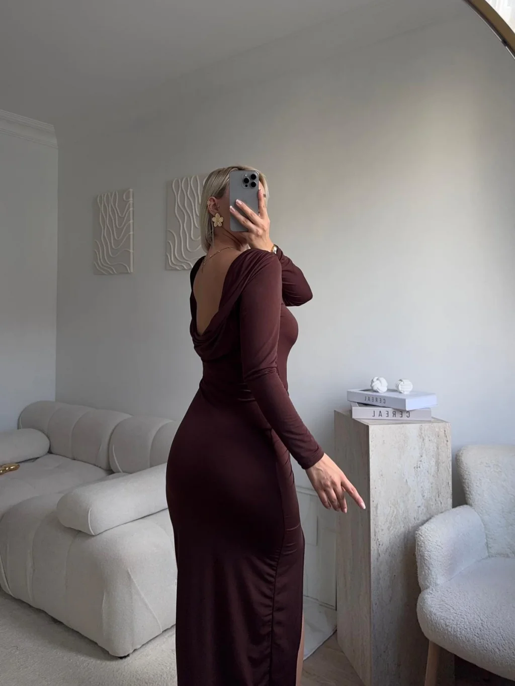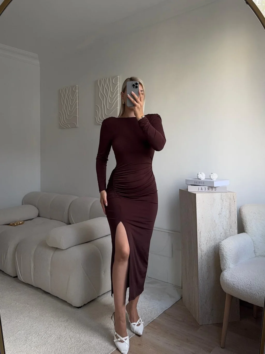 Sırt Dekolte Derin Yırtmaç Elbise - KAHVE