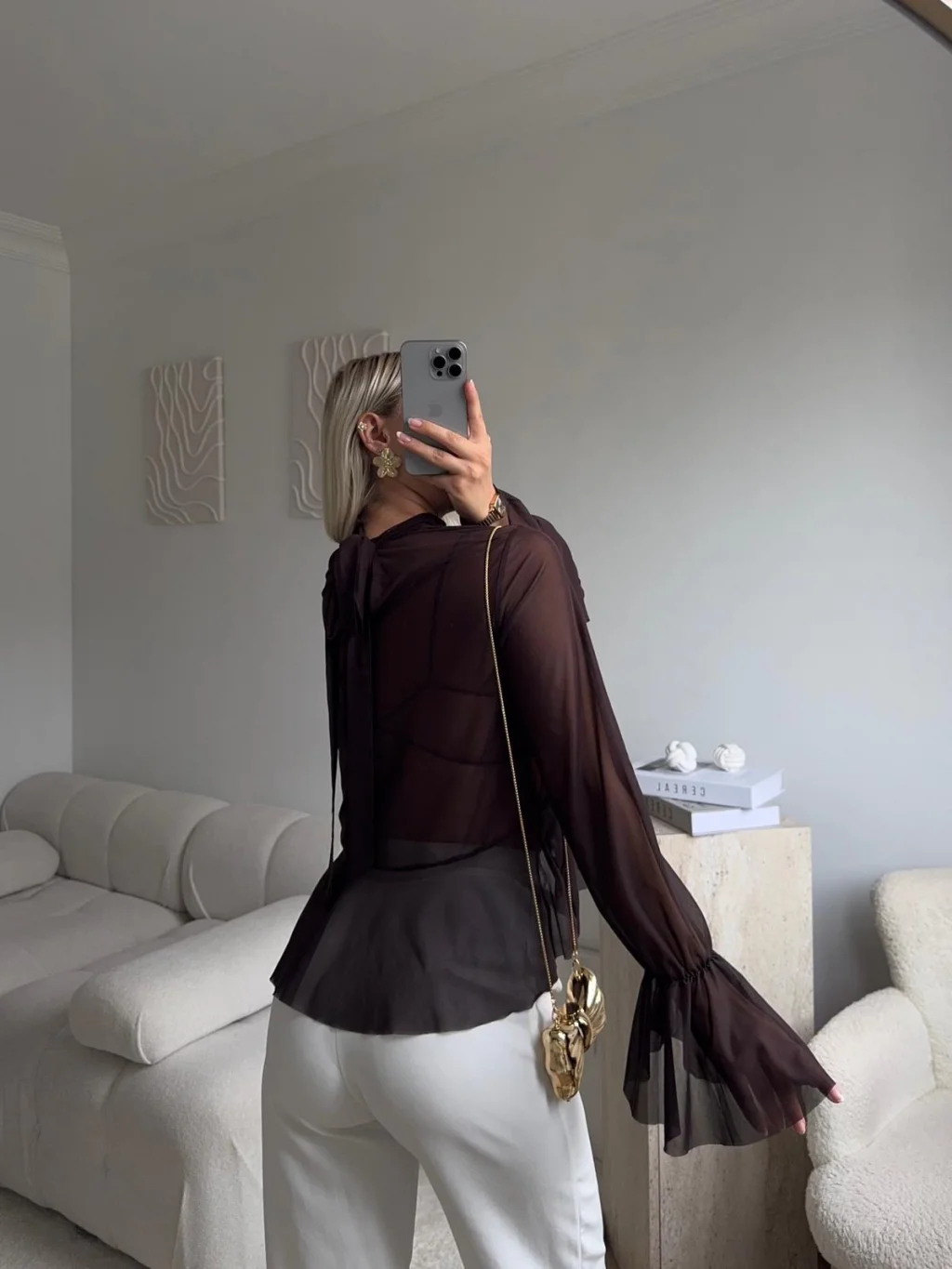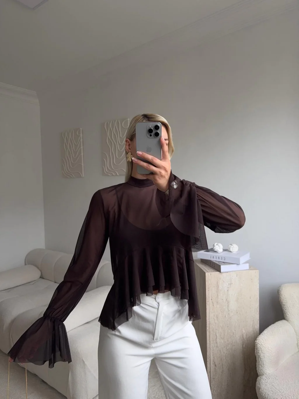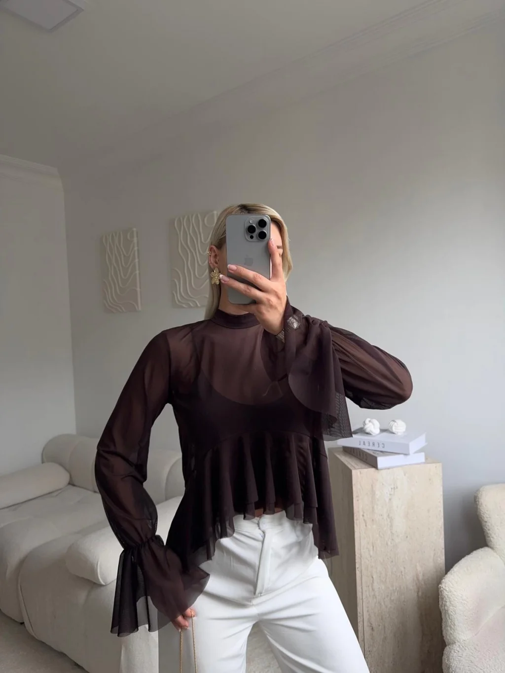 Tül Volanlı Tasarım Bluz - KAHVE