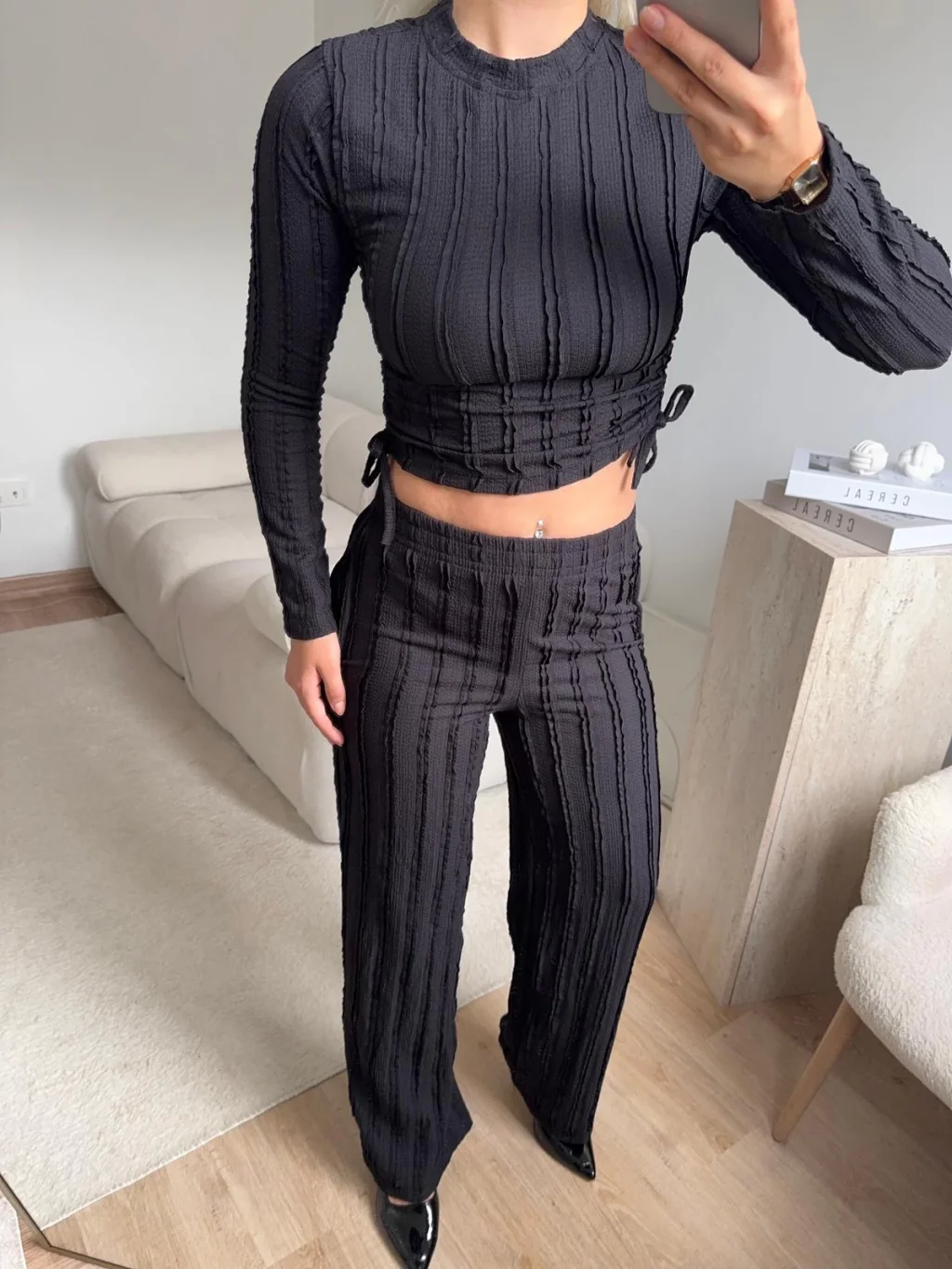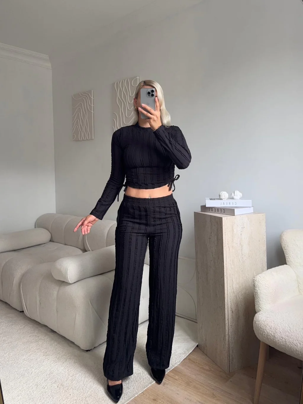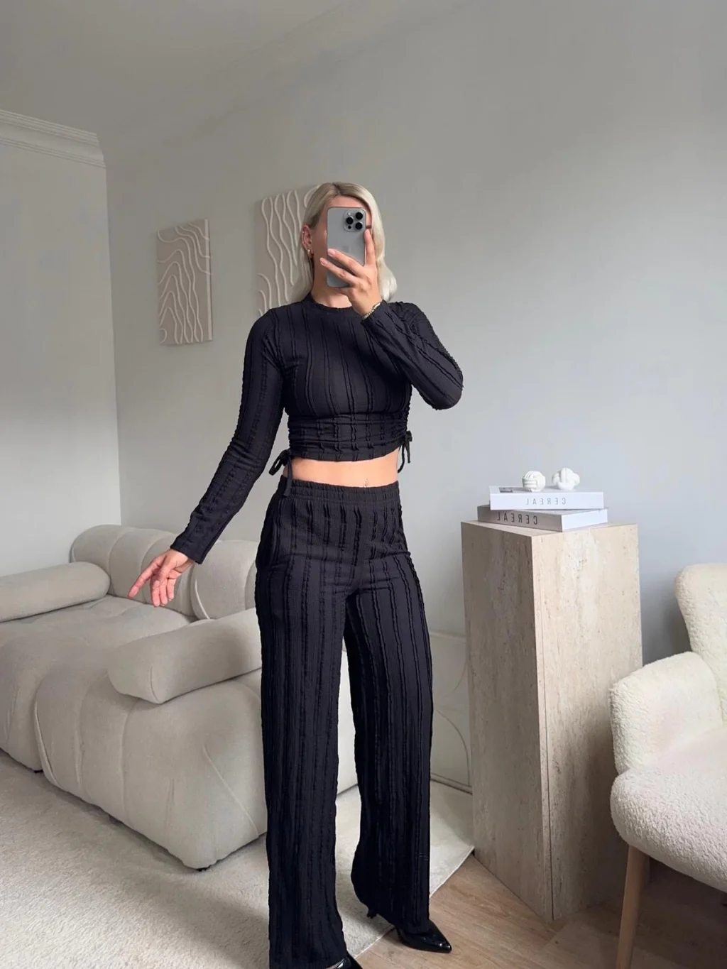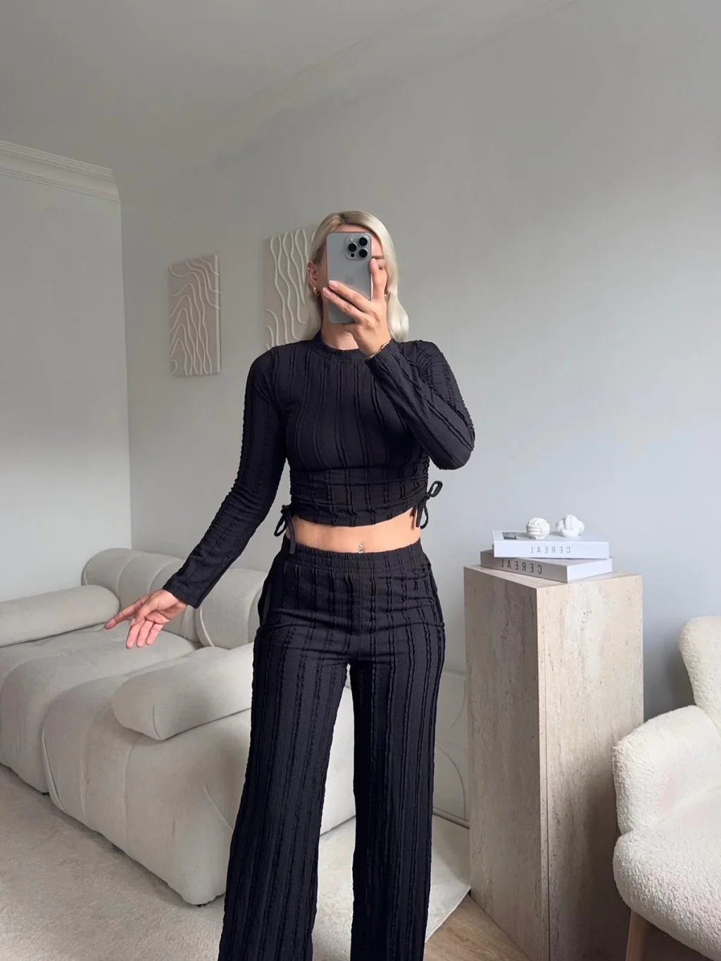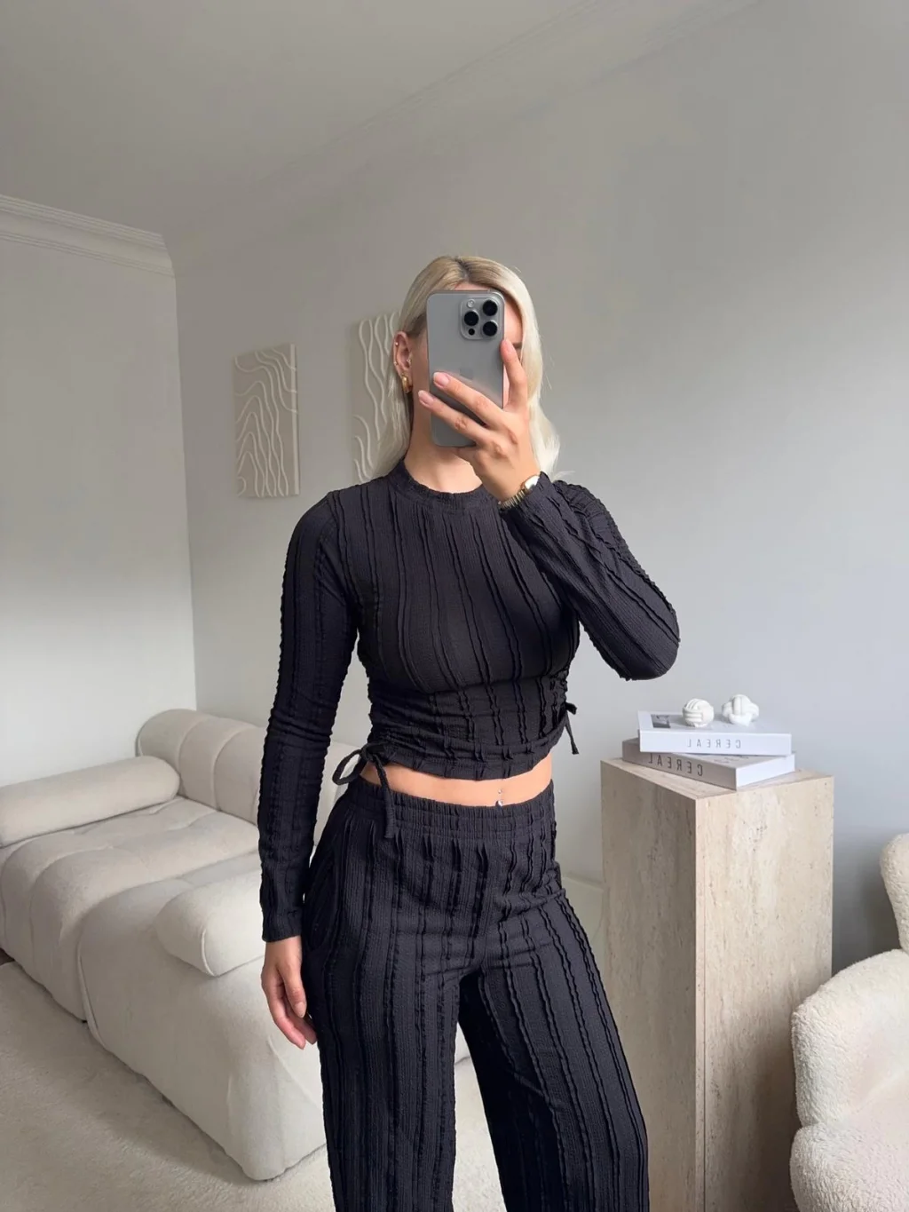 Yan Büzgü Crop & Pantolon Takım - SİYAH