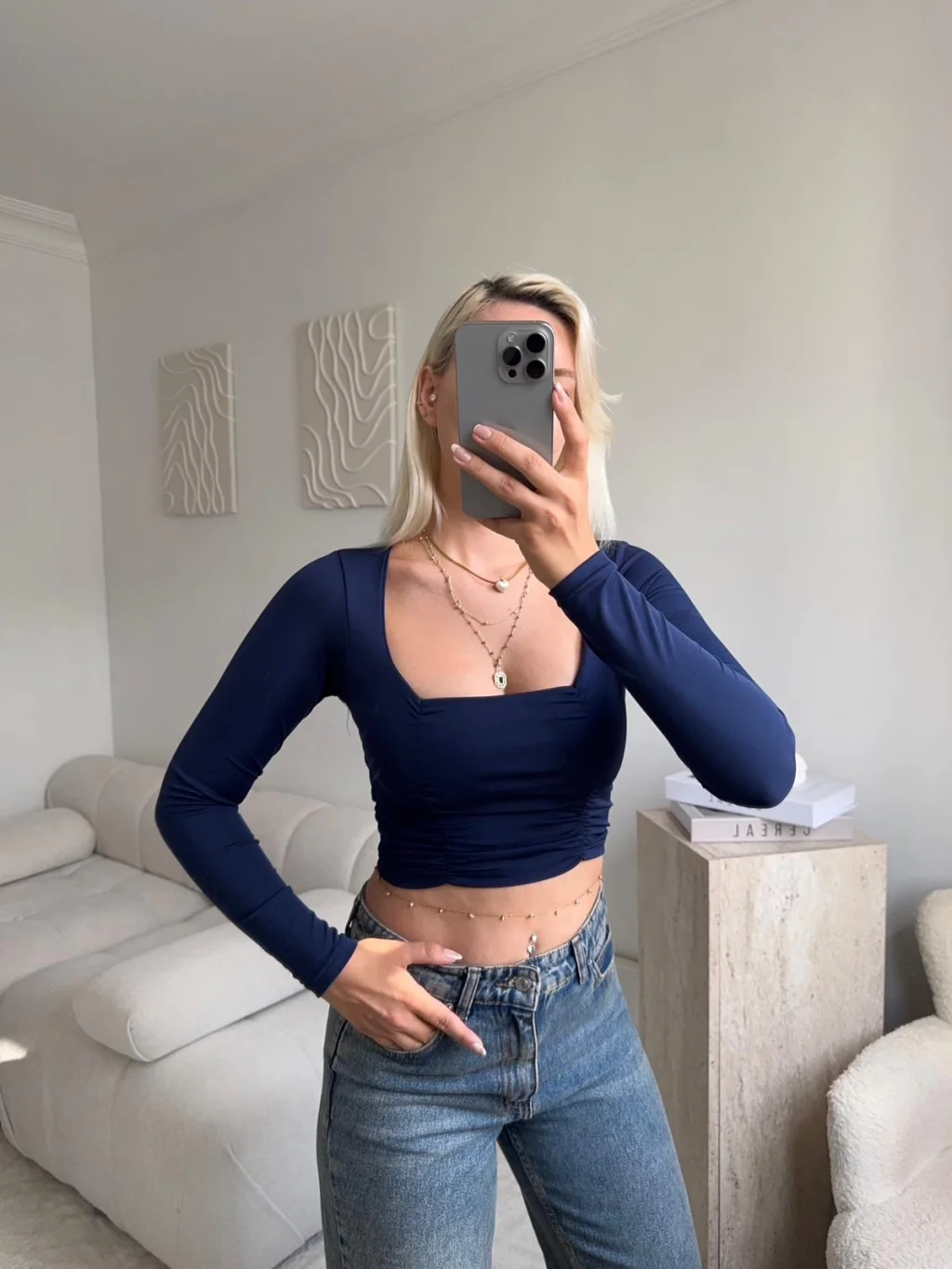 Yan Büzgü Kare Yaka Crop - LACİVERT