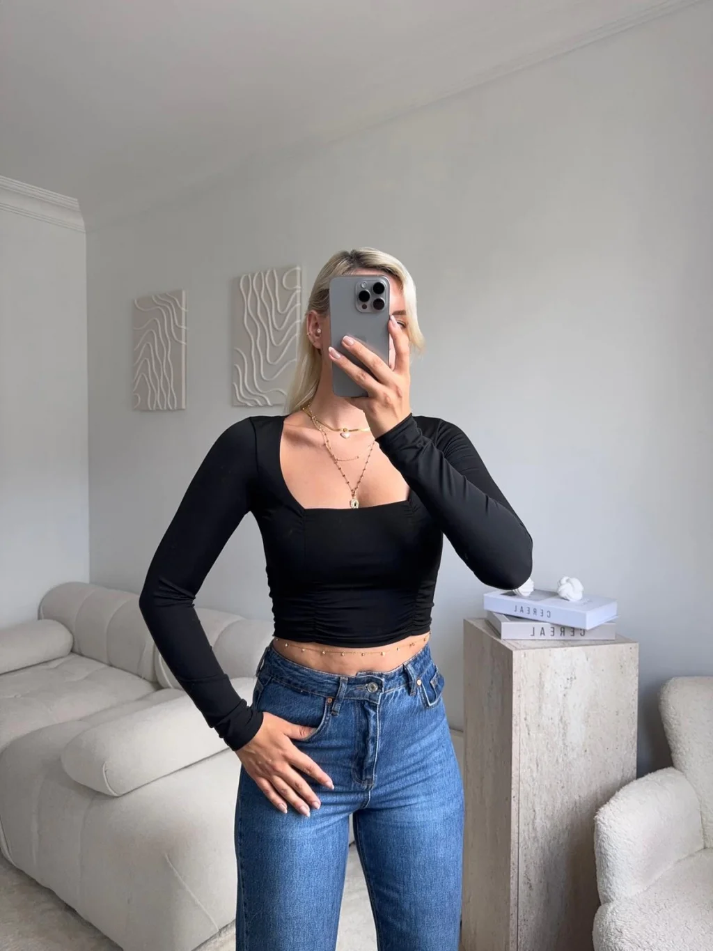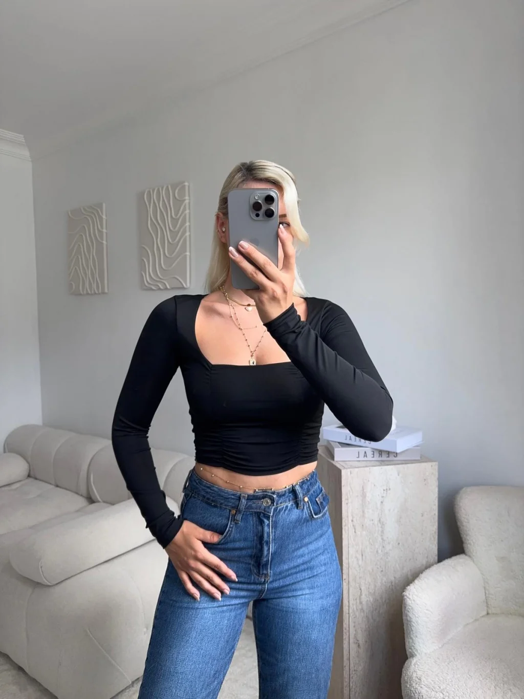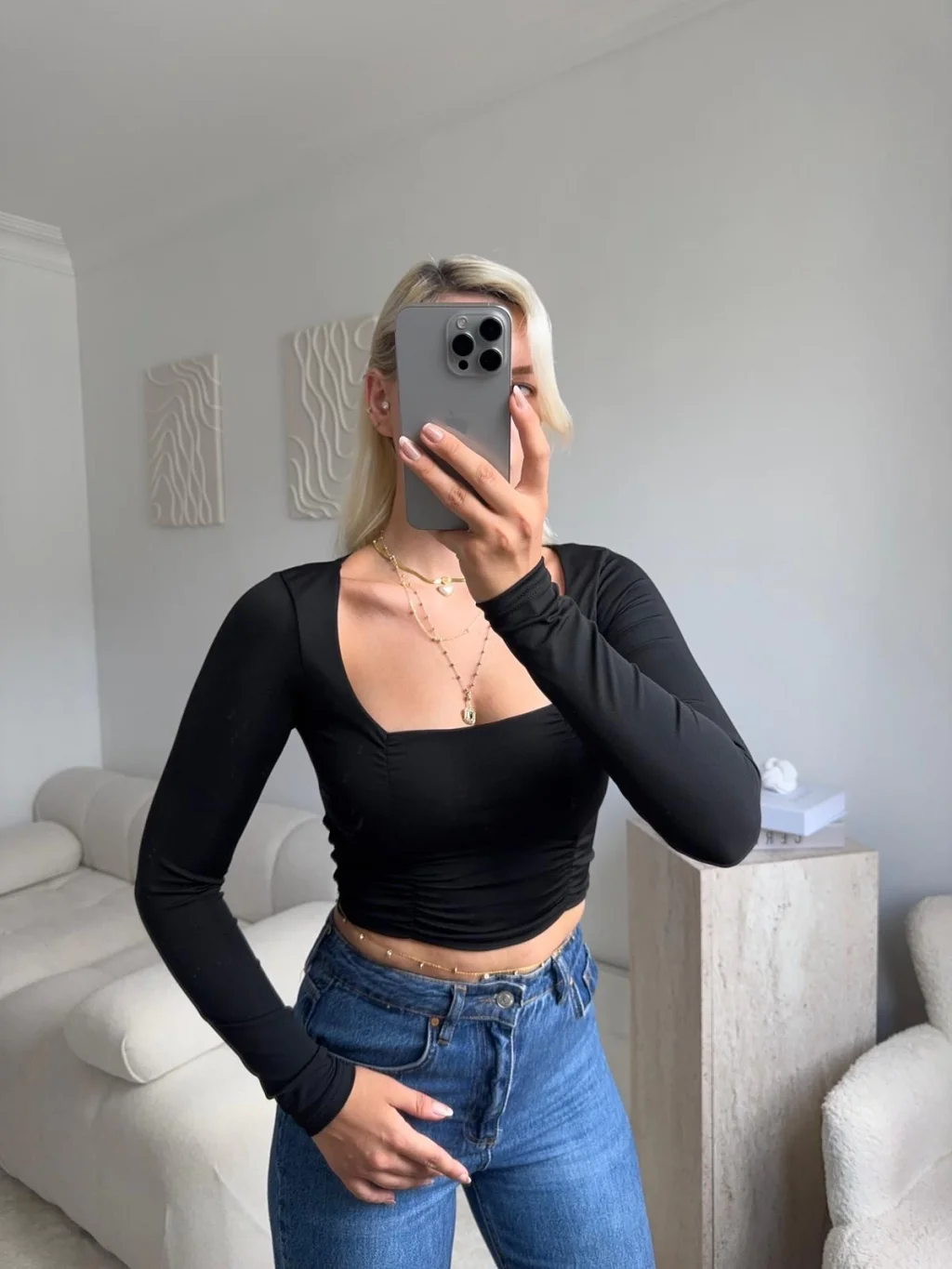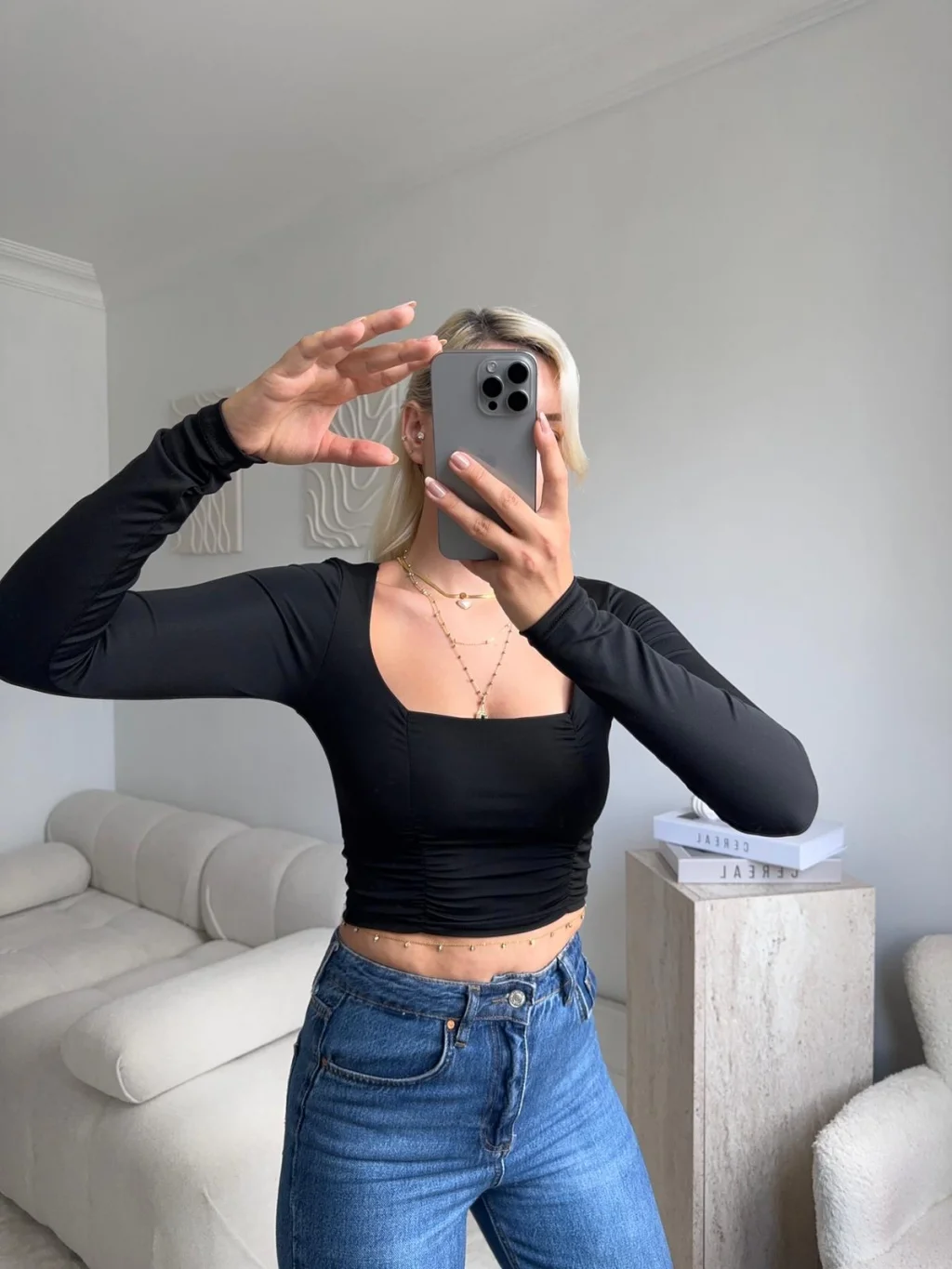 Yan Büzgü Kare Yaka Crop - SİYAH